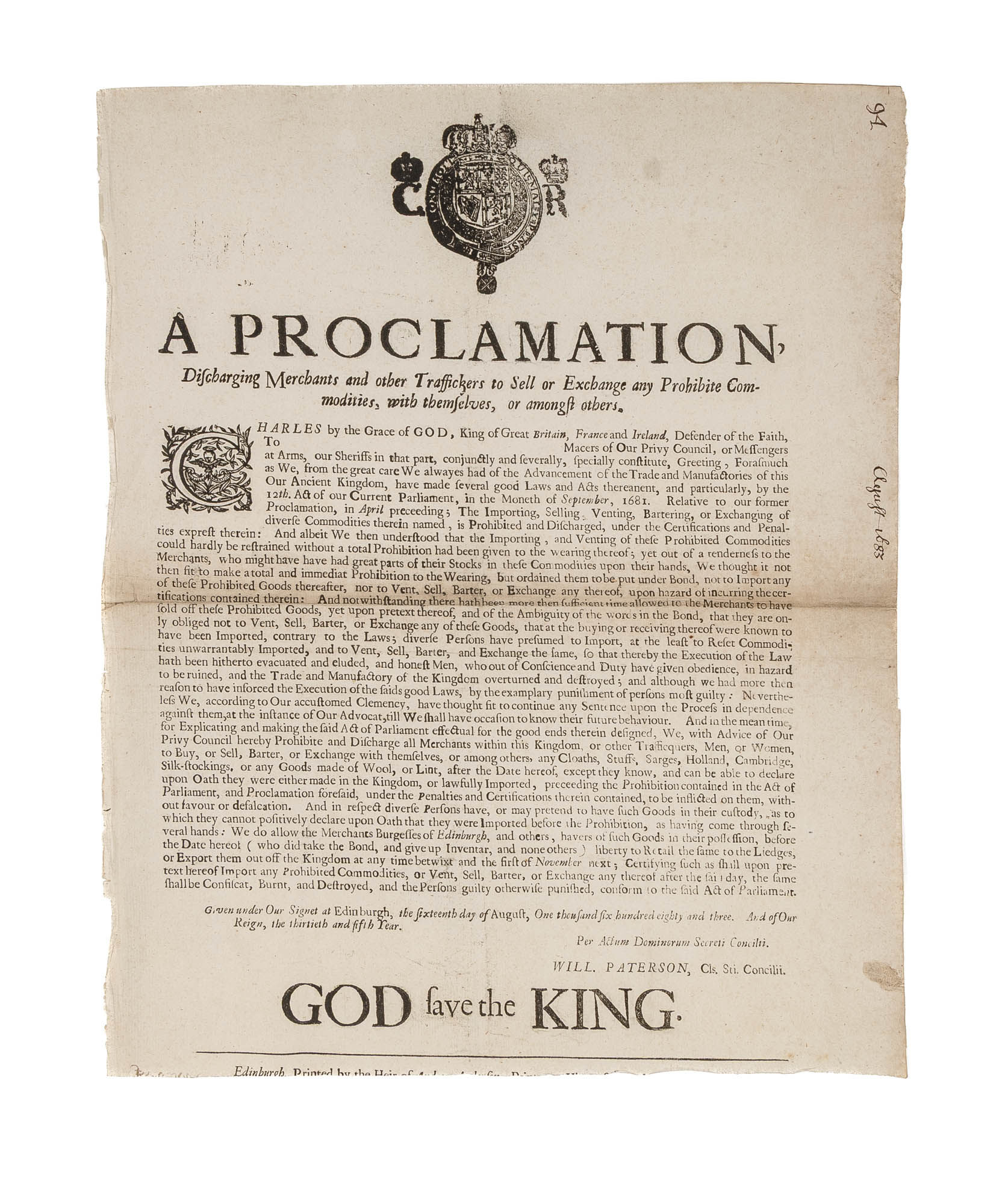 1635. Edinburgh, 1683. 13-1/2" x 11.. Edinburgh, 1683. 13-1/2" x 11." Rare Broadside Recording a Proclamation of Charles II Enacted to Protect the Textile Industry [Broadside]. Charles I [1600-1649], King of England. A Proclamation Discharging Merchants and Other Traffickers to Sell or Exchange any Prohibite Commodities, With Themselves, Or Amongst Others. Edinburgh: Printed by the Heir of [Andrew Anderson, Printer to His Most Sacred Majesty, 1683]. 13-1/2" x 11" (34.3 x 28 cm) broadside removed from volume with loss of most of imprint statement at foot, text in single column below headline and large woodcut royal arms, eight-line woodcut initial. Moderate toning, lightly soiled horizontal fold line through center, some edgewear along left margin, "94" and "August 1683" in early hand along right margin. $750. * Only edition, one of two issues, the other published in London. Intended to support domestic textile production, this broadside was sent to sheriffs and other law enforcement officials throughout Scotland. (The salutation line in our copy is blank.) An act from September 1681 and a proclamation from the year before prohibited the importation and sale of certain fabrics. However, it permitted merchants to sell any imported stock that remained. By 1683 sufficient time had elapsed to liquidate this stock, but it was apparent that many were continuing to import textiles in violation the law. The present broadside decrees that merchants cannot buy or sell any "Cloaths, Stuff, Sarges [serges], Holland, Cambridge, Silk-stockings, or any Goods made of Wool, or Lint" unless they can prove they were either made in the kingdom or lawfully imported before the prohibition. As for any remaining imported stock, permission is granted to the Merchants Burgesses of Edinburgh to sell it until November 1. Afterwards, it will be "Confiscat, Burnt, and Destroyed, and the Persons guilty otherwise punished." Both issues of this broadside are rare. OCLC, Steele and the English Short Title Catalogue locate four copies of ours (National Archives of Scotland, National Library of Scotland, Harvard Business School, two copies). Steele, A Bibliography of Royal Proclamations of the Tudor and Stuart Sovereigns III:2552. English Short-Title Catalogue R183441.