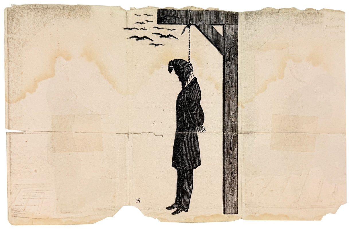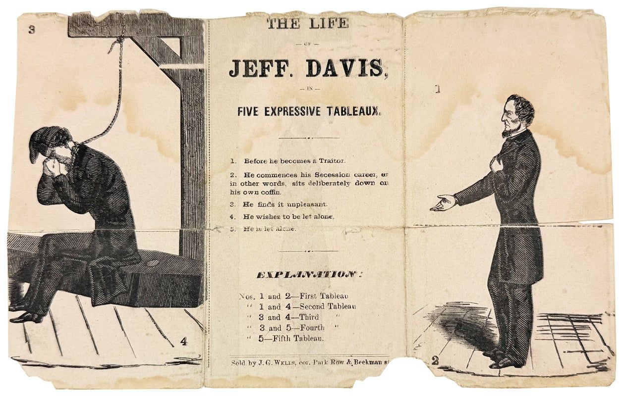The "five expressive tableaux" illustrate the consequences of Jefferson Davis's decision to secede, ending with his imagined execution. An intriguing if macabre movable book, likely published around the time of Davis' arrest by Union forces on May 10, 1865. No copies in retail at time of this writing; only three copies in OCLC match this imprint, at the AAS, Boston U., and Duke. .