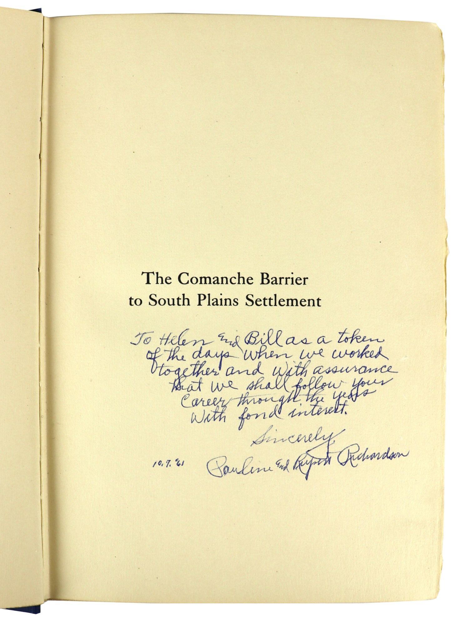Glendale, CA: The Arthur W. Clark Company, 1933. Very Good +/Very Good -. Glendale, CA: The Arthur W. Clark Company, 1933. First Edition. Signed by Pauline and Rupert Richardson at half title with inscription to a Helen and Bill. Octavo. 424pp. + advertisements. Black and white photographs and illustrations including frontispiece with tissue guard, complete. Plain cream dust jacket. Blue cloth boards with spine stamped in gilt. Dust jacket quite chipped with several tears. Corners bumped; light shelfwear; binding sound and pages unmarked; Very Good. Scarce signed.