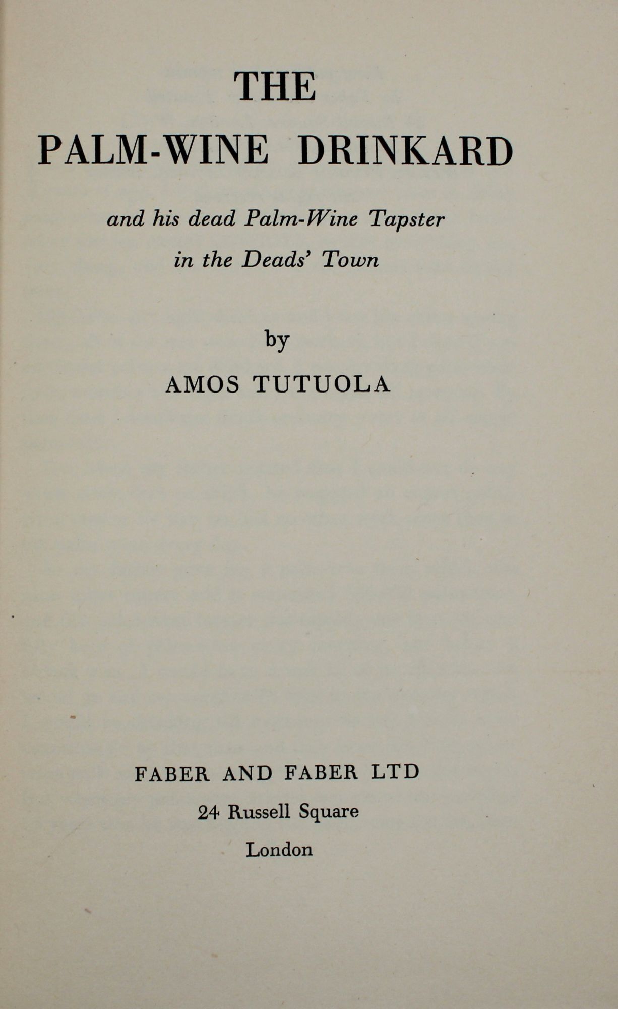 London: Faber and Faber, 1952. First edition. 125 pp. 1 vols. 8vo. Orange cloth. Fine copy in fine bright dust jacket by Barnett Freedman (tiny traces of rubbing at head and foot of spine panel). First edition. 125 pp. 1 vols. 8vo. “When I saw that there was no palm-wine for me again, and nobody could tap it for me . . . . One fine morning I took all my native juju and also my father’s juju with me and I left my father’s home-town to find out whereabouts was my tapster who had died.”