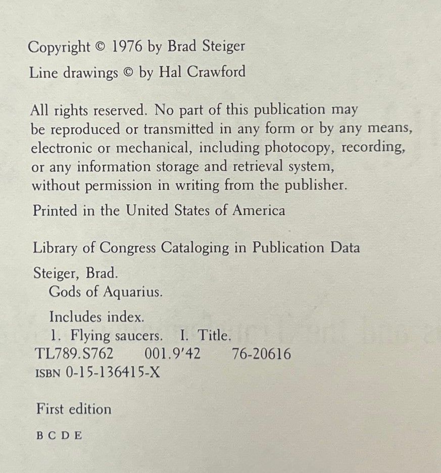 New York: Harcourt Brace Jovanovich, 1976. First Edition. Hardcover. Near Fine/Very Good. Near Fine in a Very Good jacket, unclipped ($8.95), toned and creased at the flaps, bumped at the edges. Green paper on the boards, lightly rubbed at the bottom edge. Square and firmly bound, a few spots of foxing at the edges, clean internally. Steiger's work that argues for the existence of extraterrestrial beings visting Earth to teach humanity basic truths and push along evolution. From the collection of ufologist Tom Benson. [Rasmussen 934].