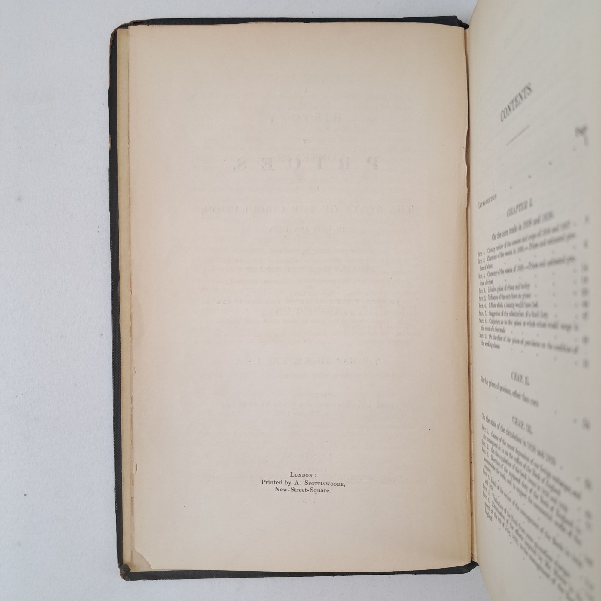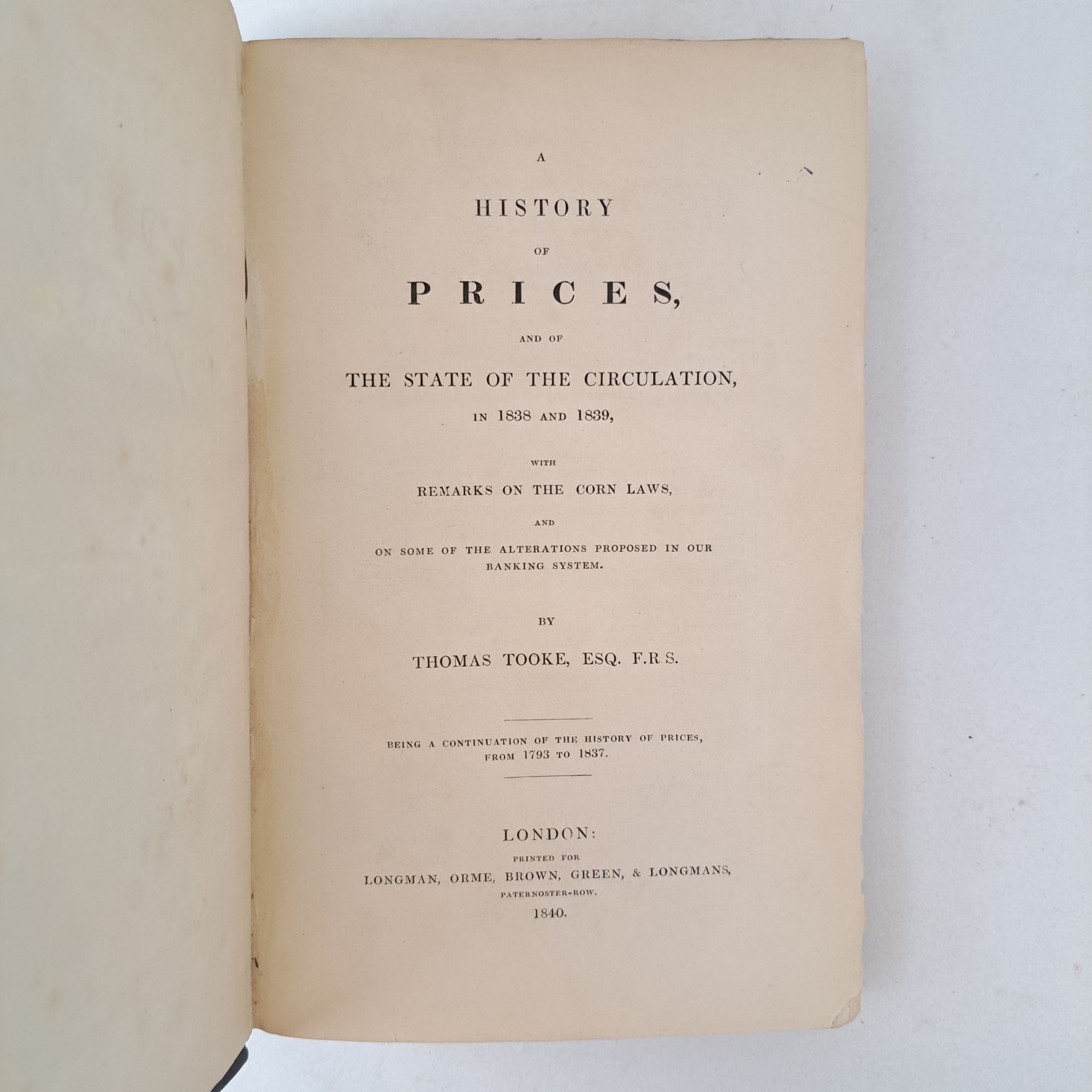 London: Longman, Orme, Brown, Green & Longmans, 1840. First Edition. Hardcover. Octavo, iv, 298, 32 pages. In Good condition. Rebacked in black cloth, with a portion of the original spine affixed. Boards and spine have blind tooling, moderate bumping to fore corners, light denting and chipping to edges resulting in exposed boards, residual label to front board, and mild rubbing wear. Textblock has an ex-libris bookplate to the front pastedown, archival repair to hinges, ink signature from a previous owner on the front free end page, an ink stamp to the verso of the title page, a tear along the gutter of the title page, pencil marks and annotations on some pages throughout, significant rubbing wear and adhesive residue to rear pastedown, small tears and age toning to edges, and black ink to head edges. Shelved in Room A. This volume is a continuation of the History of Prices from 1793-1837. 1399512. Special Collections.
