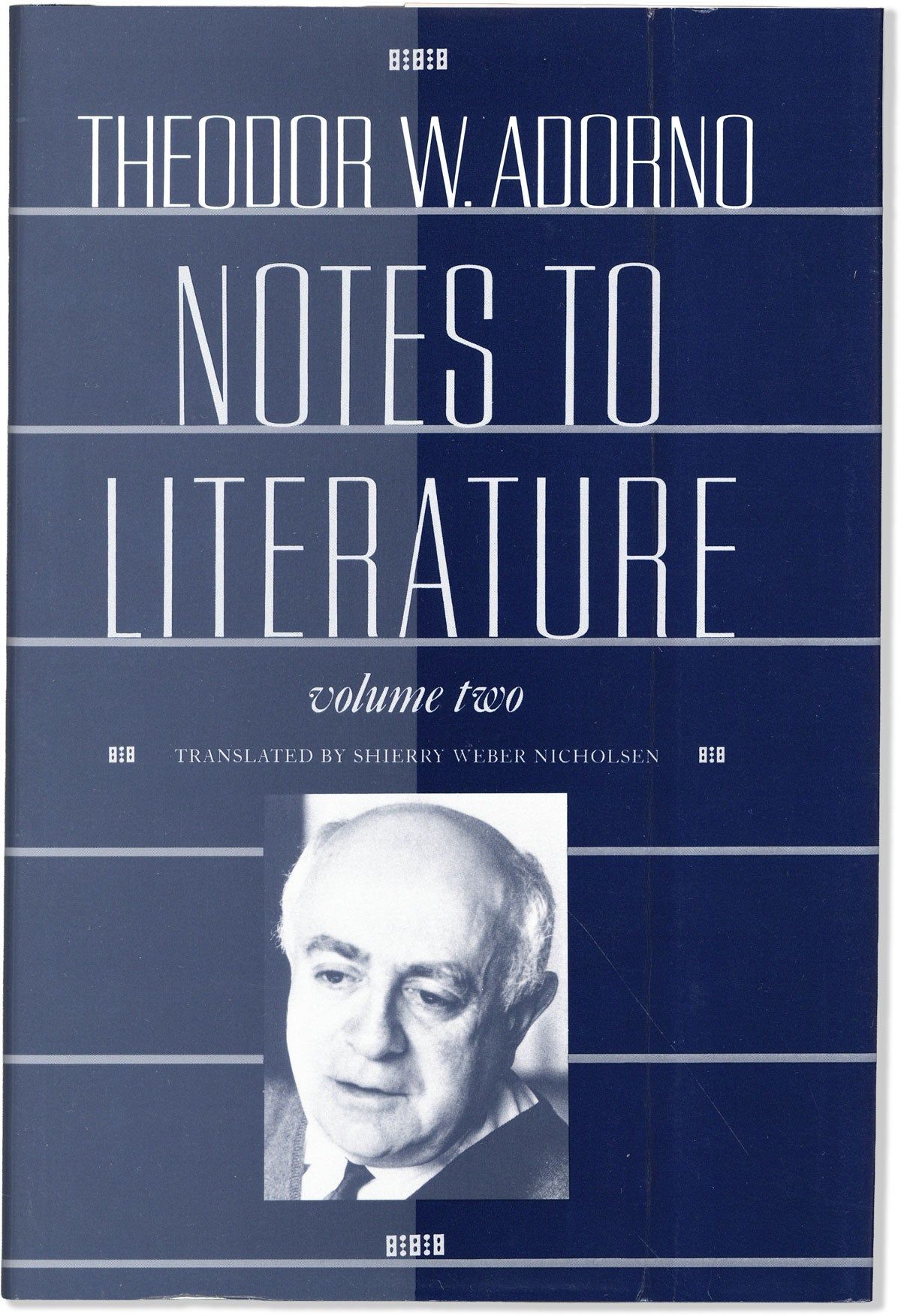 New York: Columbia University Press / European Perspectives, 1992. First English Language Edition. First printing. Octavo; blue cloth hardcover; dustjacket; xx,350pp. Tight, unmarked copy, Fine. In the original dustwrapper, faintly creased on front panel, else fine. Translation of the second part of Noten Zur Literatur (Frankfurt, 1974). From the library of noted poet and translator Nathaniel Tarn, with his printed bookplate inside front cover.