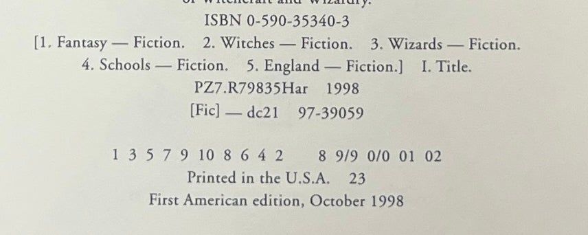 New York: Arthur A. Levine Books / Scholastic Press, 1998. First Edition. Hardcover. Good/Very Good. First printing with the full number line. Illustrated by Mary Grandpre. Signed by Rowling on the half-title page. Good in a Very Good first-issue jacket, unclipped ($16.95), bumped at the edges. Quarter red cloth with purple patterned paper on the boards, bumped at the corners, rubbed at the edges. Bound with a forward lean and some reading wear, stains at the edges, a half-moon stain at the far edge of the first thirty pages. The first US printing of the first book in Rowling's best-selling series.