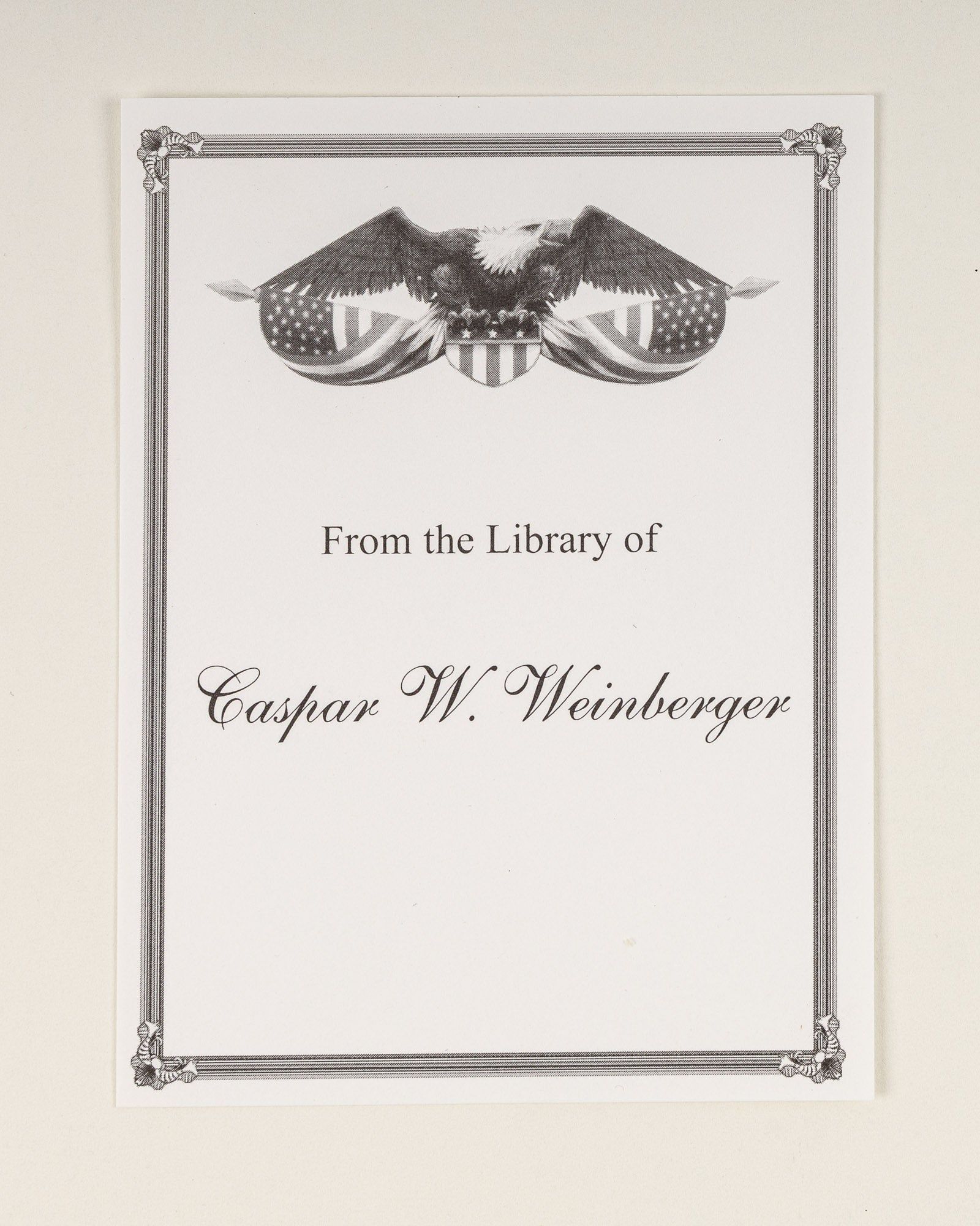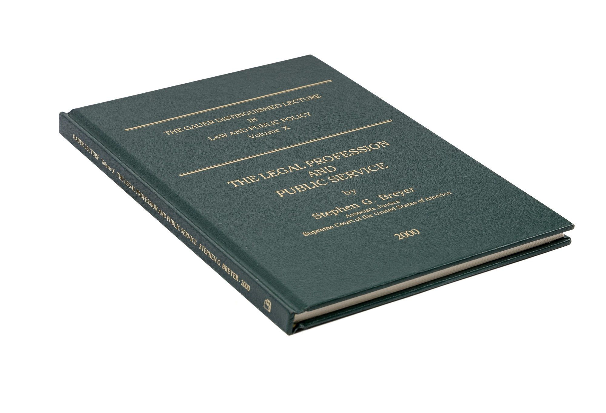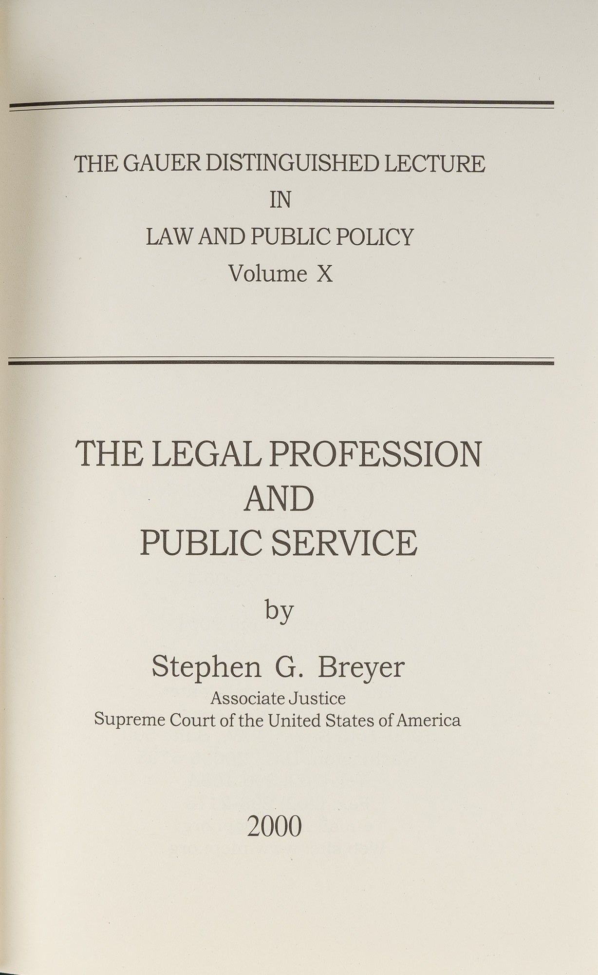 2001. Breyer, Stephen G[erald]. The Legal Profession and Public Service. Washington, D.C.: National Legal Center for the Public Interest, [2001]. v, 71 pp. Green cloth with gilt stamped spine and boards. Fine. Bookplate of Caspar Weinberger to front pastedown. Internally clean. $65. * Weinberger [1917-2006], a prominent Republican politician and statesman, was President Reagan's secretary of defense from 1981 to 1987. The Gauer Distinguished Lecture in Law and Public Policy; Volume 10. Contents: Introduction, William H. Webster; The Legal Profession and Public Service, Stephen G. Breyer; Biography of Stephen G. Breyer; Democracy in America, Chapter XVI, Alexis de Tocqueville; The Lawyer From Antiquity to Modern Times, Roscoe Pound; Shall We Kill All the Lawyers First?: Insider and Outsider Views of the Legal Profession, Amy E. Black and Stanley Rothman; The ABA Model Rules of Professional Conduct Rule 6.1.