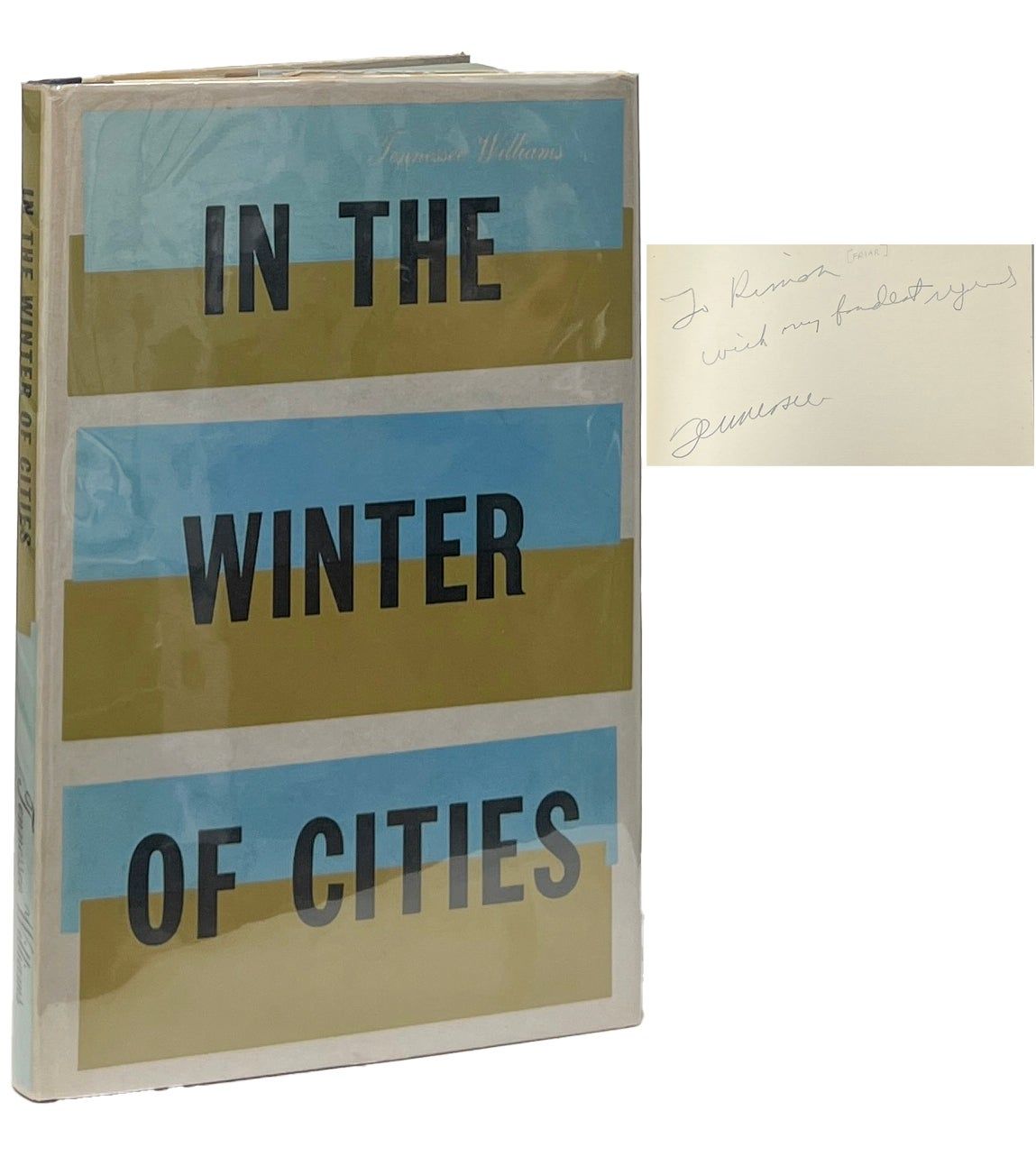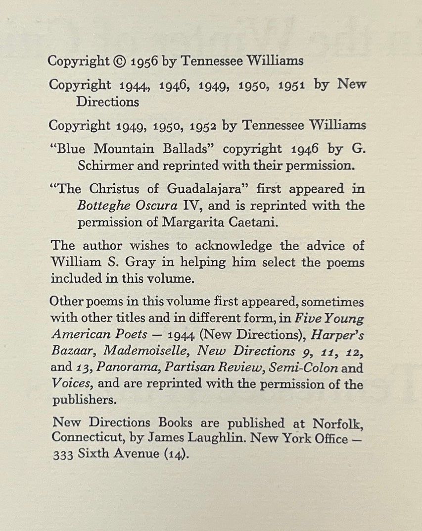 New York: New Directions, 1956. First Edition. Hardcover. Near Fine/Fine. Inscribed by Williams on the front endpaper to writer and translator Kimon Friar. Near Fine in a Fine jacket, unclipped ($3.50). Quarter black cloth with patterned paper on the boards, lightly rubbed at the edges, bumped at the corners. Square and firmly bound, clean internally. The debut collection of poetry by the famed playwright.