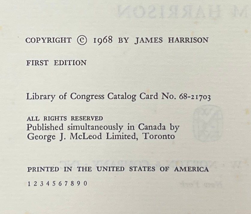 New York: W.W. Norton & Company, Inc, 1968. First Edition. Hardcover. Near Fine/Near Fine. Near Fine in a Near Fine jacket, clipped at the bottom corner but priced at the top ($4.95), lightly toned. Green cloth with gilt lettering on the spine. Square and firmly bound, a few spots of foxing, clean otherwise. The second collection of poetry from the author of Legends of the Fall.