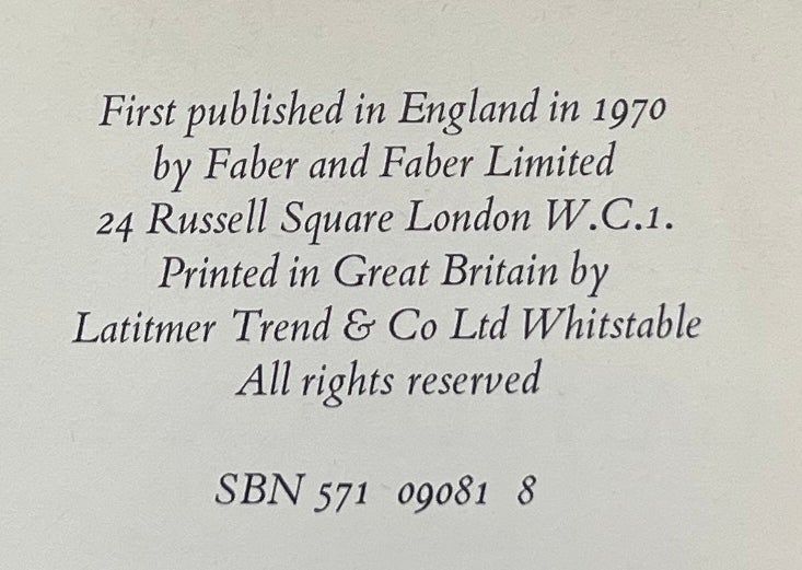London: Faber and Faber, 1970. First Edition. Hardcover. Very Good/Good. Very Good in a Good jacket, unclipped (20s £1.00 net) generally soiled, a few bumps and very shallow chips. Black cloth, boards slightly splayed, with gilt lettering on the spine. Square and firmly bound, clean internally.