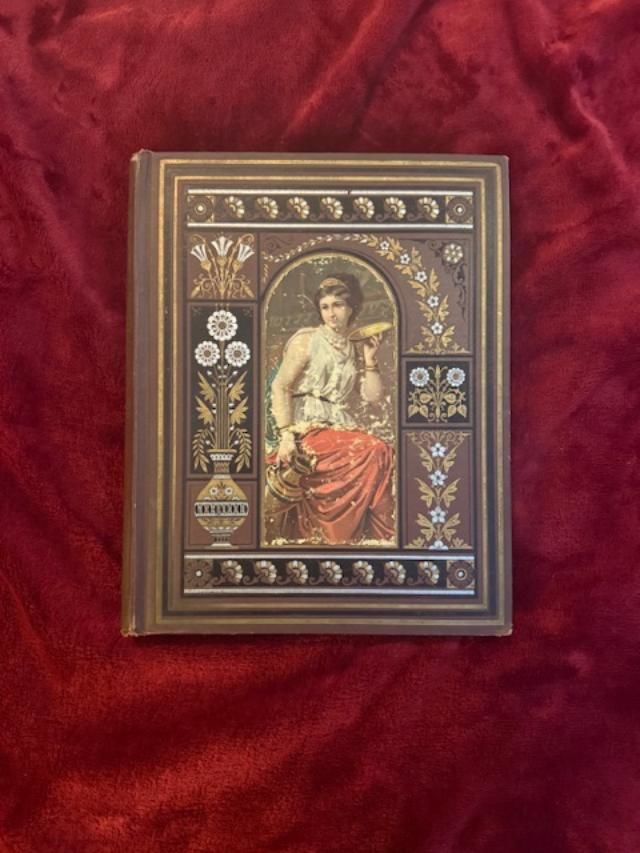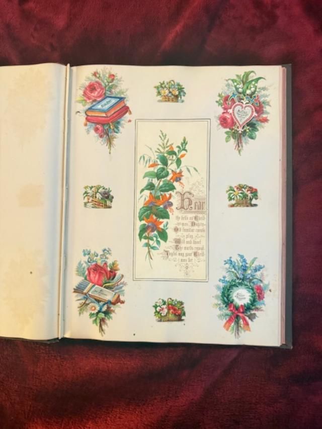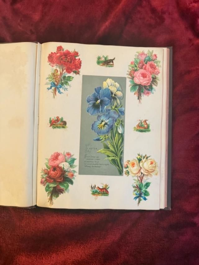 Folio scrapbook, illustrated cloth cover, illustrated 26 leaves plus two loose cards. Some wear to binding, a little aging, two loose cards. Illustrations appear to be mostly chromolithographic cards, with small floral illustrations arranged neatly around larger cards. Most of the illustrations are floral, but a couple of animal illustrations too. All illustrations are neatly pasted into the book, with the exception of two cards at the end, one of which is a Christmas card dated 1876.