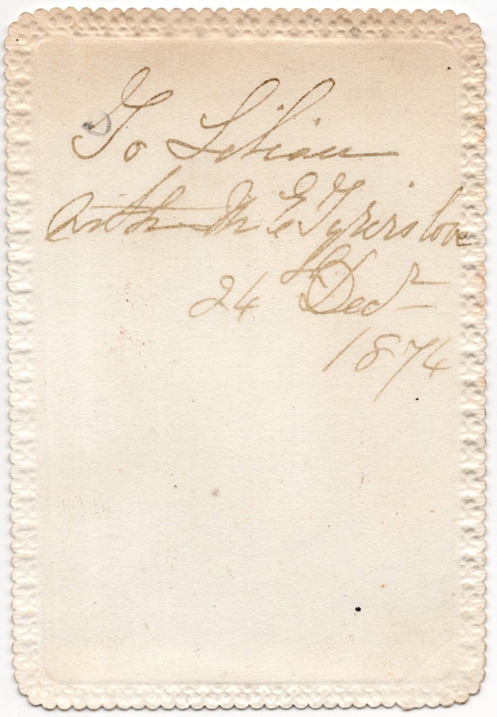 England, 1874. Very good. Light toning to verso.. An attractive 16mo greeting card for New Year's, depicting a young girl in a bright red headscarf against a wintry background. On the verso is a contemporary inscription that reads, "To Lillian with M.E. Taper[?]'s love 24 Decr 1874". Ink has been used to cross out "New Year" on the front to make it into a Christmas card. Chromolithographed with embossed and rounded edges, measures approx. 3.5" by 2.5