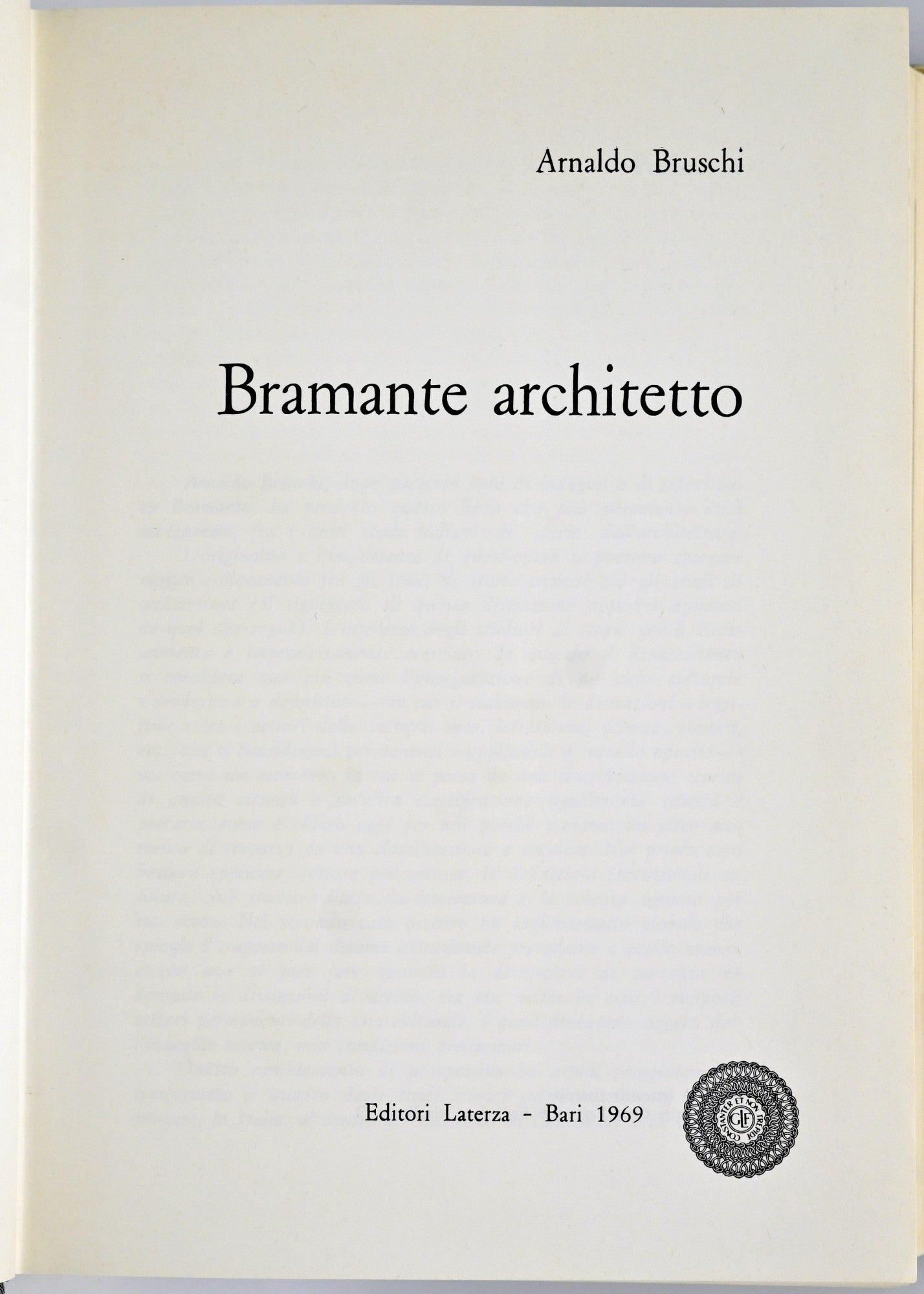Bari: Editore Laterze, 1969. First Edition. Hard Cover. Very Good binding. Large quarto volume; in the publisher’s gray cloth binding, with tattered dsutjacket; xlviii, 1098 pages, profusely illustrated with black and white photographs; there is a previous owner name penned on the front endpaper; we do not see other marks in the book.~~Bruschi teaches History of Architectrue at the University of Rome. His monograph on Bramante is exhaustive.~~. Very Good binding.