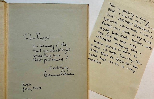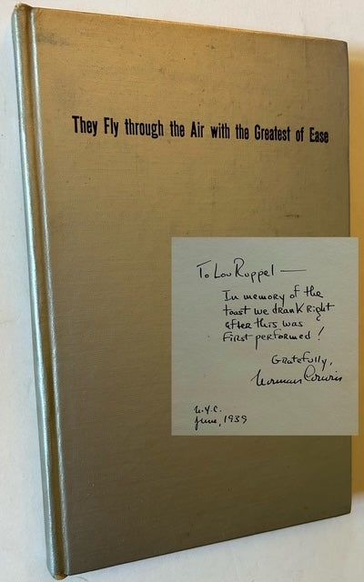 Weston, VT: Vrest Orton, 1939. Cloth. Near Fine. Laszlo Matulay. WARMLY INSCRIBED (IN YEAR-OF-PUBLICATION) BY NORMAN CORWIN on the front free endpaper. A very sharp copy to boot of the uncommon hardback --in its silver cloth-- of the 1939 1st edition of the author's first published book. Clean and Near Fine, with wonderful illustrations-in-charcoal by Laszlo Matulay accompanying Norman Corwin's text of this radio play. Also includes a 1 pg. handwritten letter (presumably from a former owner of this copy) describing a visit from renowned bookman Allan Covici, who expressed interest in this copy.