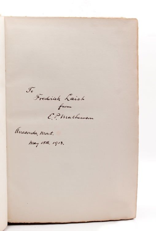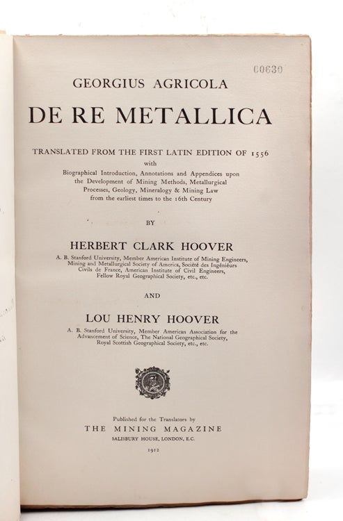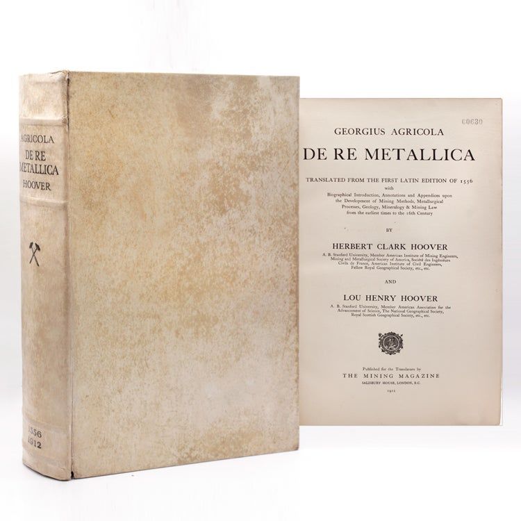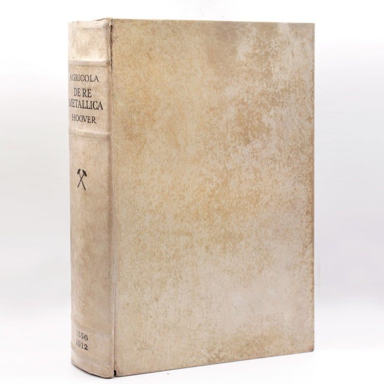 London: Published by Published for the Translators by The Mining Magazine, 1912. Translated from the First Latin text of 1556 by Herbert Hoover & Lou Henry Hoover, Number 630 of 3000 copies. Illustrated, [iv], xxxi., 640pp. Printed by Albert Frost & Sons, Rugby. Folio. Original vellum over boards, mottled, small split at front joint, else near fine. Translated from the First Latin text of 1556 by Herbert Hoover & Lou Henry Hoover, Number 630 of 3000 copies. Illustrated, [iv], xxxi., 640pp. Printed by Albert Frost & Sons, Rugby. Folio. Insribed on the ffep from E.P. Mathewson, General Manager at the Anaconda Smelter to Frederic Laist, Manager of the Anaconda Company's Reduction Plant in Montana dated May 15, 1913.