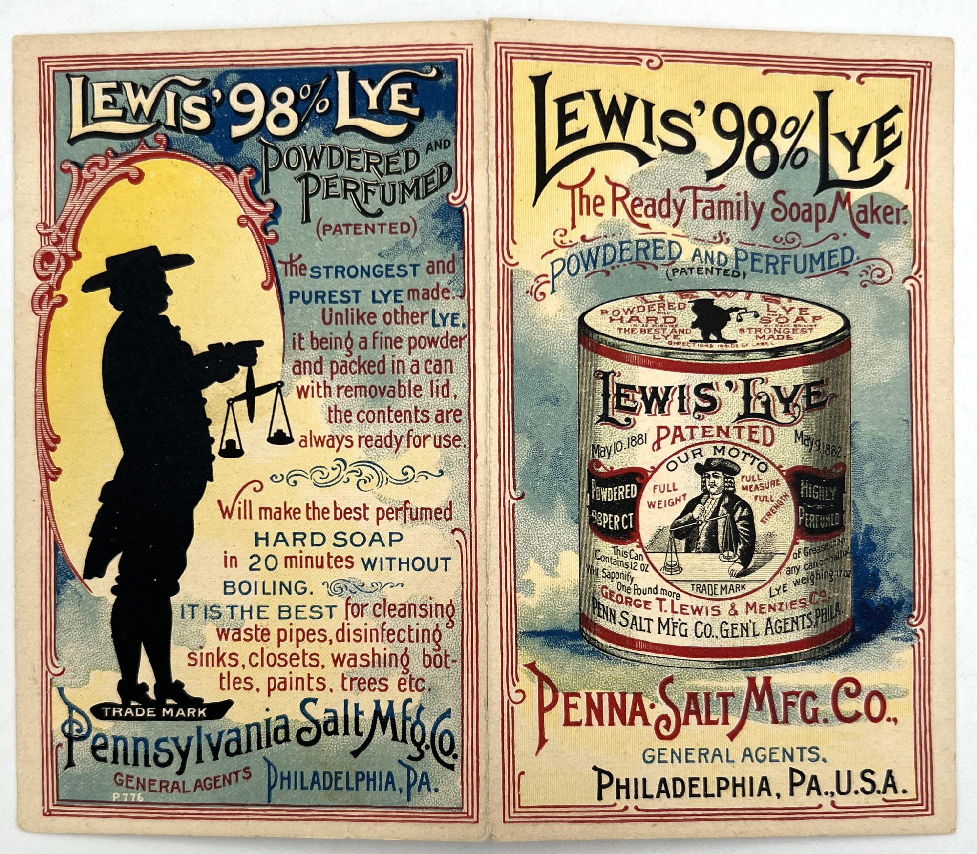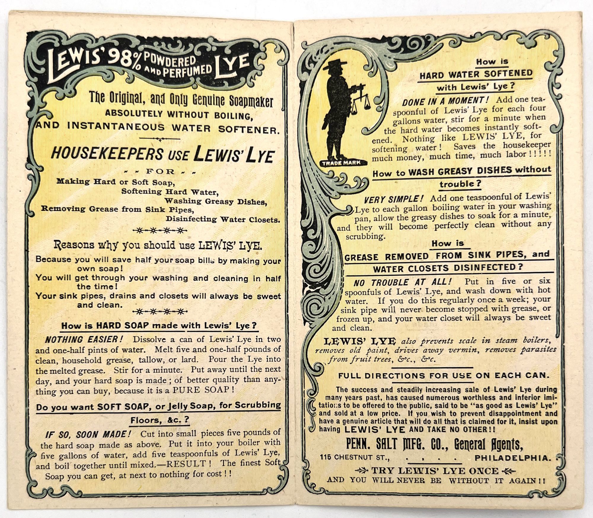 Philadelphia, Pennsylvania: Pennsylvania Salt Mfg. Co, 1905. Very good. Light toning, dust soiling.. Chromolithographed advertising card for a brand of powdered and perfumed lye, marketing the product to housekeepers, homemakers, and other domestic workers (i.e. women). Includes a color illustration of the product in the tin, with a lengthy pitch for the product's efficacy and time- and labor-saving attributes. Interesting to see how companies marketed products to women at this time. Measures approx. 6" by 3.5" folded, 6" by 7" unfolded.