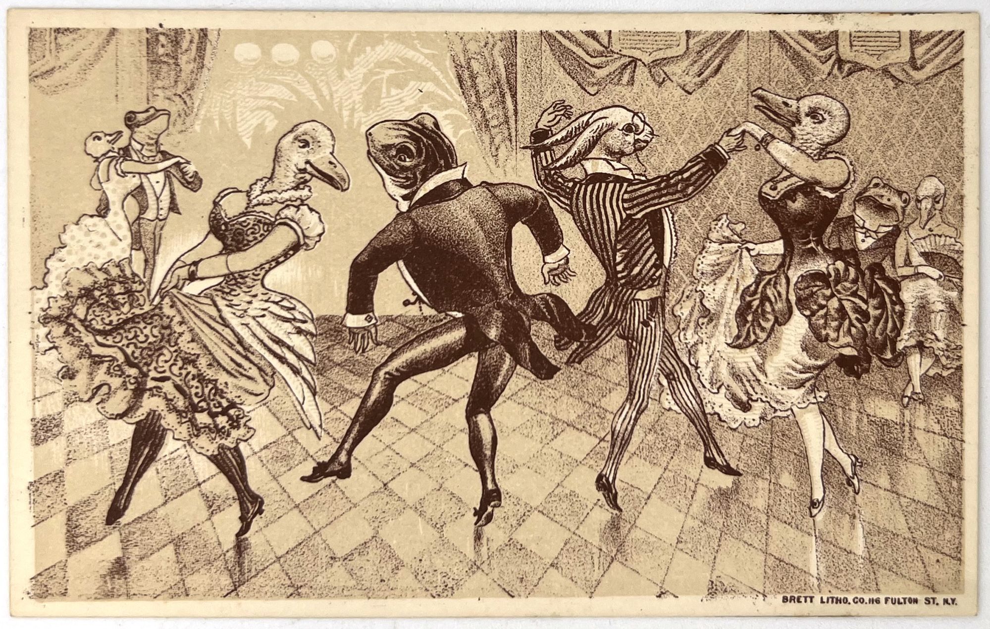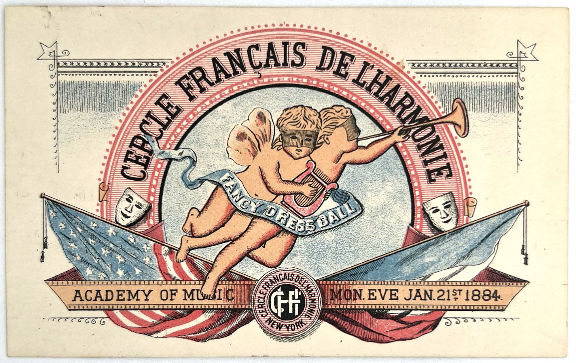 New York, New York: Cercle Francais de l'Harmonie, 1884. Very good. Light toning.. Printed invitation/"admit one" ticket for the evening entertainments of the Cercle Francais de l'Harmonie in January 1884 in New York. The front is printed in color and depicts two winged putti flanked by French and American flags. The back features a comic image of anthropomorphized animals dancing to a lively tune in a ballroom in French costume. All of the men are toads (with the exception of one rabbit), and all the ladies are big-chested birds showing quite a bit of leg. Measures approx. 3" by 5