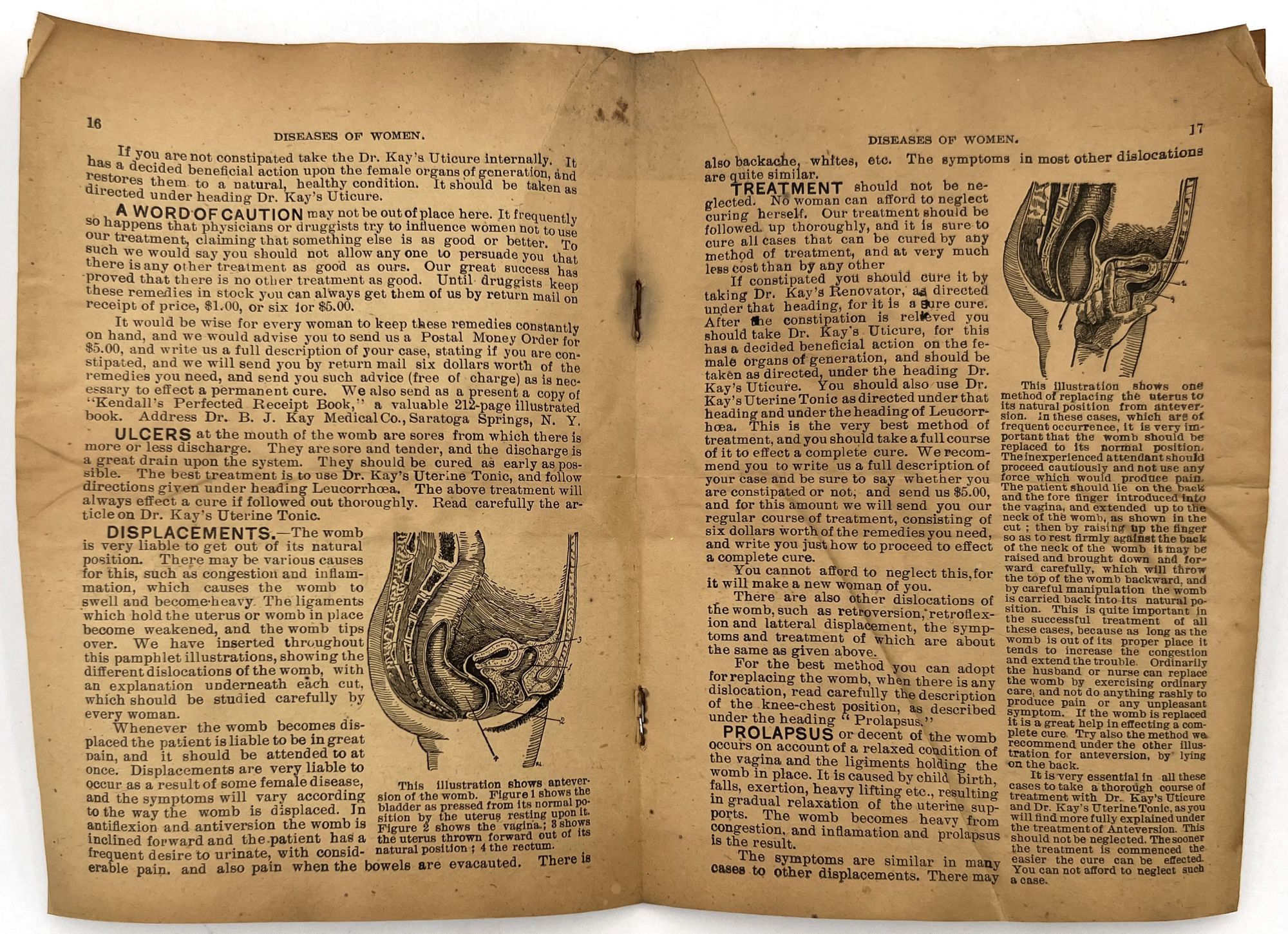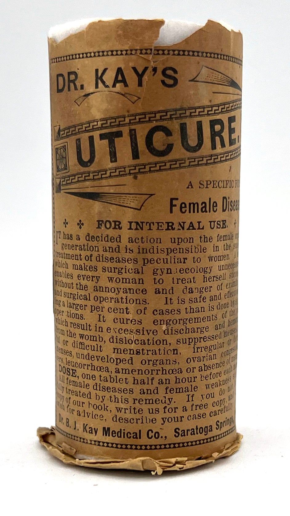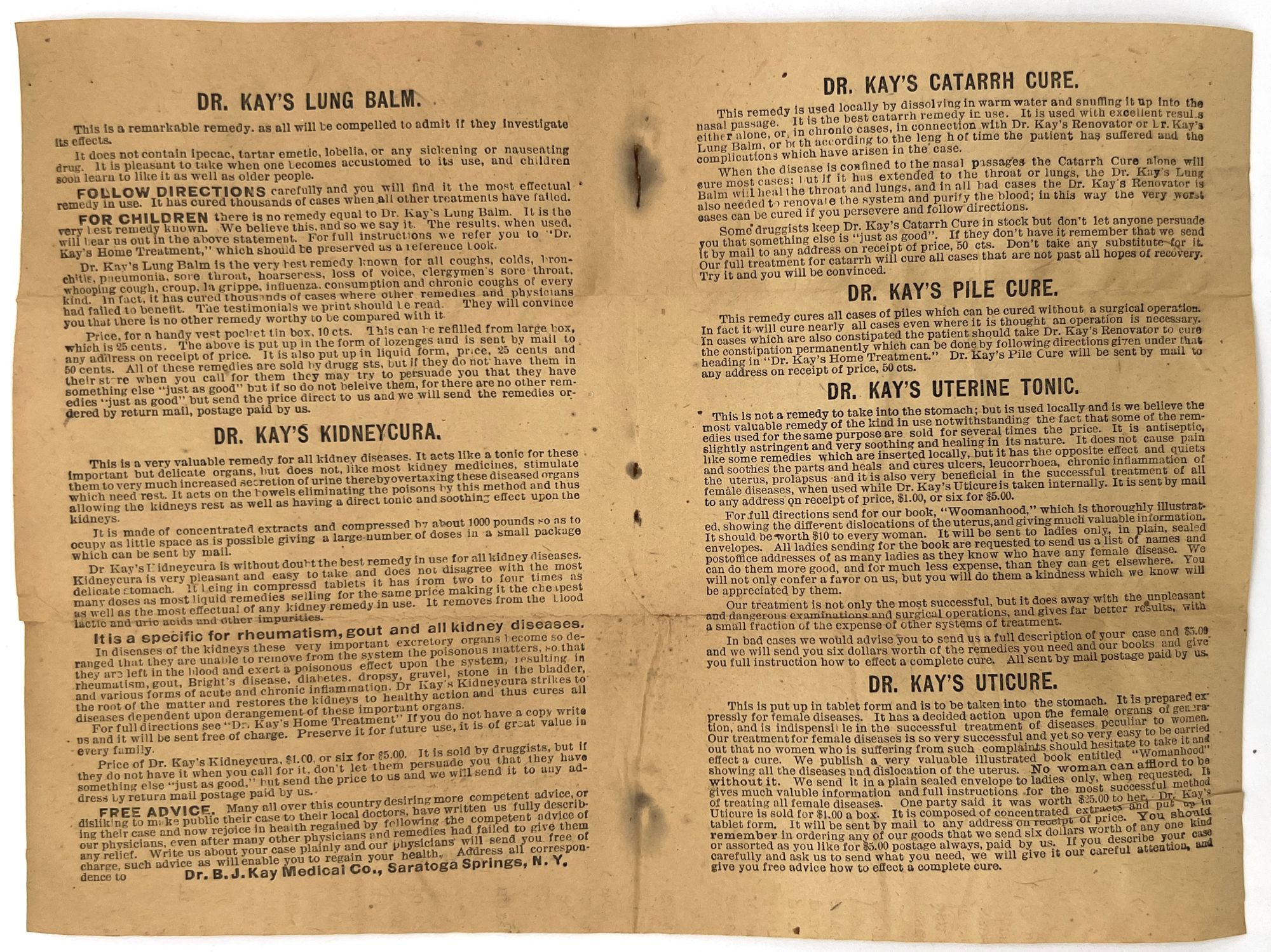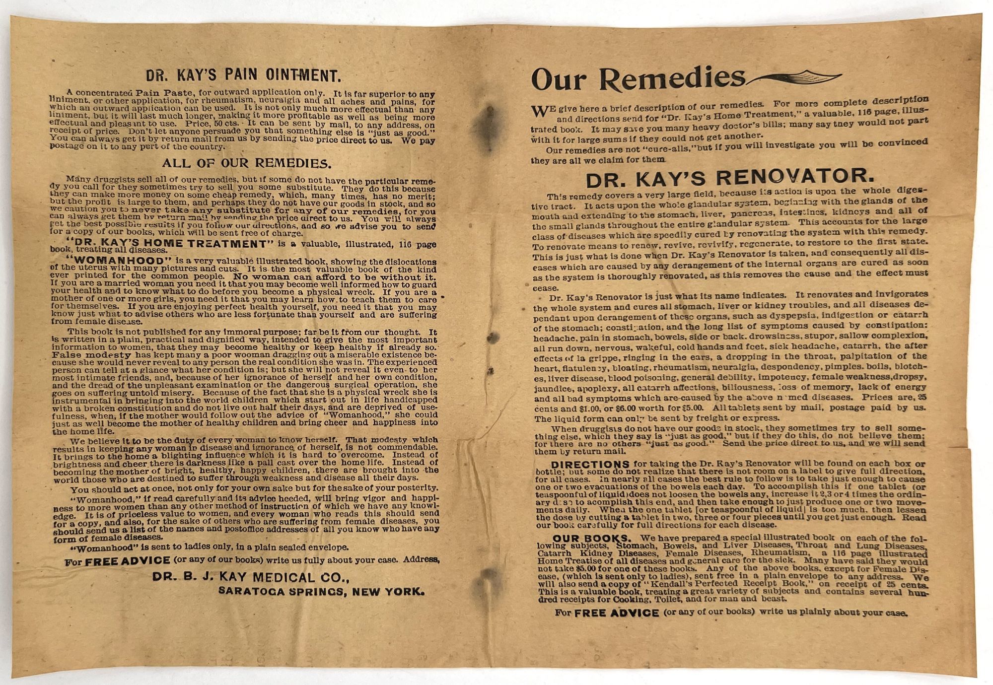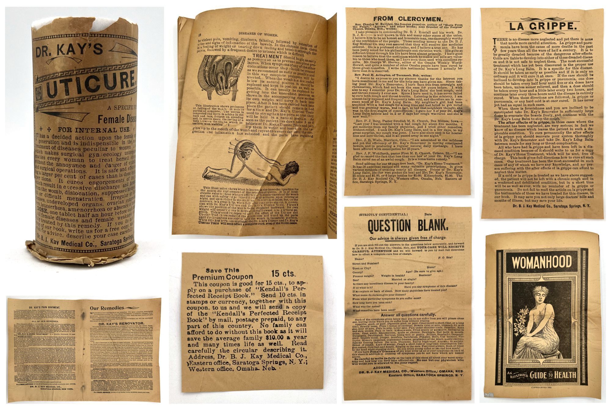 Omaha, Nebraska: Dr. B.J. Kay Medical Co, 1899. Good. Toned with water staining, short tears.. A scarce grouping of ephemera advertising patent medicines by the Dr. B.J. Kay Medical Company, including cure-alls for everything from catarrh to common "diseases of women". Patent medicines, often secured by mail order, were common until dubious cure were banned by the Pure Food and Drug Act in 1906. Include three (3) printed leaflets, one (1) mail order coupon for a recipe book, one (1) booklet, and one (1) 3.75" tall printed cylindrical wrapper for a pill bottle ("Dr. Kay's Uticure" for "female diseases"). The booklet is described as follows: "Womanhood". Omaha: Dr. B.J. Kay Medical Co., 1899. Single vol. (7" by 5"), pp. 32, with in-text diagrams, in original illus. self wrps with image of classical woman on front. A guide to common "female" ailments such as amenorrhoea, the "Whites" or leukorrhea, and prolapsed uterus. Also includes an interesting section on "the criminality and physical evils of forced abortions" (p.3).