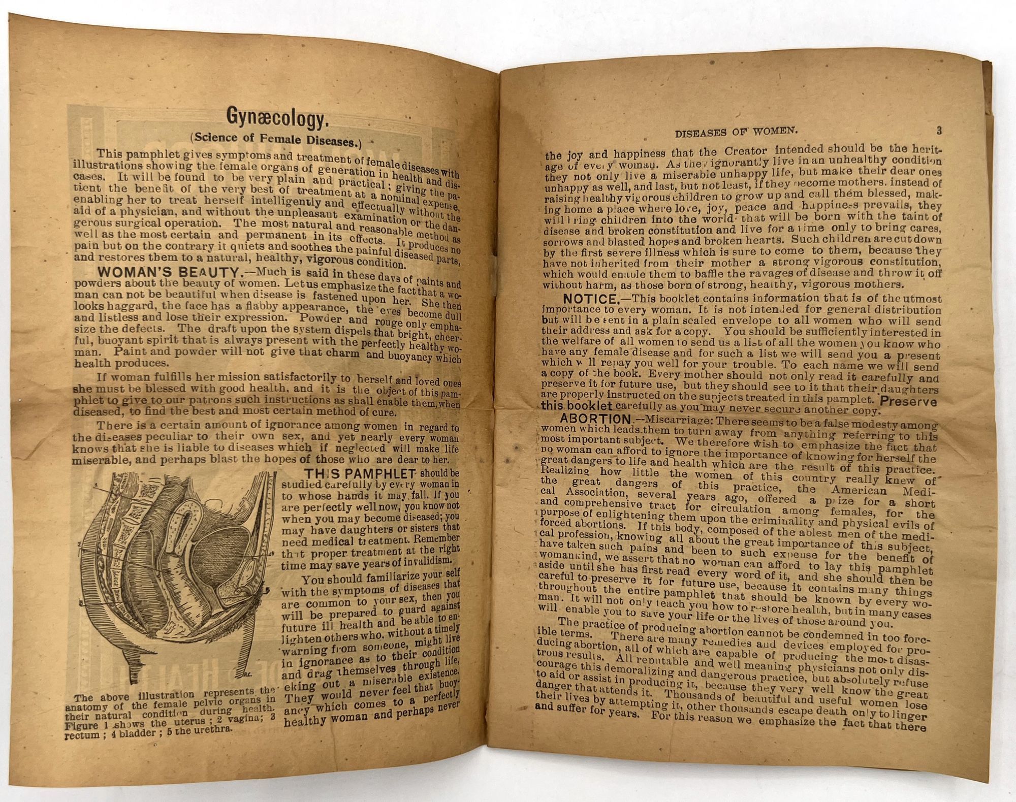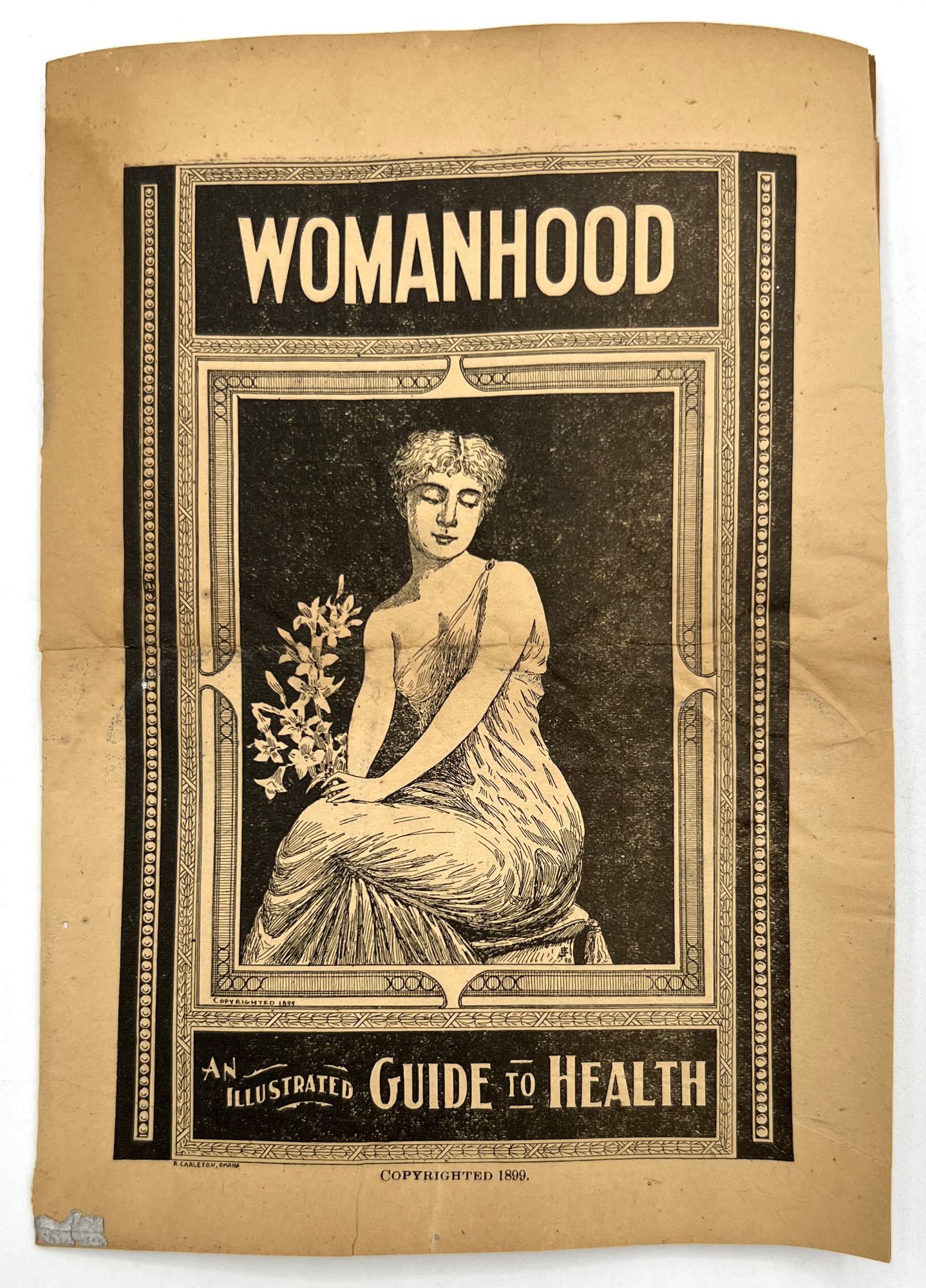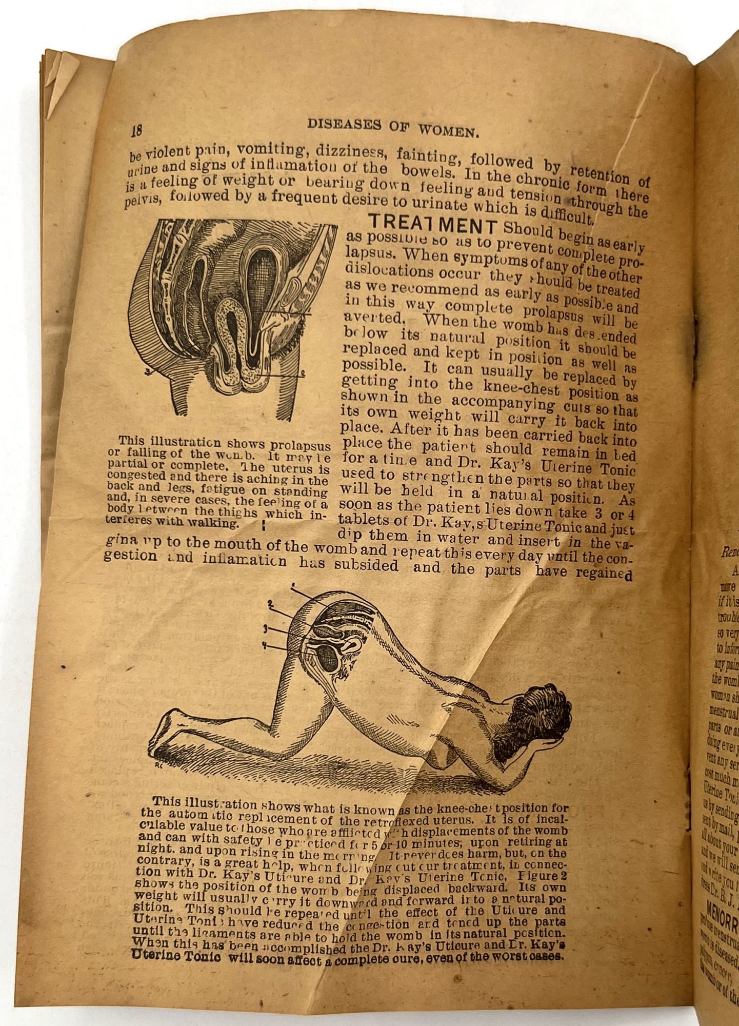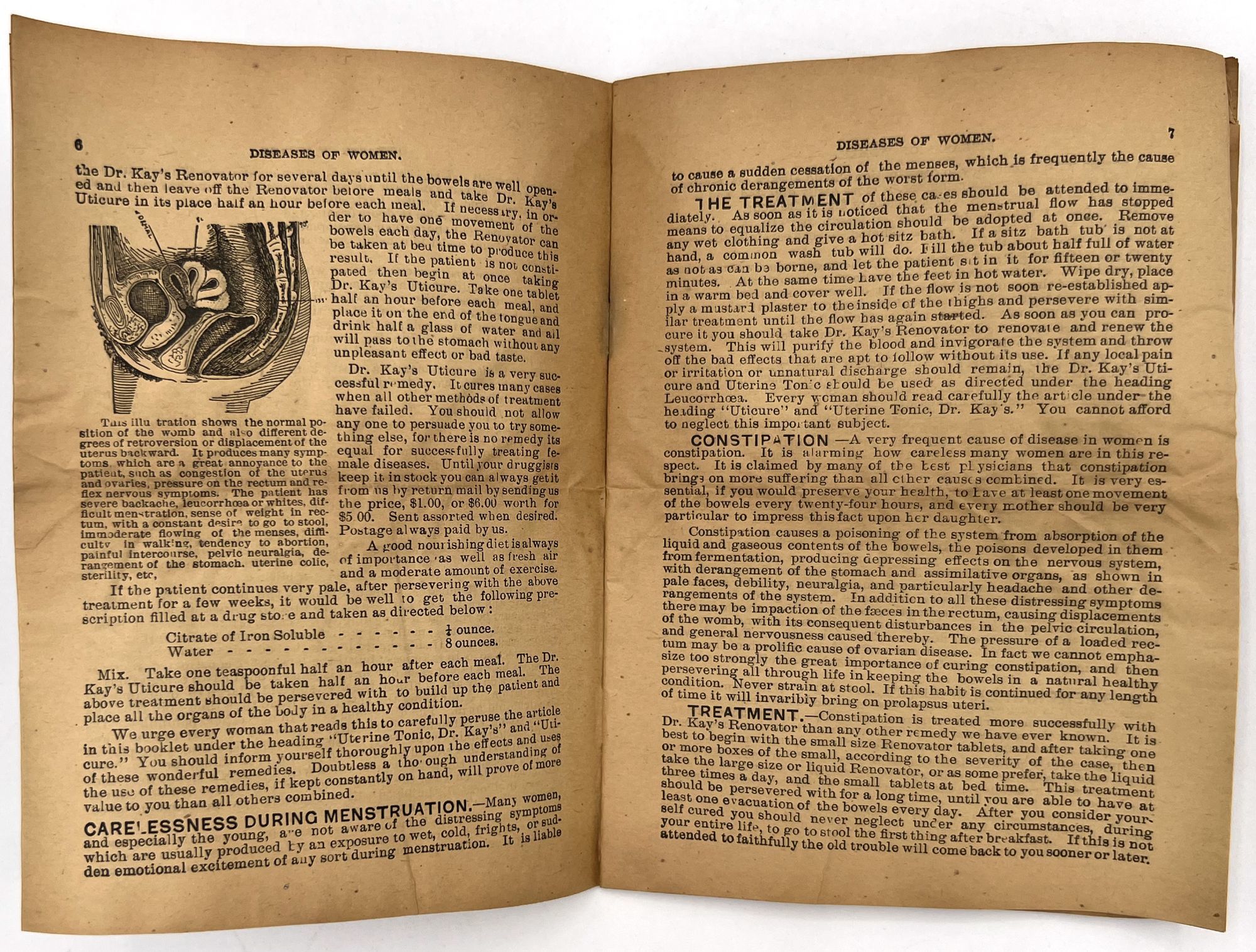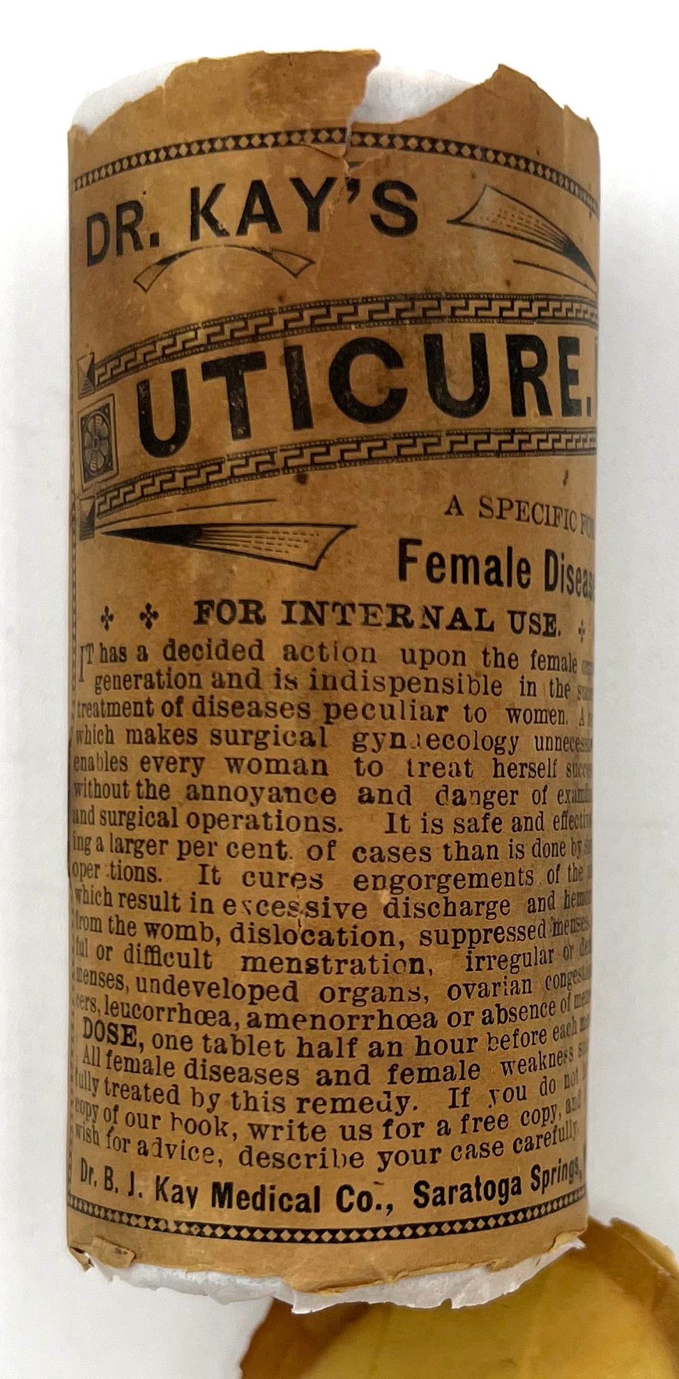Omaha, Nebraska: Dr. B.J. Kay Medical Co, 1899. Good. Toned with water staining, short tears.. A scarce grouping of ephemera advertising patent medicines by the Dr. B.J. Kay Medical Company, including cure-alls for everything from catarrh to common "diseases of women". Patent medicines, often secured by mail order, were common until dubious cure were banned by the Pure Food and Drug Act in 1906. Include three (3) printed leaflets, one (1) mail order coupon for a recipe book, one (1) booklet, and one (1) 3.75" tall printed cylindrical wrapper for a pill bottle ("Dr. Kay's Uticure" for "female diseases"). The booklet is described as follows: "Womanhood". Omaha: Dr. B.J. Kay Medical Co., 1899. Single vol. (7" by 5"), pp. 32, with in-text diagrams, in original illus. self wrps with image of classical woman on front. A guide to common "female" ailments such as amenorrhoea, the "Whites" or leukorrhea, and prolapsed uterus. Also includes an interesting section on "the criminality and physical evils of forced abortions" (p.3).