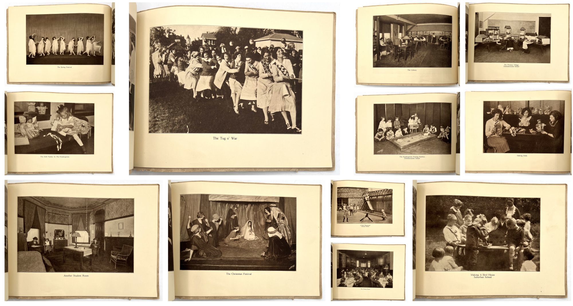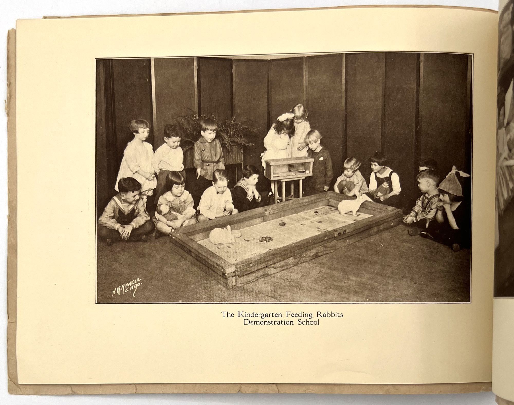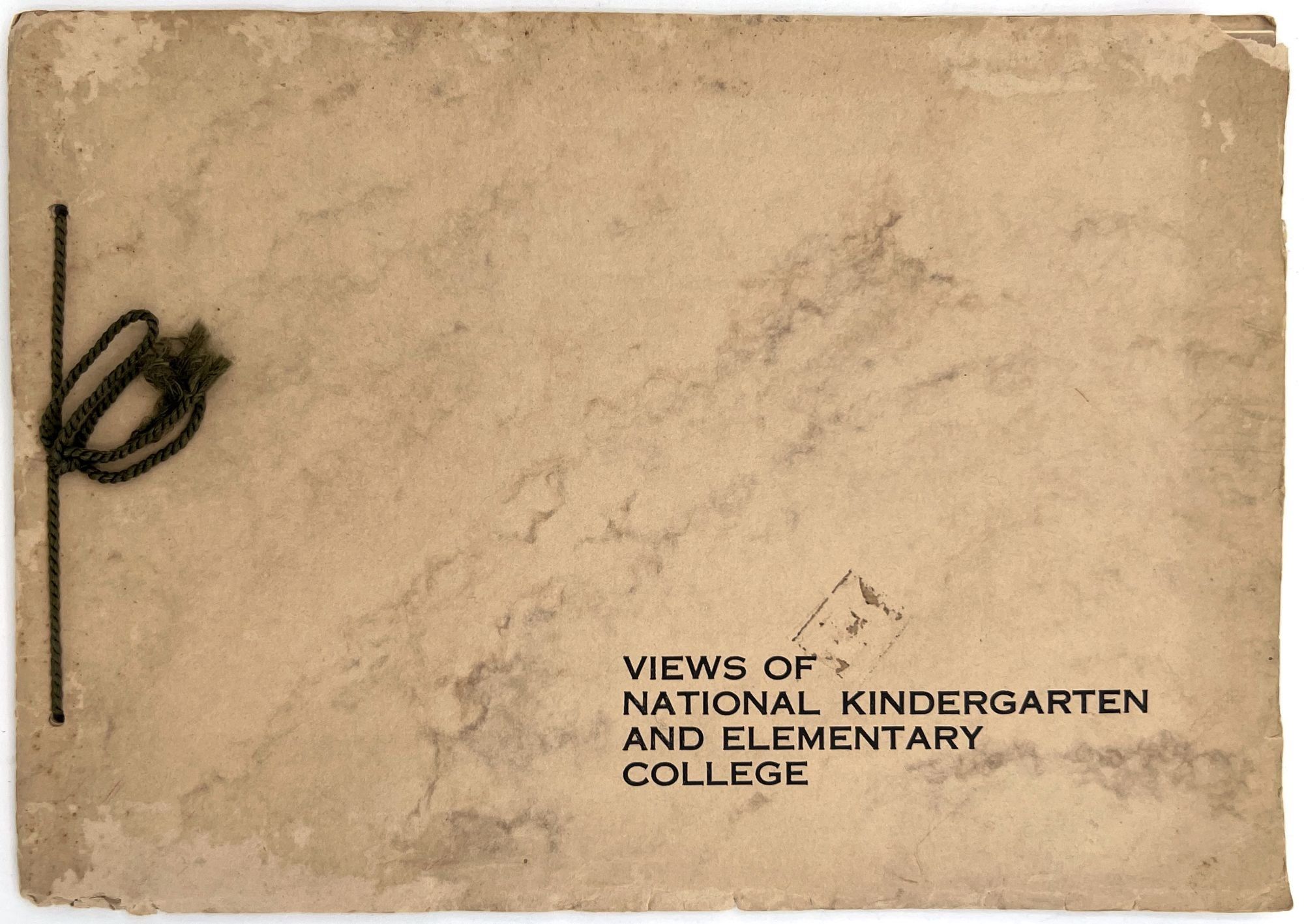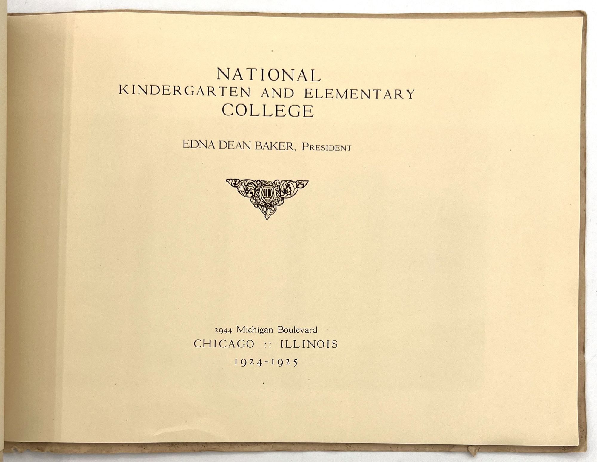 Chicago, Illinois: National Kindergarten and Elementary College, 1924. Very good. Light dust soiling. Remnants of scotch tape to upper cover. A little chipping/wear to extremities.. Photo-illustrated promotional booklet for the National Kindergarten and Elementary College, a school for young women teachers interested in teaching Kindergarten and early childhood education. Founded in 1886 by educator Elizabeth Harrison (1849-1927), a pioneer in developing the Kindergarten curriculum. Today, we take the presence of early childhood education for granted, but in the 1920s the practice was still largely nascent, and teachers were just starting to see the value of "learning through play". This booklet provides a look at the school's facilities, and the young woman teachers in the school's library, dining room, and dormitories. Also shows the kindergarten classes in action, with small children playing with dolls, caring for rabbits, building doll houses, playing with a May Pole, and on the playground. Single vol. (7" by 10"), pp. 28, photo illus., in original printed wrps. secured with dark olive green cord at left-hand edge.