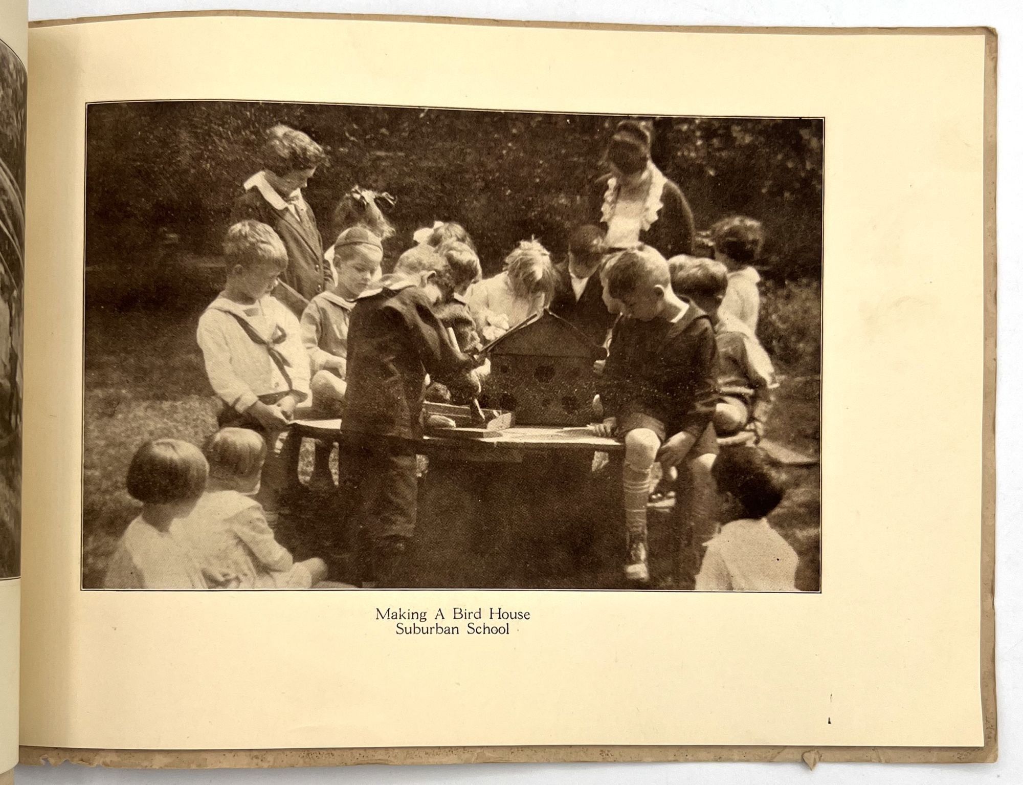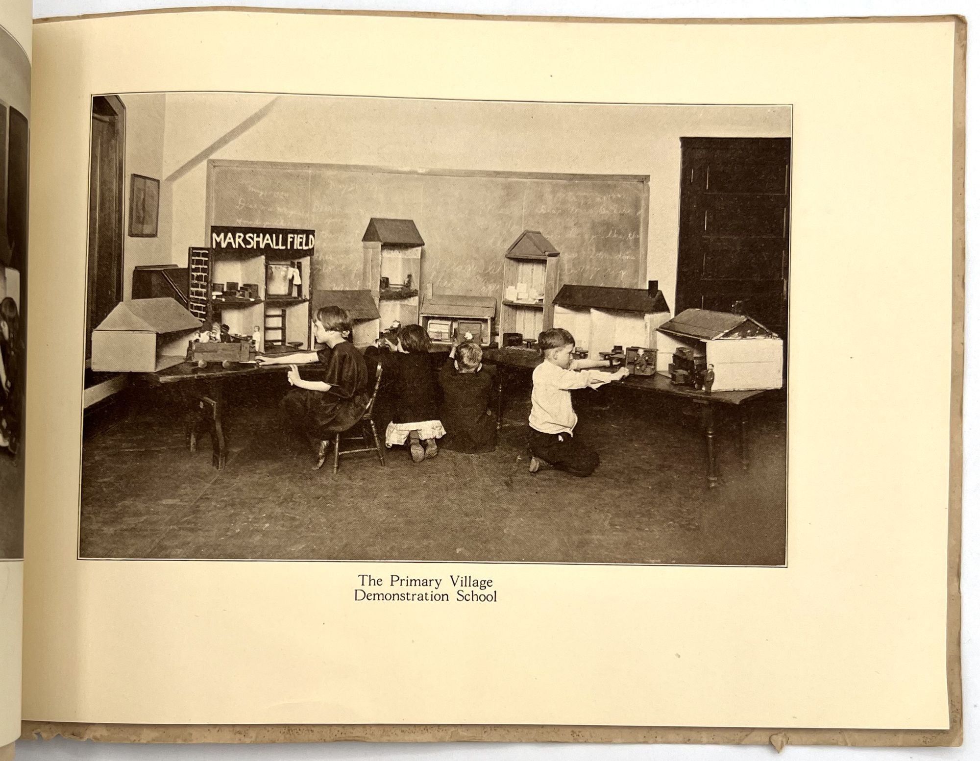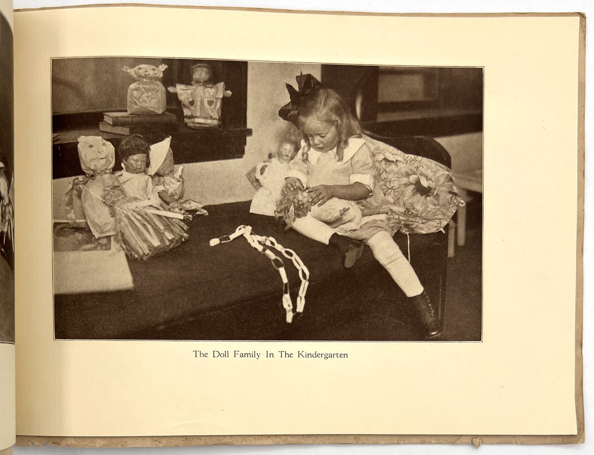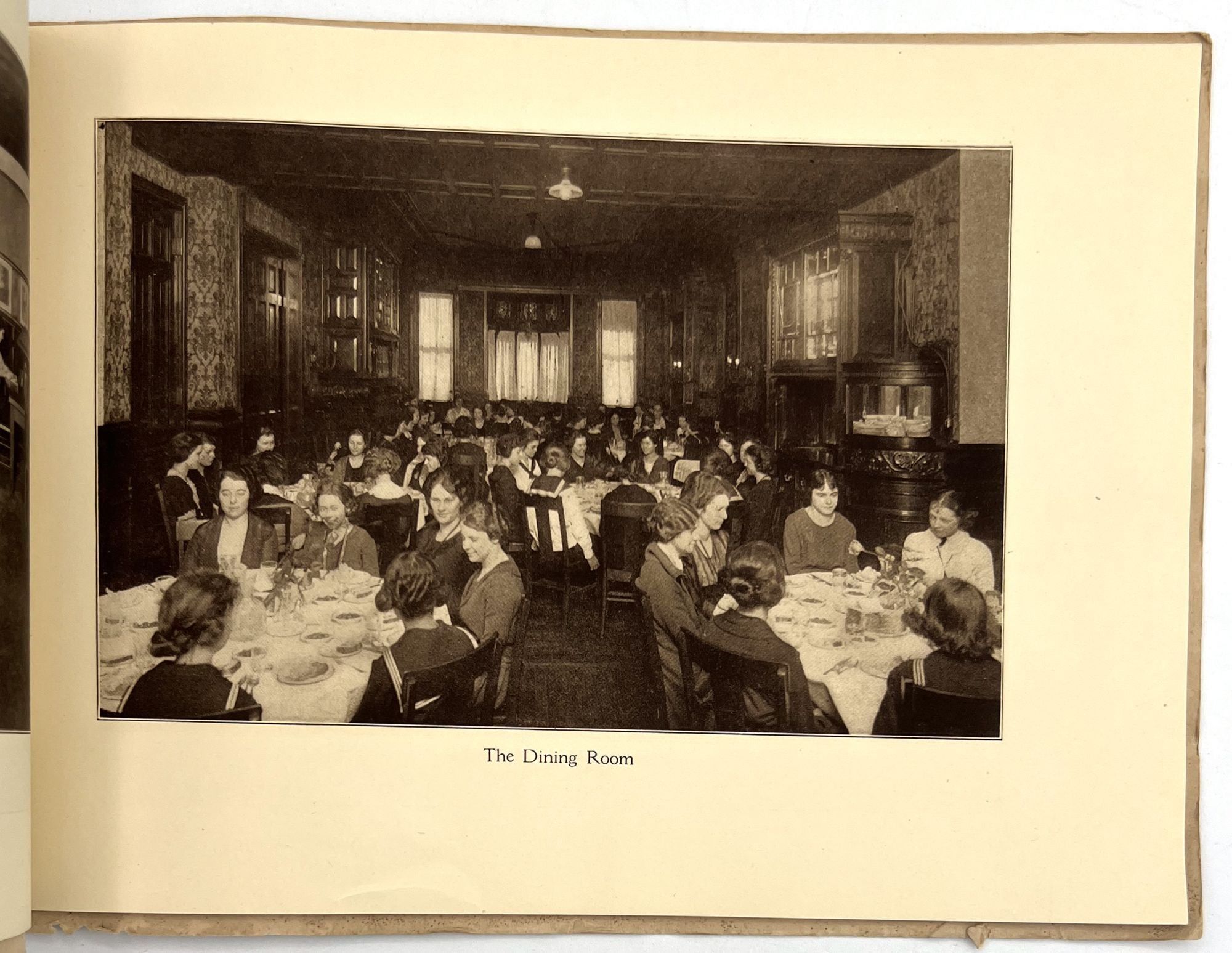 Chicago, Illinois: National Kindergarten and Elementary College, 1924. Very good. Light dust soiling. Remnants of scotch tape to upper cover. A little chipping/wear to extremities.. Photo-illustrated promotional booklet for the National Kindergarten and Elementary College, a school for young women teachers interested in teaching Kindergarten and early childhood education. Founded in 1886 by educator Elizabeth Harrison (1849-1927), a pioneer in developing the Kindergarten curriculum. Today, we take the presence of early childhood education for granted, but in the 1920s the practice was still largely nascent, and teachers were just starting to see the value of "learning through play". This booklet provides a look at the school's facilities, and the young woman teachers in the school's library, dining room, and dormitories. Also shows the kindergarten classes in action, with small children playing with dolls, caring for rabbits, building doll houses, playing with a May Pole, and on the playground. Single vol. (7" by 10"), pp. 28, photo illus., in original printed wrps. secured with dark olive green cord at left-hand edge.