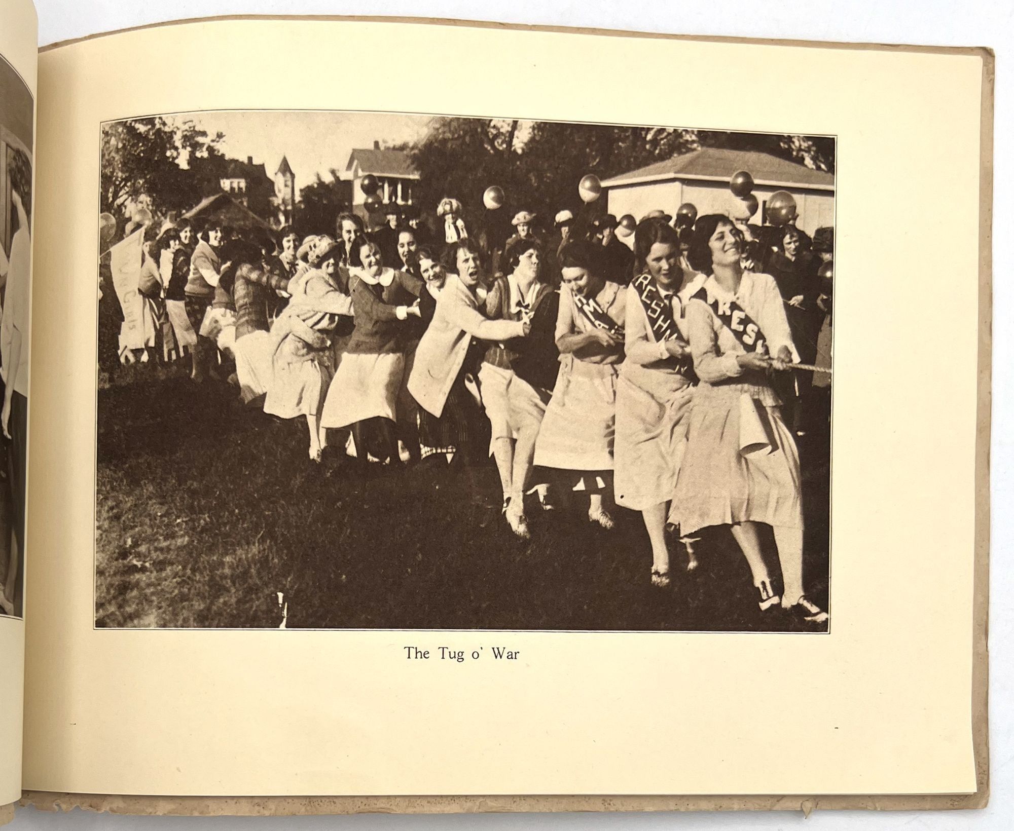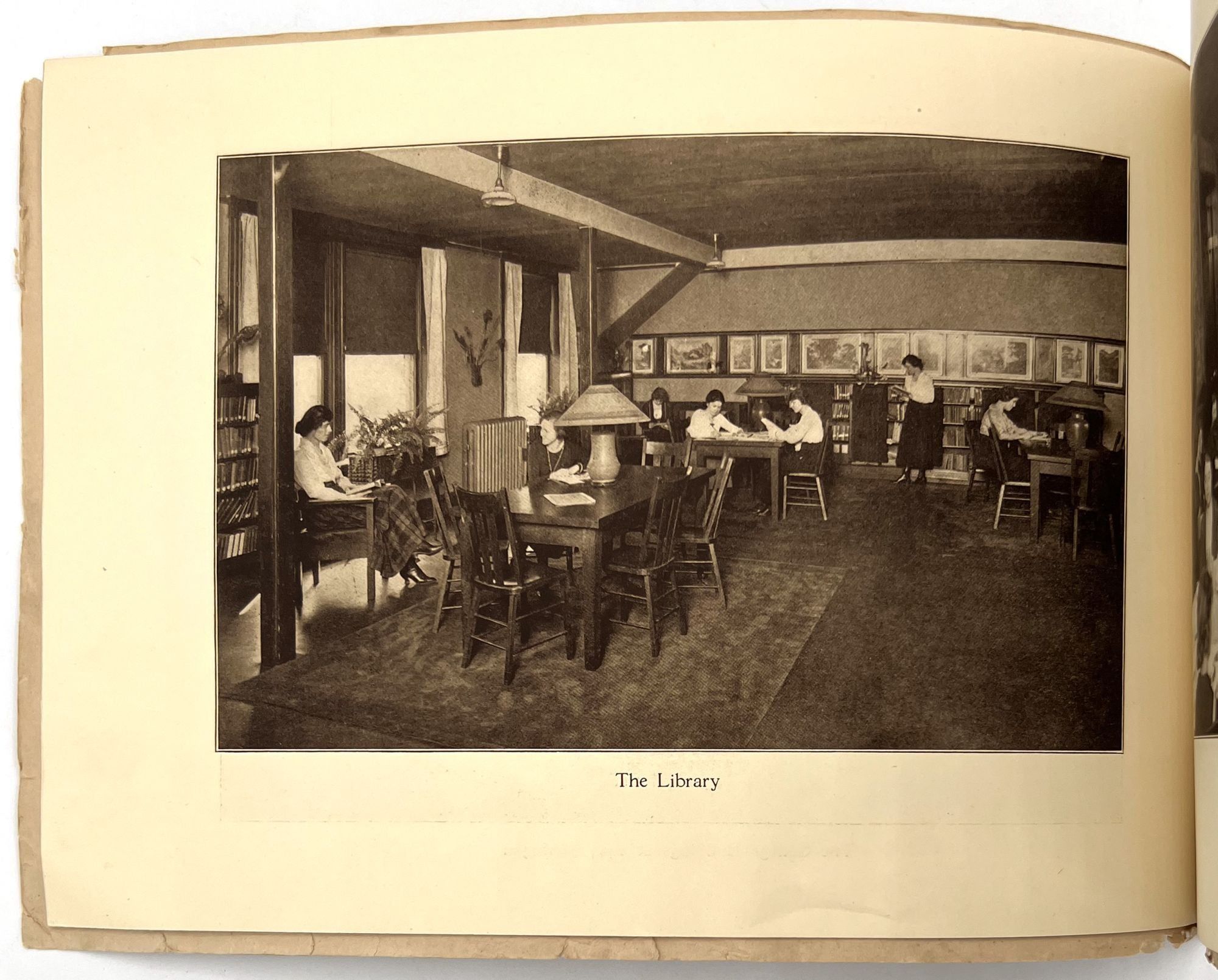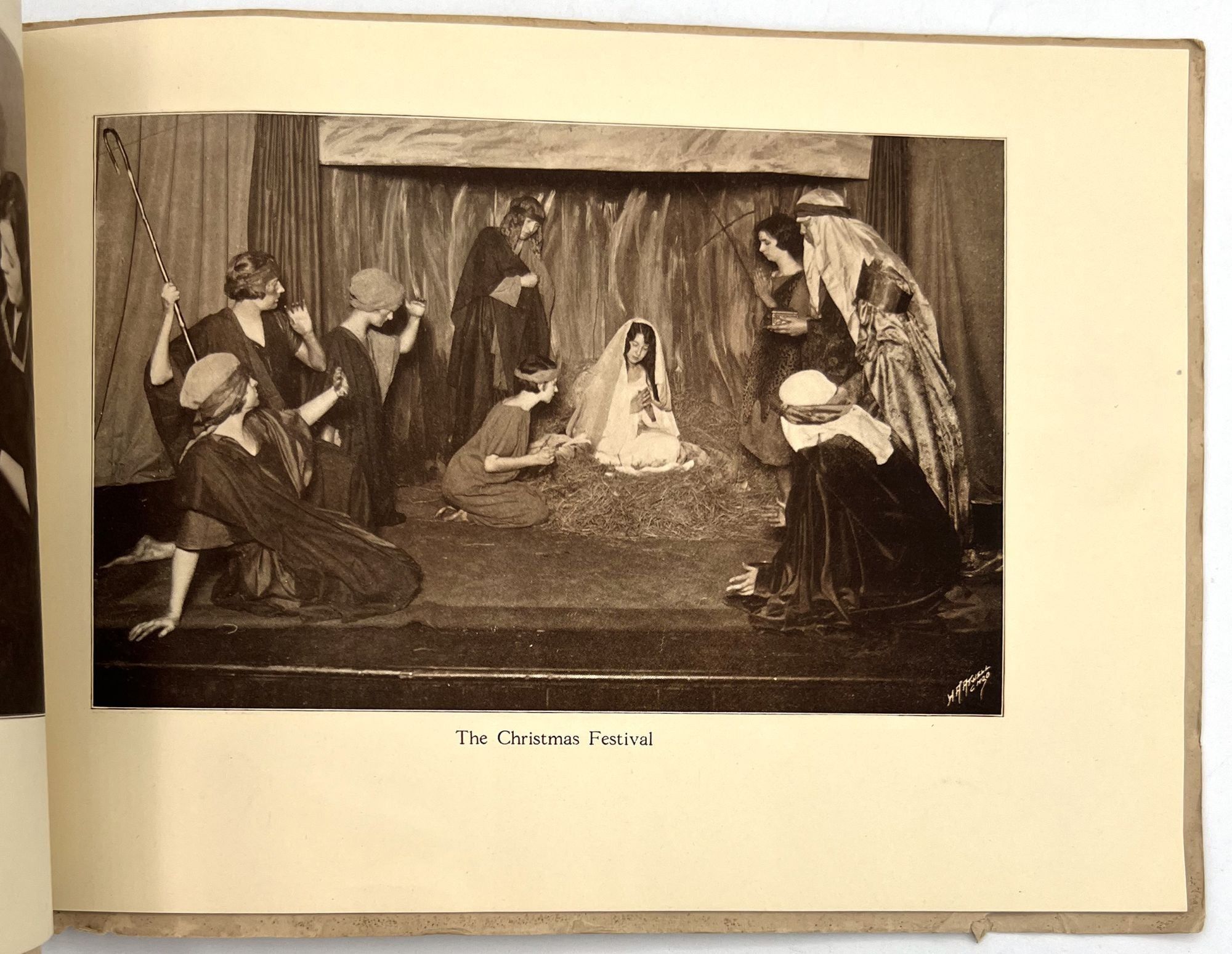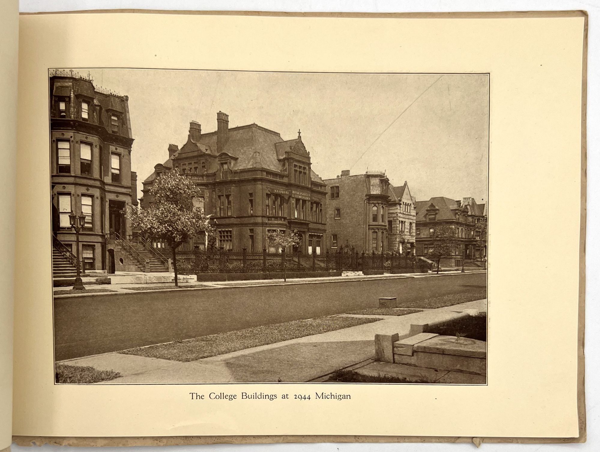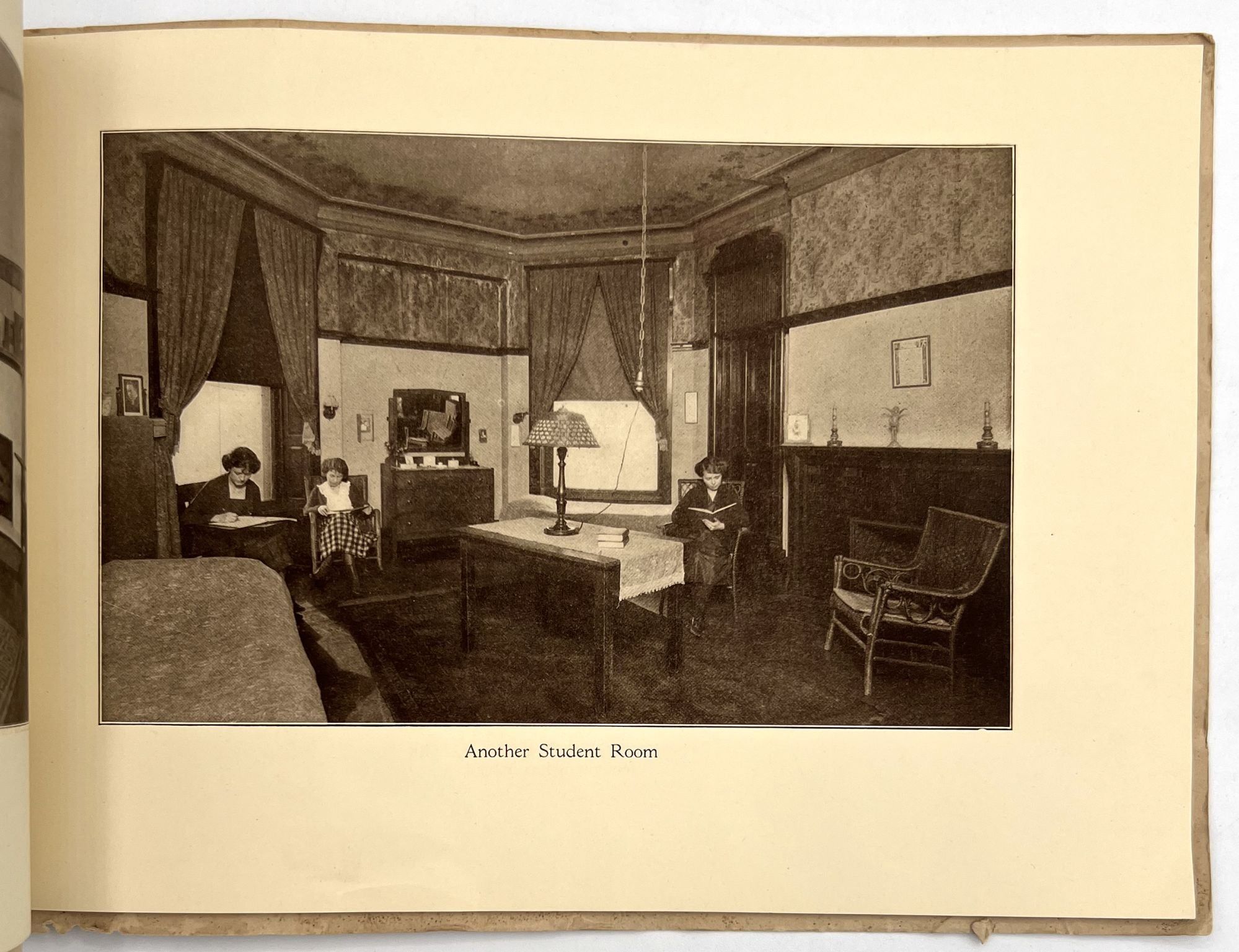 Chicago, Illinois: National Kindergarten and Elementary College, 1924. Very good. Light dust soiling. Remnants of scotch tape to upper cover. A little chipping/wear to extremities.. Photo-illustrated promotional booklet for the National Kindergarten and Elementary College, a school for young women teachers interested in teaching Kindergarten and early childhood education. Founded in 1886 by educator Elizabeth Harrison (1849-1927), a pioneer in developing the Kindergarten curriculum. Today, we take the presence of early childhood education for granted, but in the 1920s the practice was still largely nascent, and teachers were just starting to see the value of "learning through play". This booklet provides a look at the school's facilities, and the young woman teachers in the school's library, dining room, and dormitories. Also shows the kindergarten classes in action, with small children playing with dolls, caring for rabbits, building doll houses, playing with a May Pole, and on the playground. Single vol. (7" by 10"), pp. 28, photo illus., in original printed wrps. secured with dark olive green cord at left-hand edge.