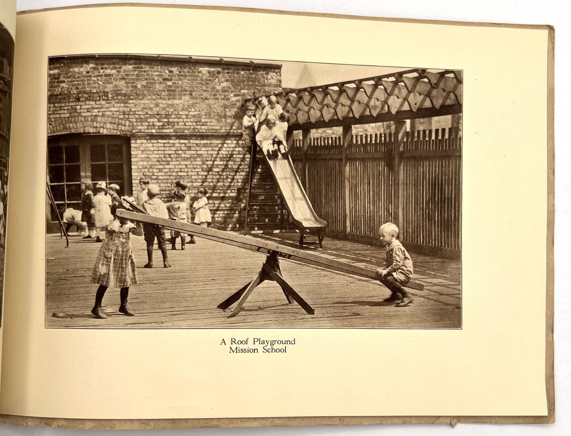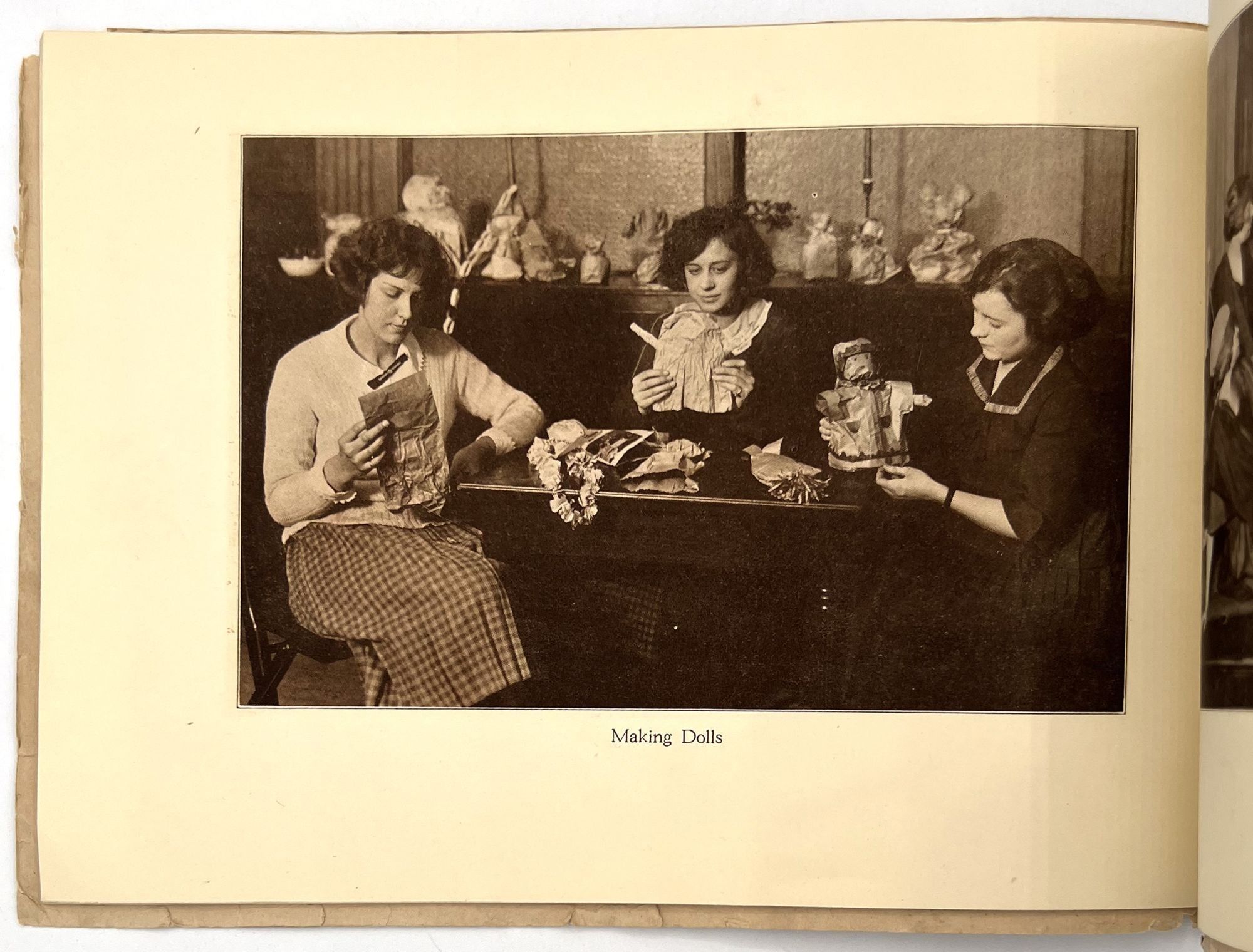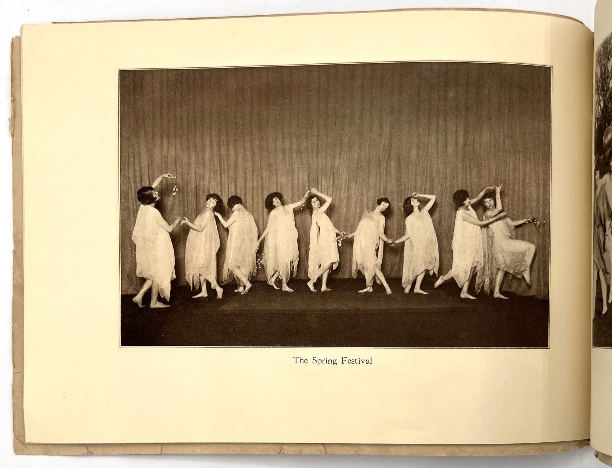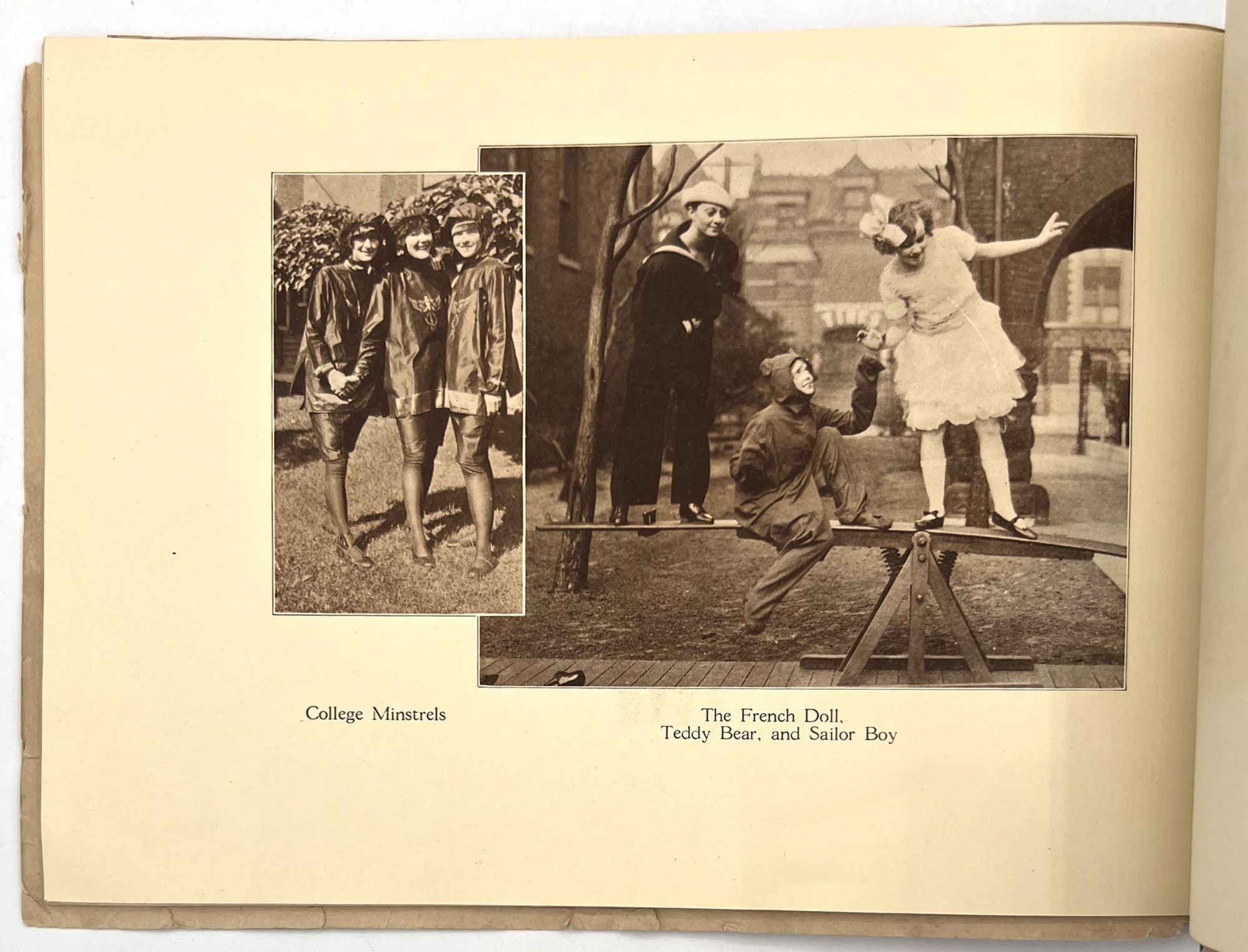 Chicago, Illinois: National Kindergarten and Elementary College, 1924. Very good. Light dust soiling. Remnants of scotch tape to upper cover. A little chipping/wear to extremities.. Photo-illustrated promotional booklet for the National Kindergarten and Elementary College, a school for young women teachers interested in teaching Kindergarten and early childhood education. Founded in 1886 by educator Elizabeth Harrison (1849-1927), a pioneer in developing the Kindergarten curriculum. Today, we take the presence of early childhood education for granted, but in the 1920s the practice was still largely nascent, and teachers were just starting to see the value of "learning through play". This booklet provides a look at the school's facilities, and the young woman teachers in the school's library, dining room, and dormitories. Also shows the kindergarten classes in action, with small children playing with dolls, caring for rabbits, building doll houses, playing with a May Pole, and on the playground. Single vol. (7" by 10"), pp. 28, photo illus., in original printed wrps. secured with dark olive green cord at left-hand edge.