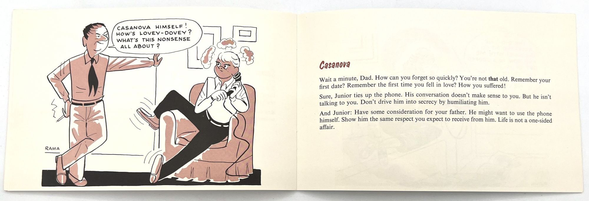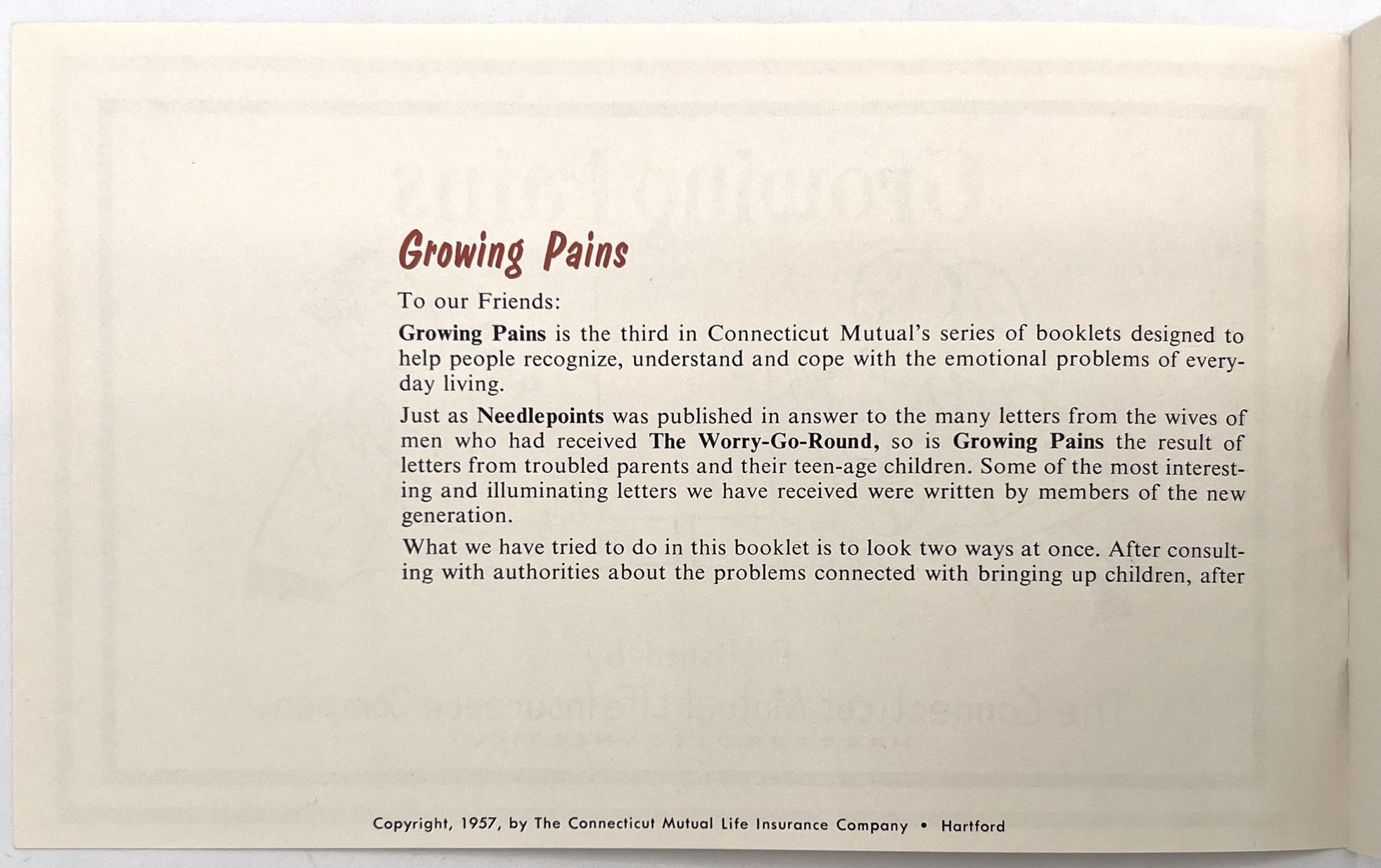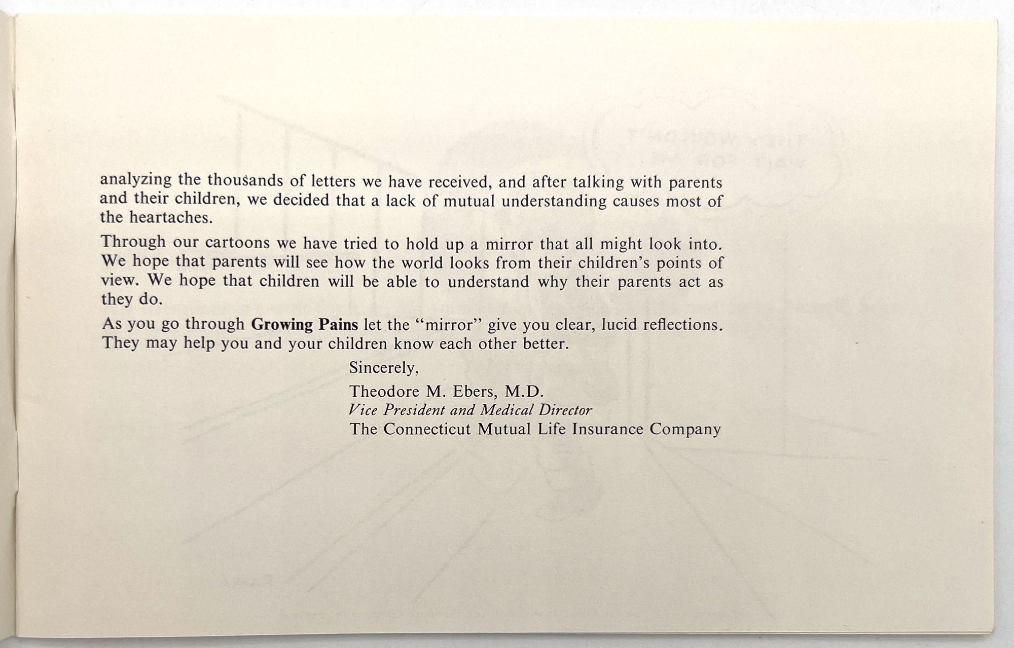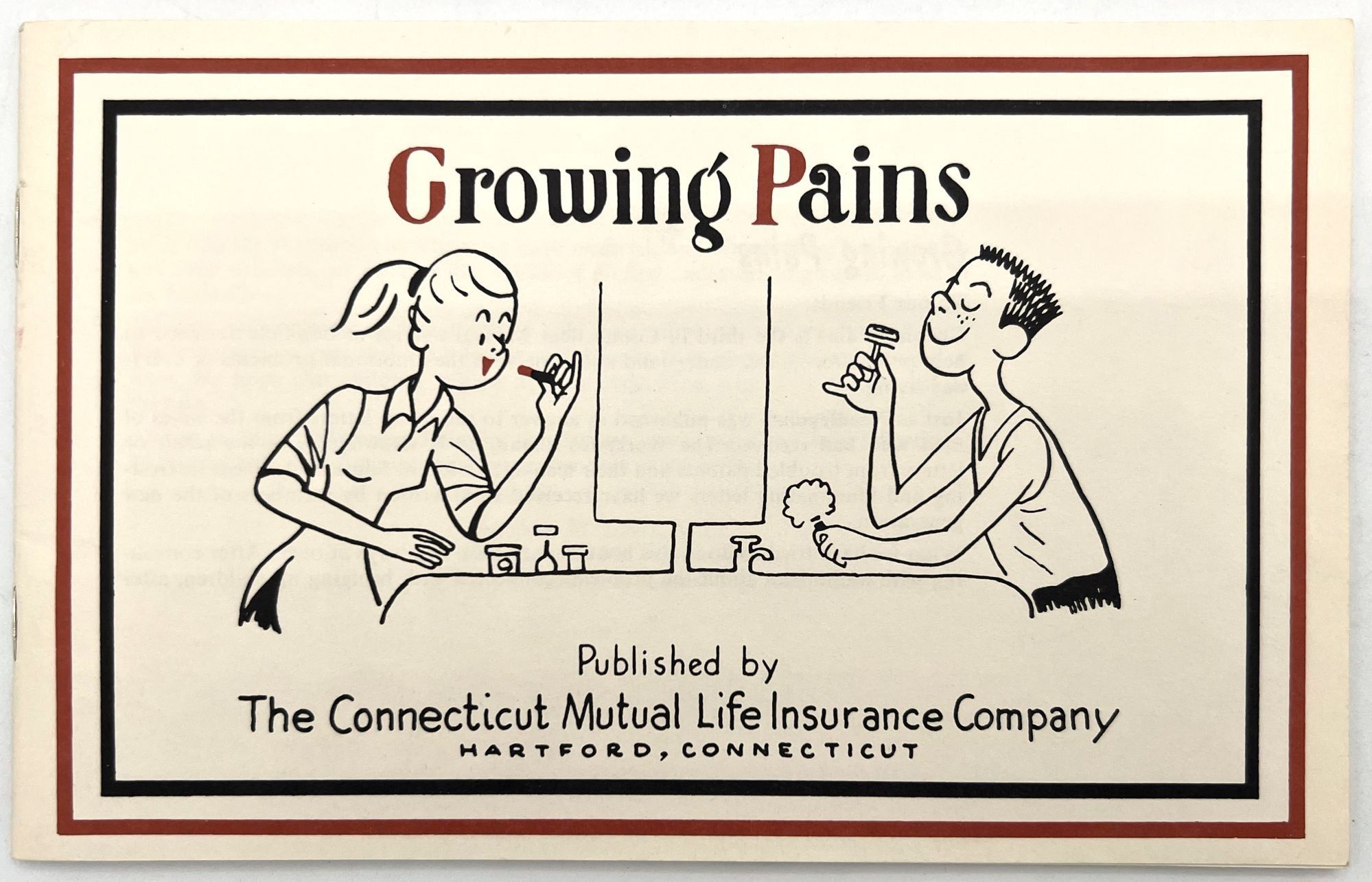 Hartford, Connecticut: The Connecticut Mutual Life Insurance Company, 1957. Near-fine.. A parenting advice booklet published by the Connecticut Mutual Life Insurance Company for families on the topic of growing up, from early childhood to teenage-hood. Describes itself as "the result of letters from troubled parents and their teen-age children" seeking guidance. Features amusing cartoon illustrations of different hypothetical situations to bring humor to the subject. Advises parents to be patient and understanding, and to never bicker in front of children; also asks them to empathize with their children. Part of a series on social issues facing Connecticut families in the 1950s. Single vol. (5" by 8"), pp. 28, illus., stapled in original illus. wrps.