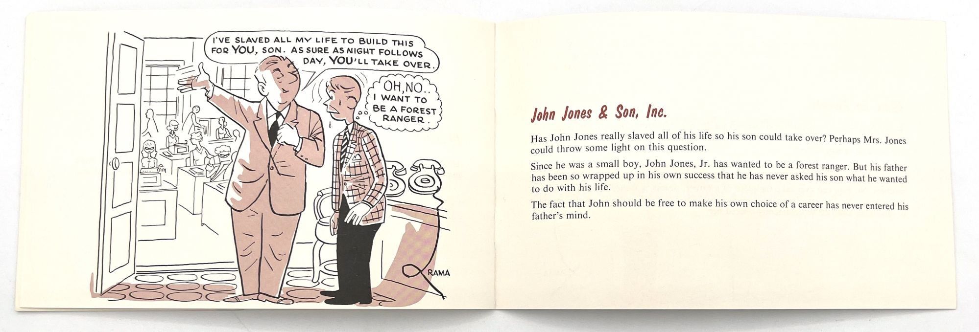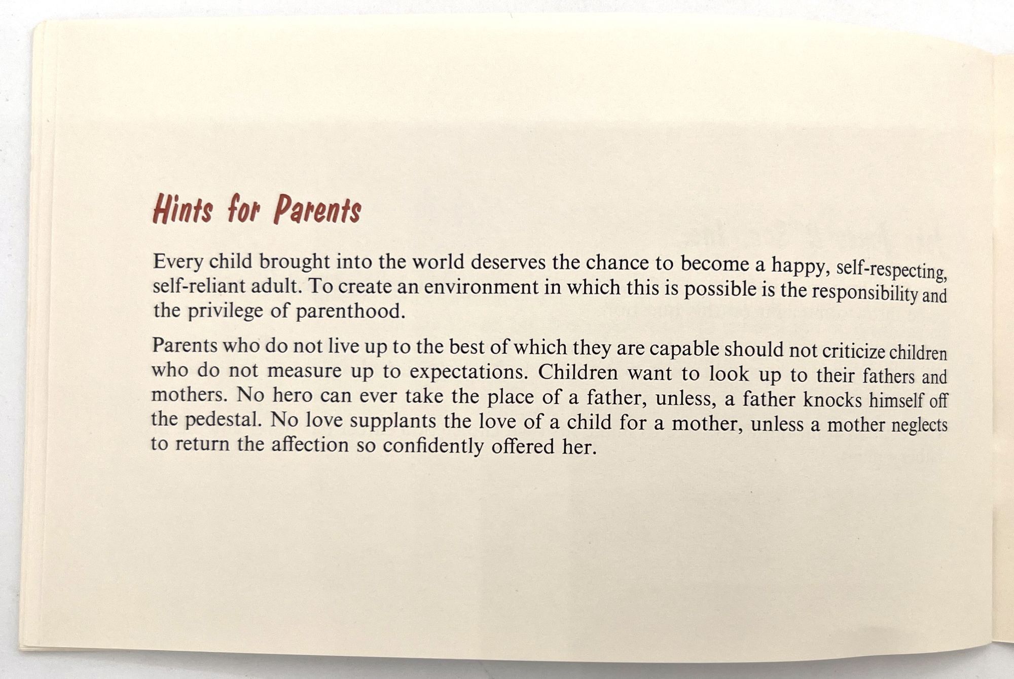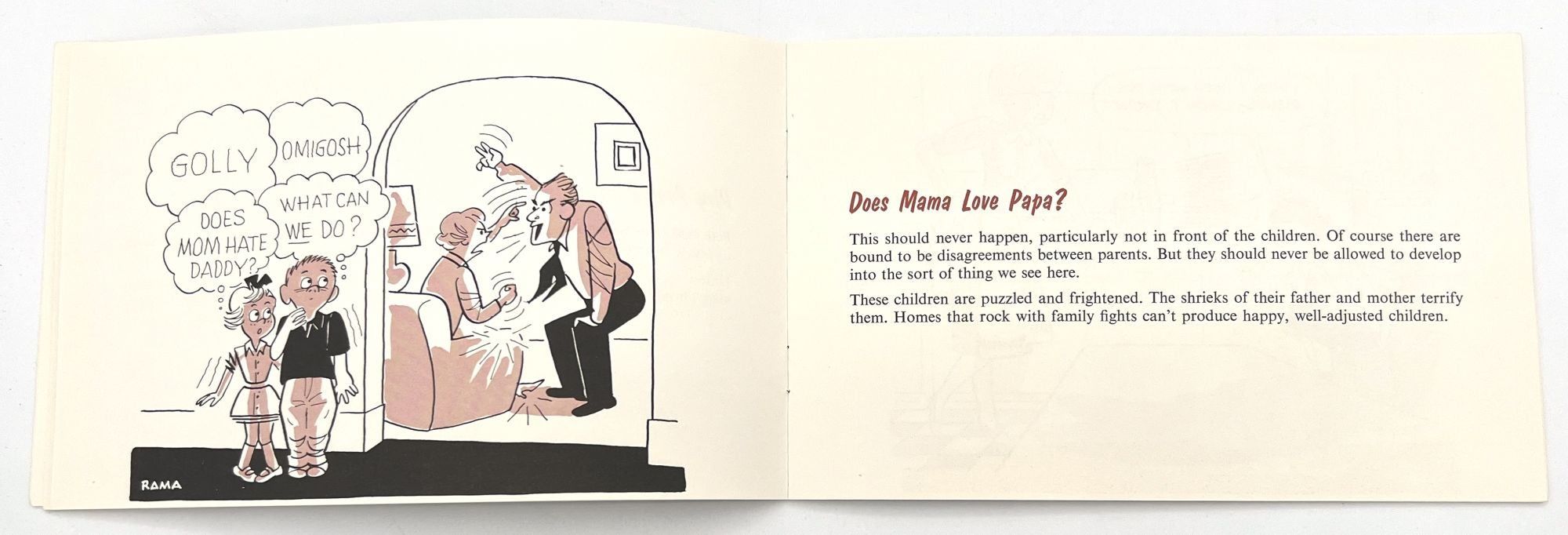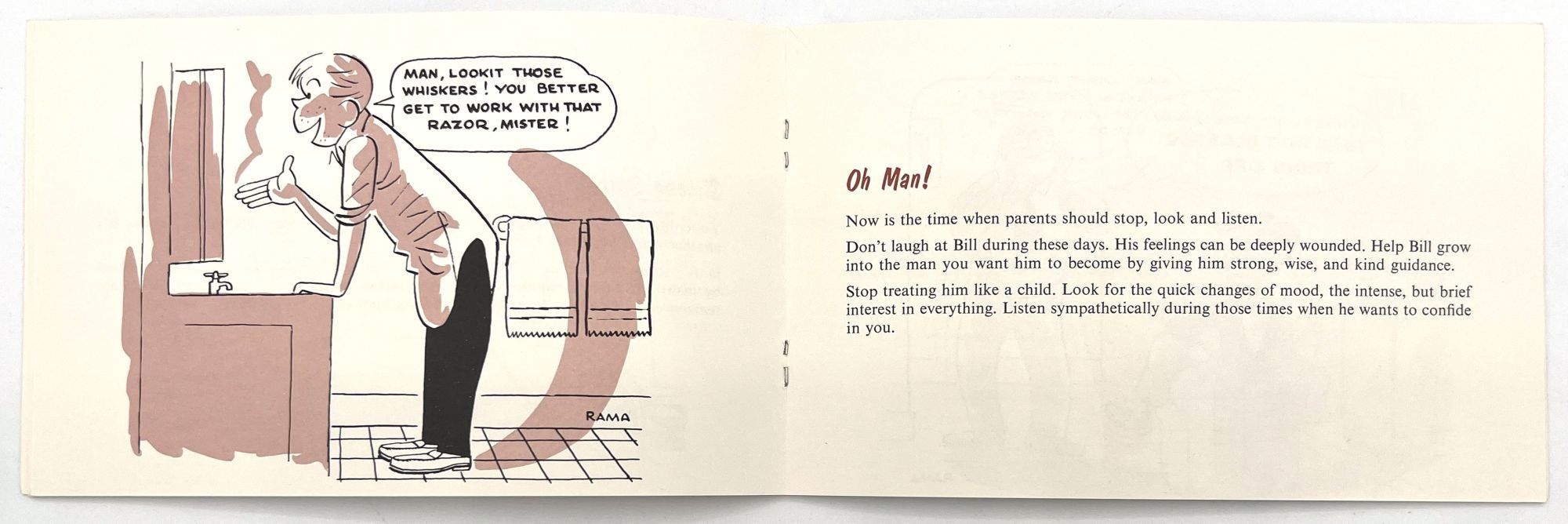 Hartford, Connecticut: The Connecticut Mutual Life Insurance Company, 1957. Near-fine.. A parenting advice booklet published by the Connecticut Mutual Life Insurance Company for families on the topic of growing up, from early childhood to teenage-hood. Describes itself as "the result of letters from troubled parents and their teen-age children" seeking guidance. Features amusing cartoon illustrations of different hypothetical situations to bring humor to the subject. Advises parents to be patient and understanding, and to never bicker in front of children; also asks them to empathize with their children. Part of a series on social issues facing Connecticut families in the 1950s. Single vol. (5" by 8"), pp. 28, illus., stapled in original illus. wrps.