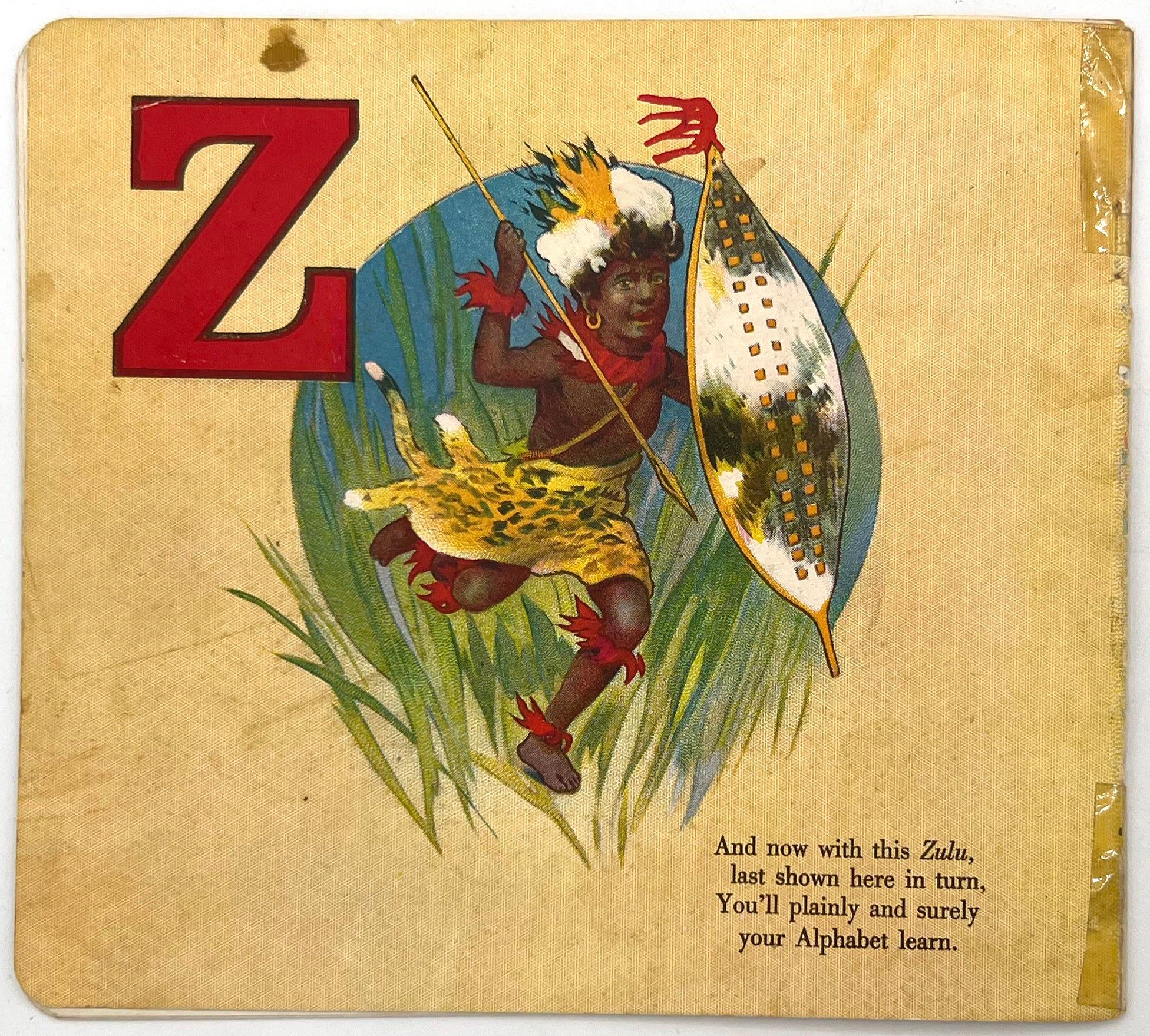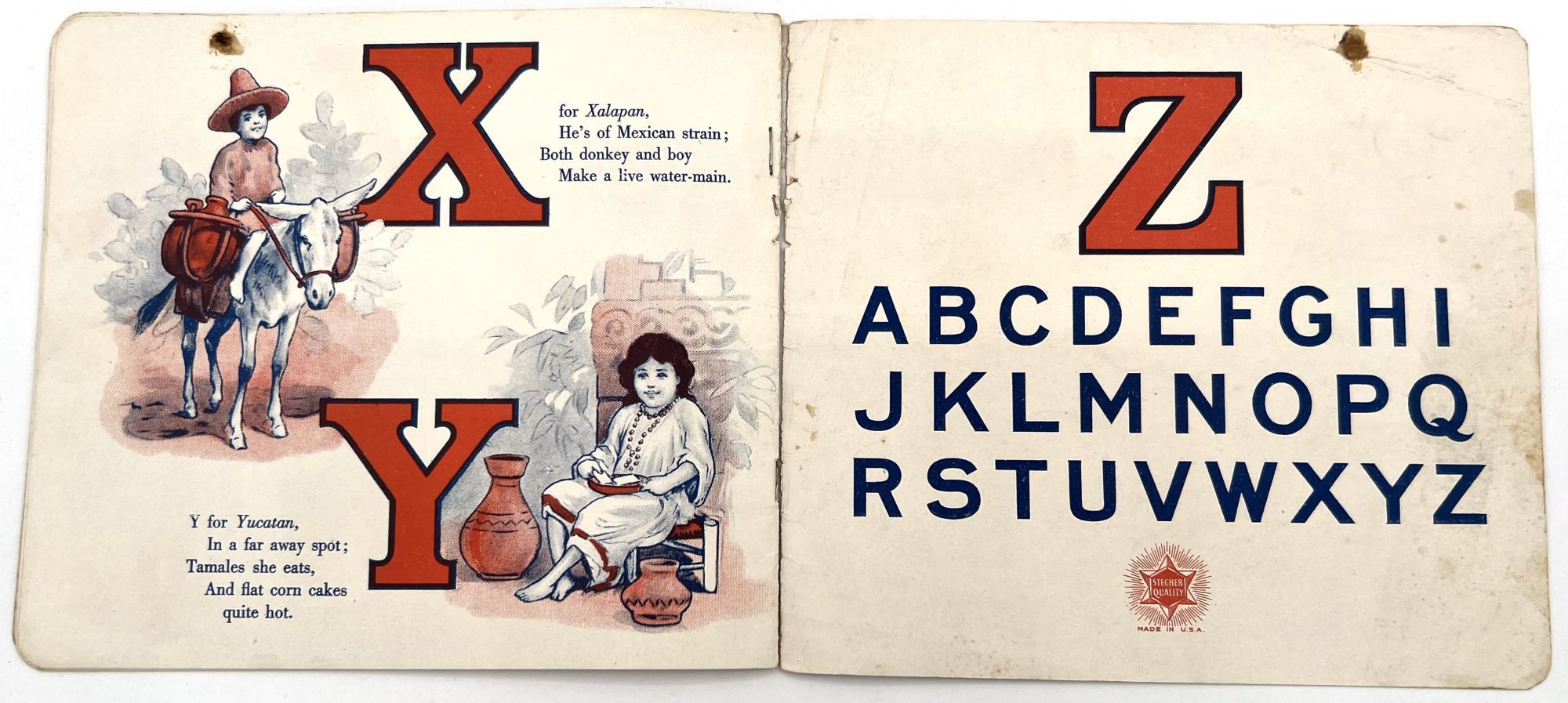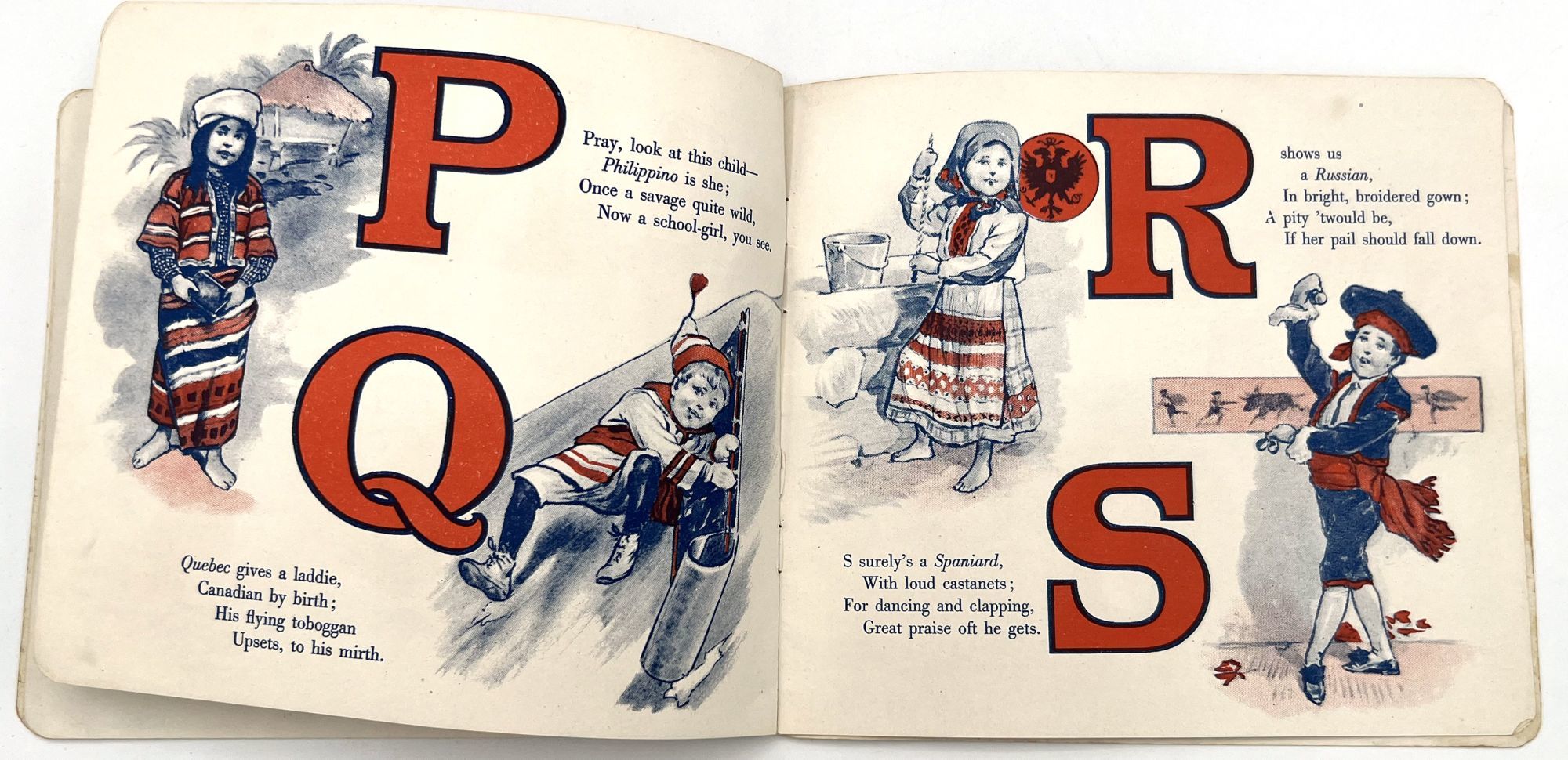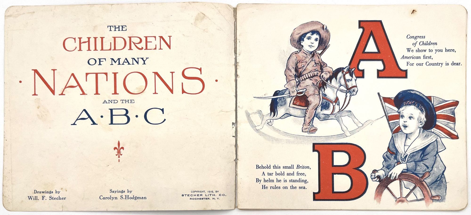 Rochester, New York: Stetcher Lith. Co, 1916. Fair. Wrappers detached with modern tape repair. Light soiling.. An illustrated ABC book for early readers, published during WWI to promote international friendship and tolerance to little ones. Each letter is paired with a different nation, and has an accompanying rhyme and an illustration of a child in a representative costume. It ranges from A for American ("A congress of Children We show to you here, American first, For our Country dear") to Z for Zulu ("And now with this Zulu, last shown here in turn, You'll plainly and surely your Alphabet learn"). Note the gentle, and the not so gentle, racial and cultural stereotypes at play in this book. J for Japan, for example, reads, "Japan's little lady Is Yellow of skin. Korea, her playmate, To her is akin". Single vol. (6.75" by 7.5"), pp. [12], illus., in original illus. wrps. with rounded corners.