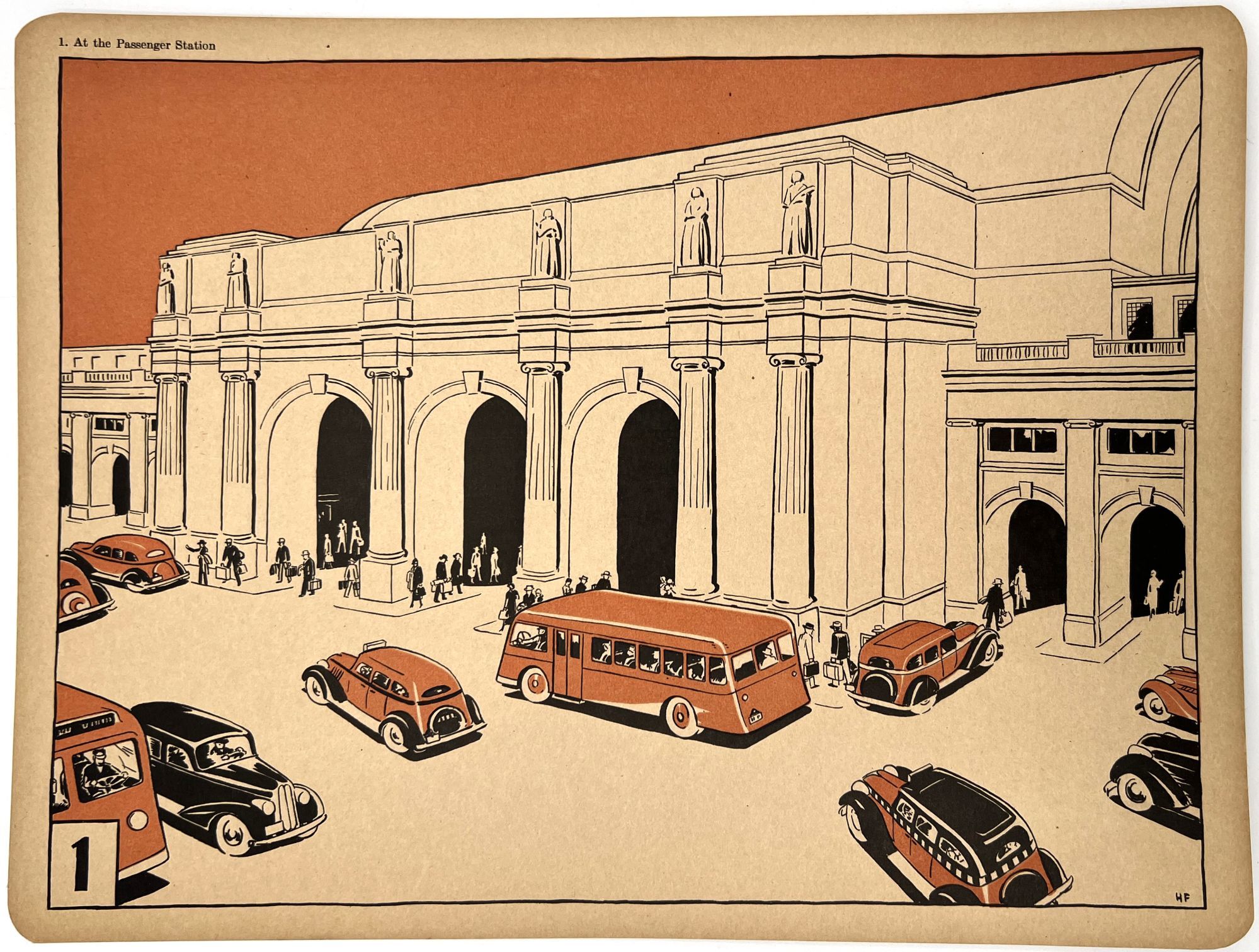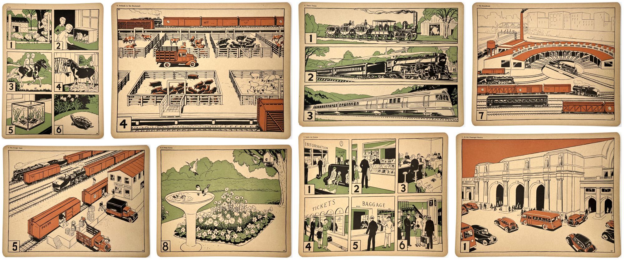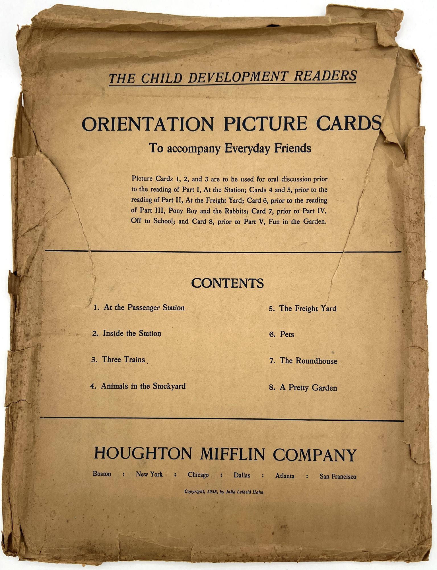 Boston, Massachusetts: Houghton Mifflin Company, 1935. Cards in very good to near-fine condition, with minor toning and dust soiling. Envelope in fair condition (worn with large tears). Cards only.. A complete set of "Orientation Picture Cards" to accompany "Everyday Friends", a 1935 children's book by Julia Letheld Hahn published by Houghton Mifflin. Hahn (1891-1942) collaborated with the publisher to make over a dozen stories for their “Child Development Readers” series. An educator would use the cards in tandem with the book, to reinforce different areas of learning that came up in the story (e.g. numbers, shapes, vocabulary). While reading aloud from the book, each card could be held up for the class to see. This set, which is complete, includes the following picture cards: “At the Passenger Station”; “Inside the Station”; “Three Trains”; “Animals in the Stockyard”; “The Freight Yard”; “Pets”; “The Roundhouse”; and “A Pretty Garden”. Each card measures approx. 11” by 14”, and they are housed in the original printed envelope. Offered together here with a mixed set of twenty-four (24) cards belonging to other sets in the Child Development Readers series.