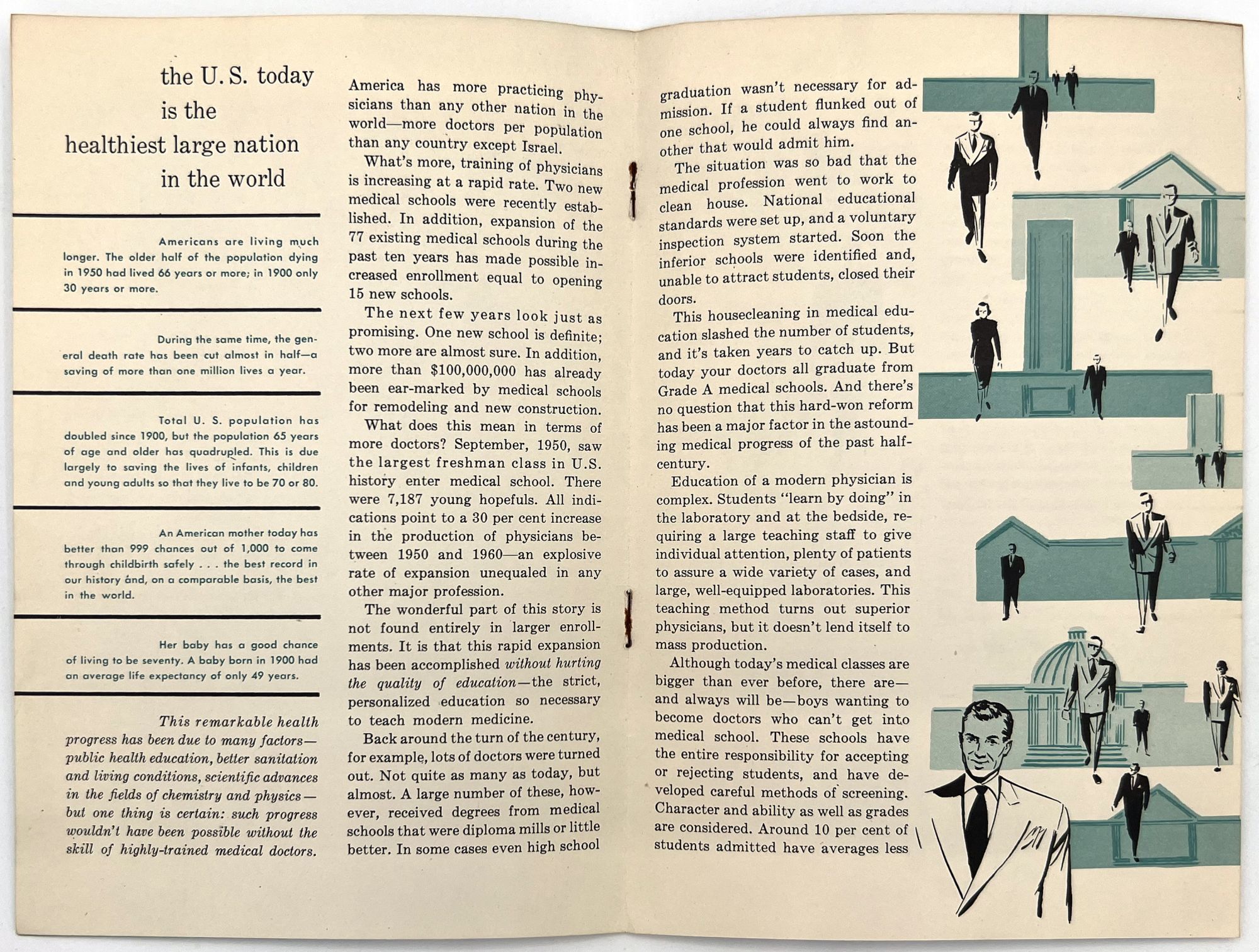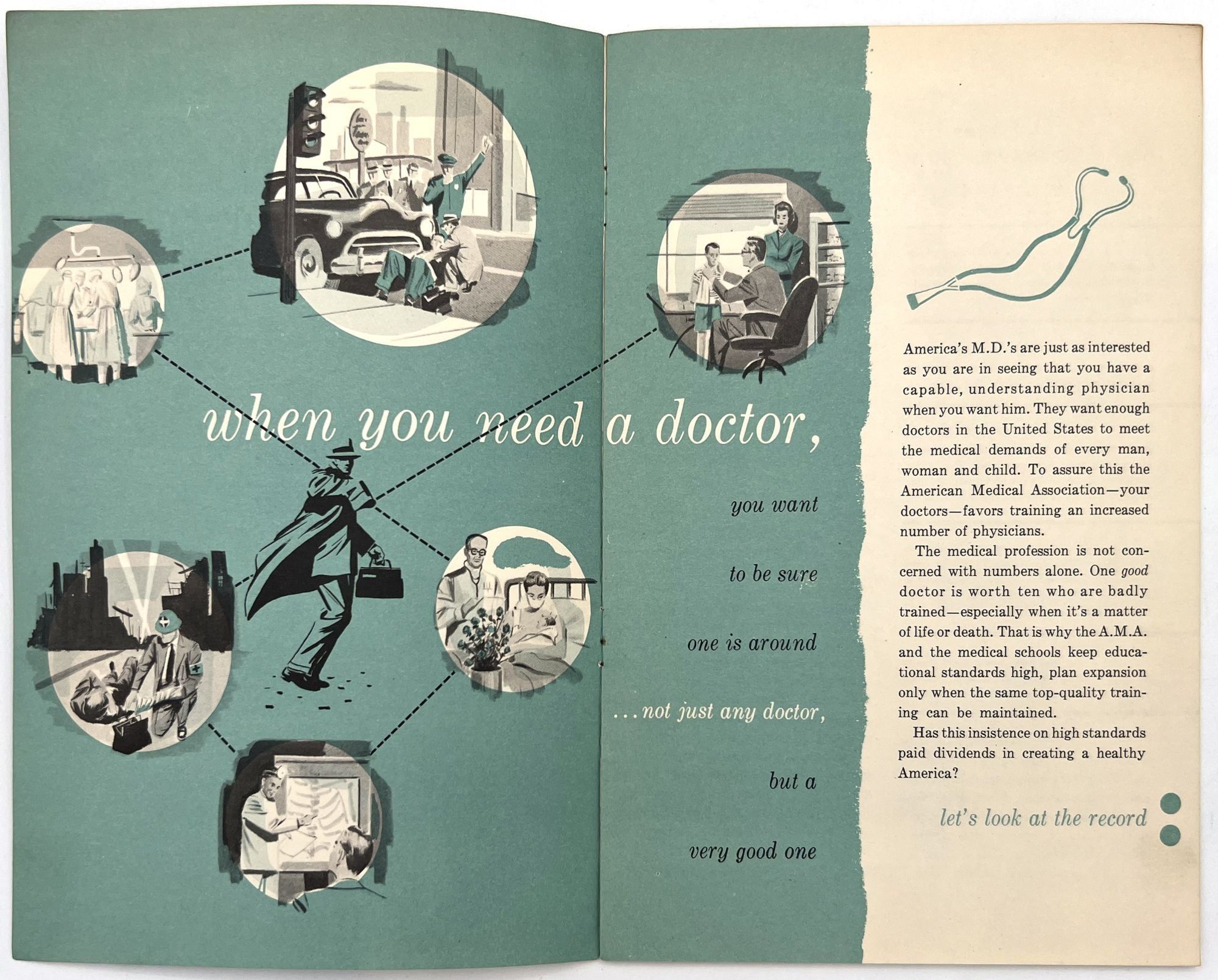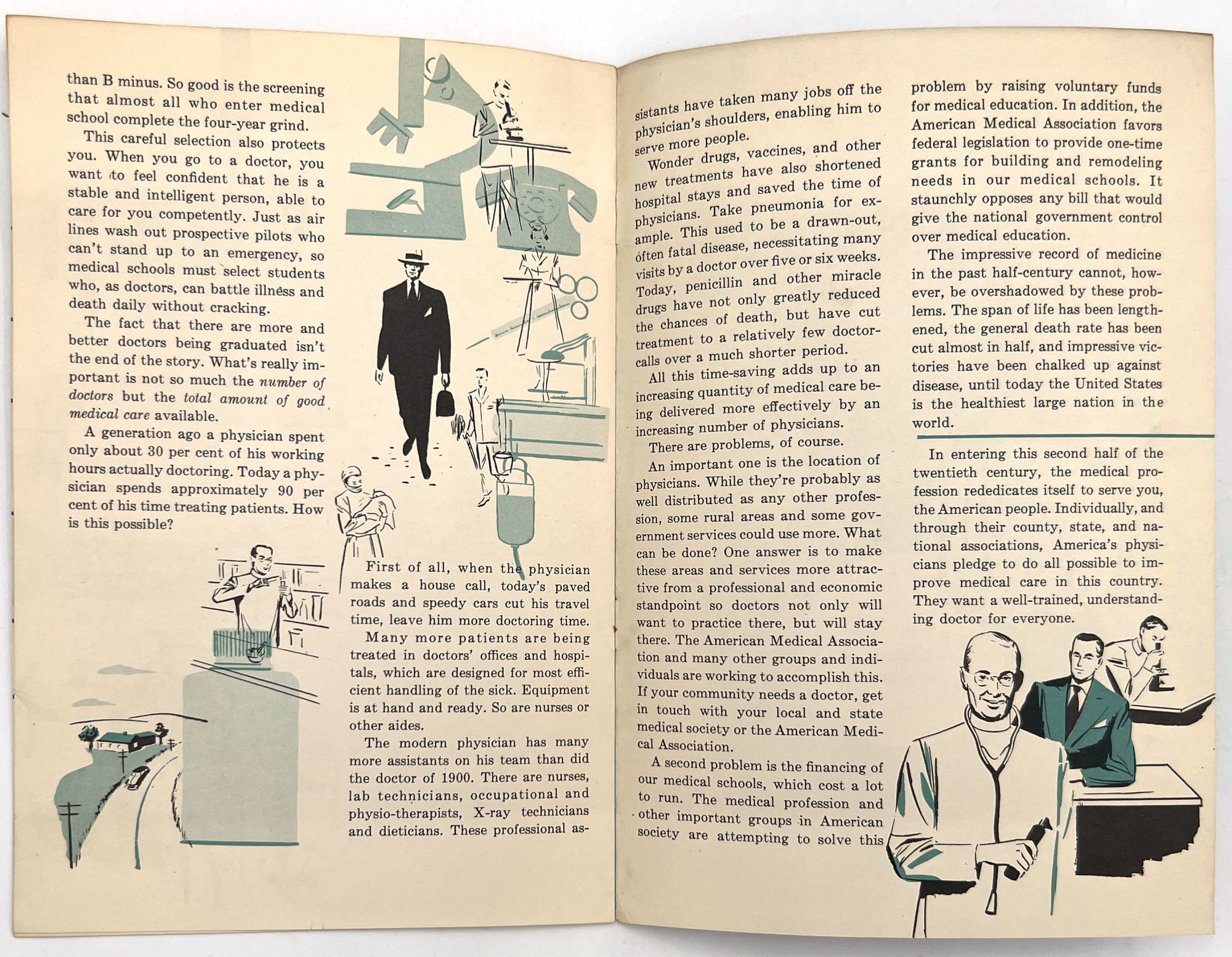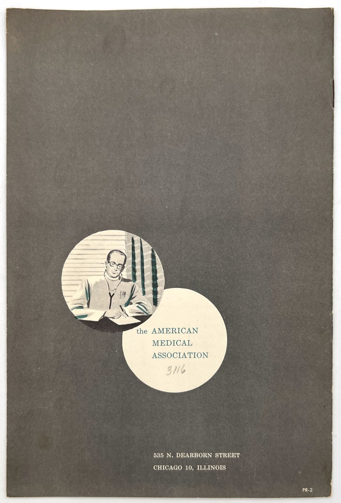 Chicago, Illinois: American Medical Association, 1950. Very good. Light toning, dust soiling.. A promotional booklet for the American Medical Association, published for and distributed to American families in order to highlight the importance of professional medical care for all ages. Explains how the American Medical Association ensures the profession keeps high standards for all doctors in order to make the U.S. "the healthiest large nation in the world". Highlights leaps in innovation, scientific research, and a growing medical workforce. An interesting look into how medical professionals were revered at this time as leaders. Single vol. A generation ago a physician spent only about 30 percent of his working hours actually doctoring. Today a physician spends approximately 90 percent of his time treating patients. How is this possible? First of all, when the physician makes a house call, today's paved roads and speedy cars cut his travel time, leave him more doctoring time...A different time.