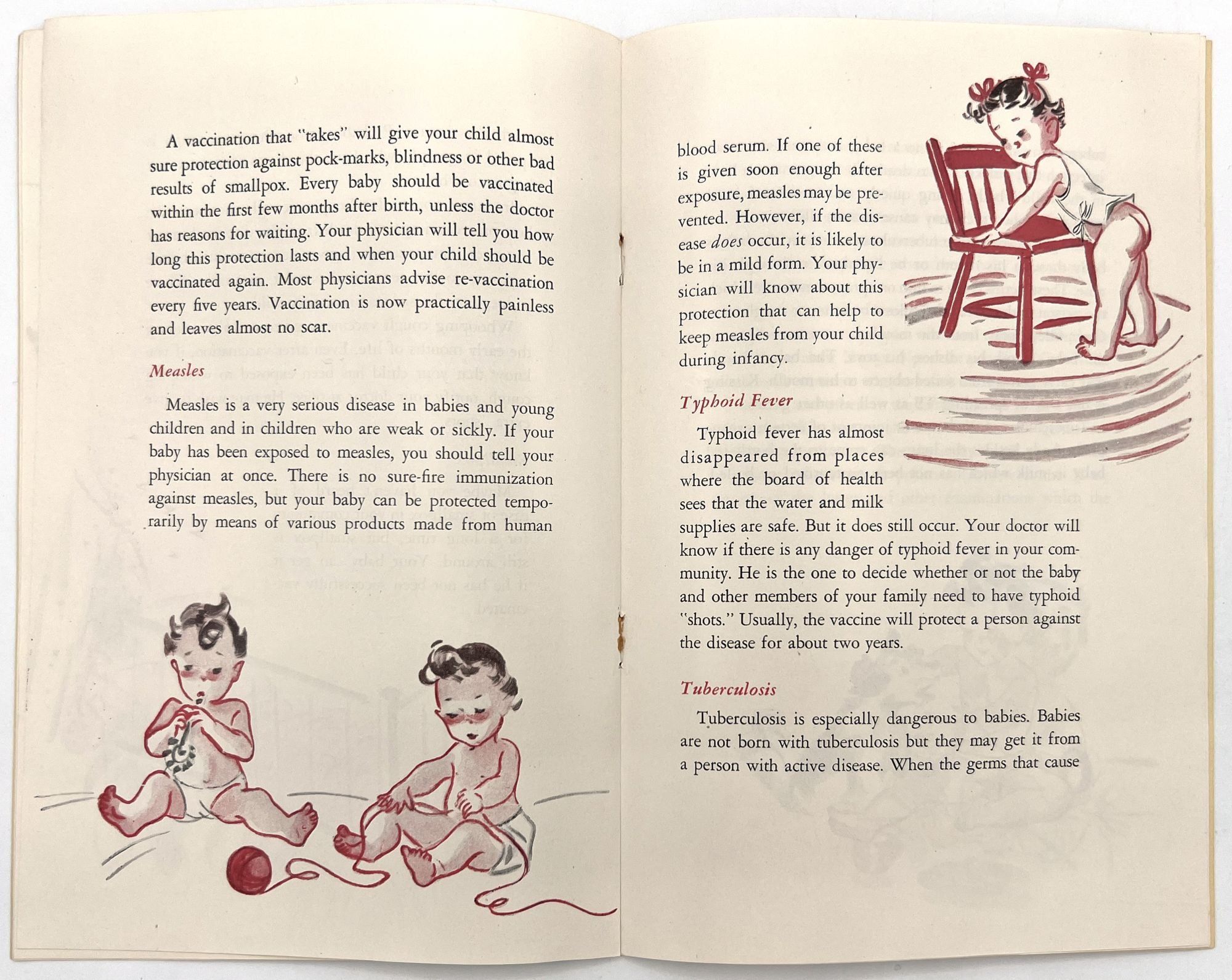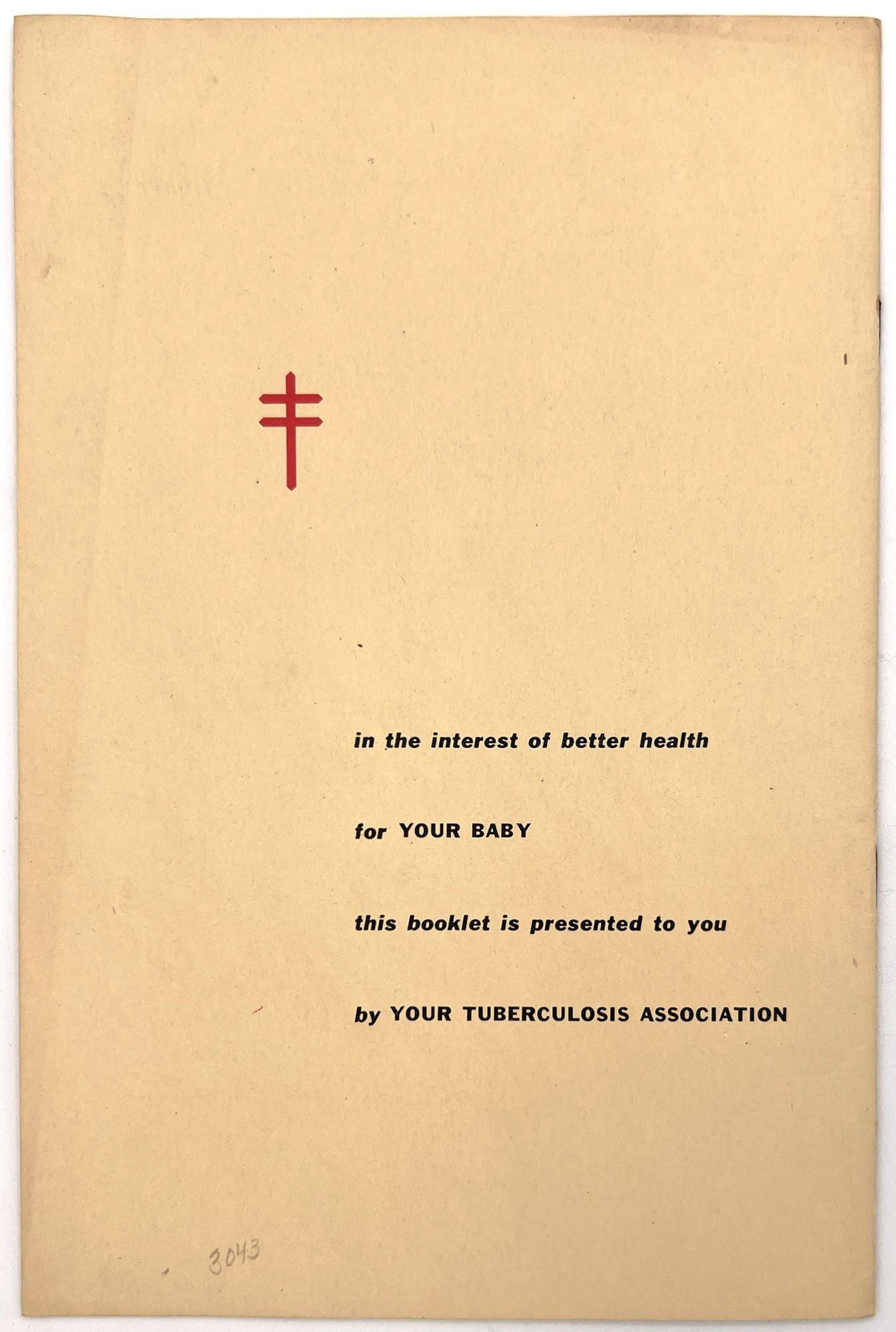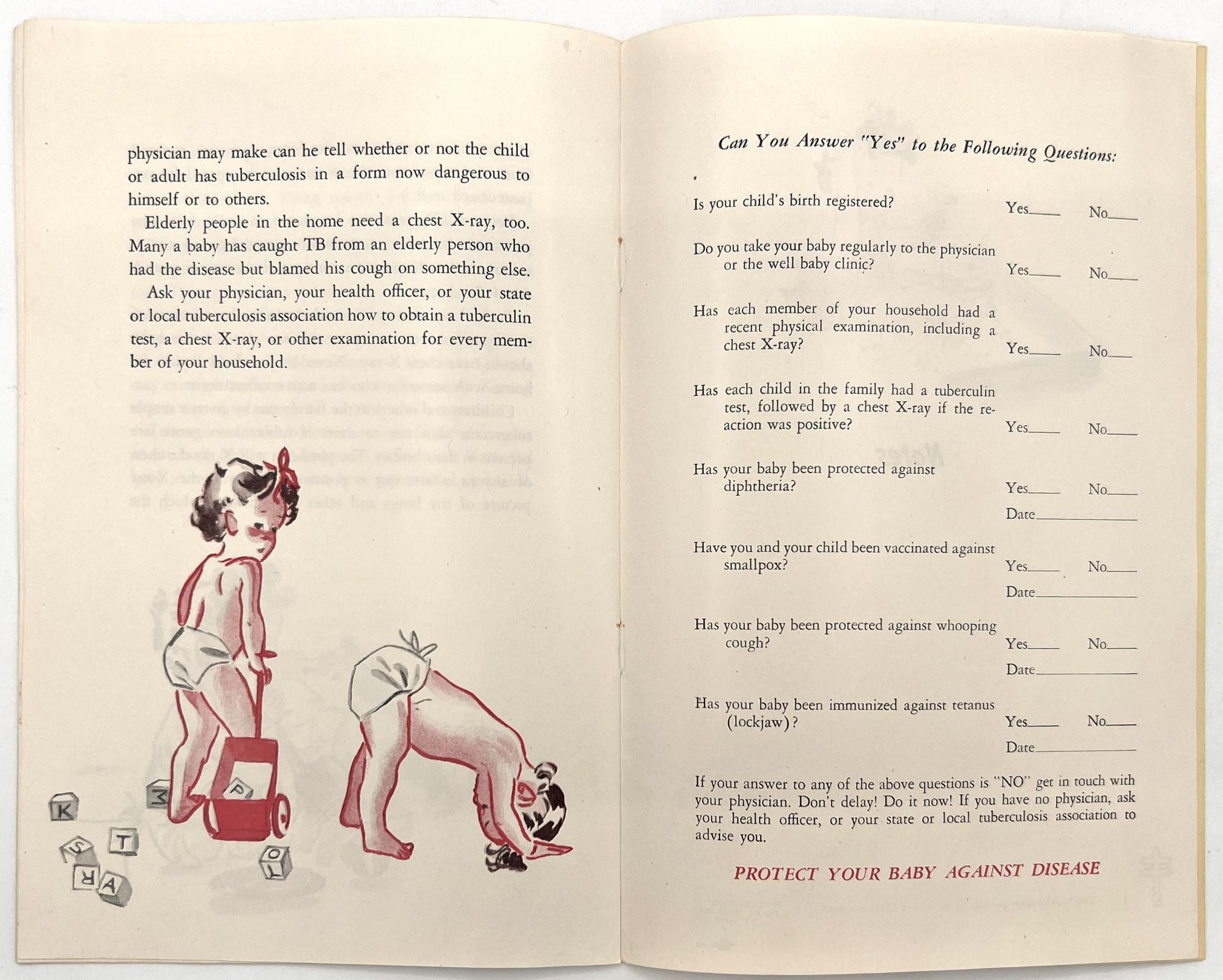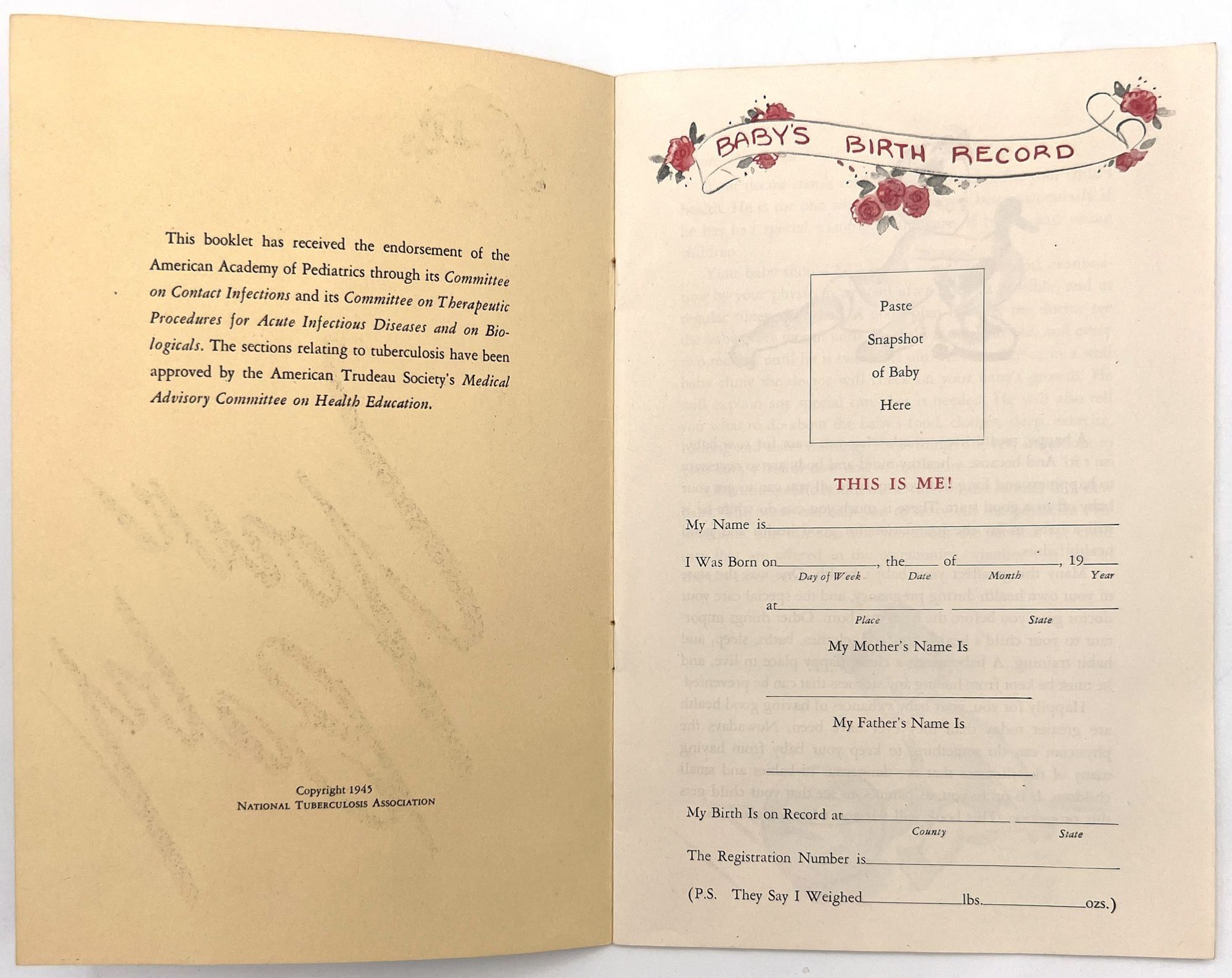 N.pl: National Tuberculosis Association, 1947. Very good to near-fine. Light rust staining from staples.. A printed booklet offering new parents important information about childhood diseases, published by the National Tuberculosis Association. Includes a blank "birth record" for parents to record information such as name, date of birth, weight, and registration number, as well as space to paste a snapshot of the baby. Offers information on the following childhood diseases: Diphtheria, Tetanus, Whooping Cough, Smallpox, Measles, Typhoid Fever, and Tuberculosis. Discusses the importance of health and hygiene, visiting your physician, and vaccination. Also includes a quiz in the back for parents to take to see if their child is protected with questions such as, "Has your baby been immunized against tetanus (lockjaw)?". Third edition, first published in 1945. Single vol. (9" by 6"), pp. [16], illus., in original illus. wrps with stylized typography on front with illustration of infant on front. Unlike a traditional "baby book" this book only includes basic birth demographics and immunization information, the remainder of the book is educational.