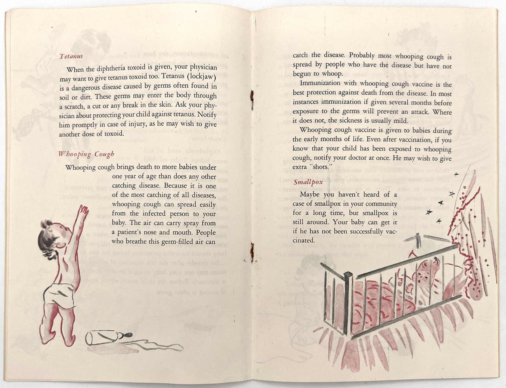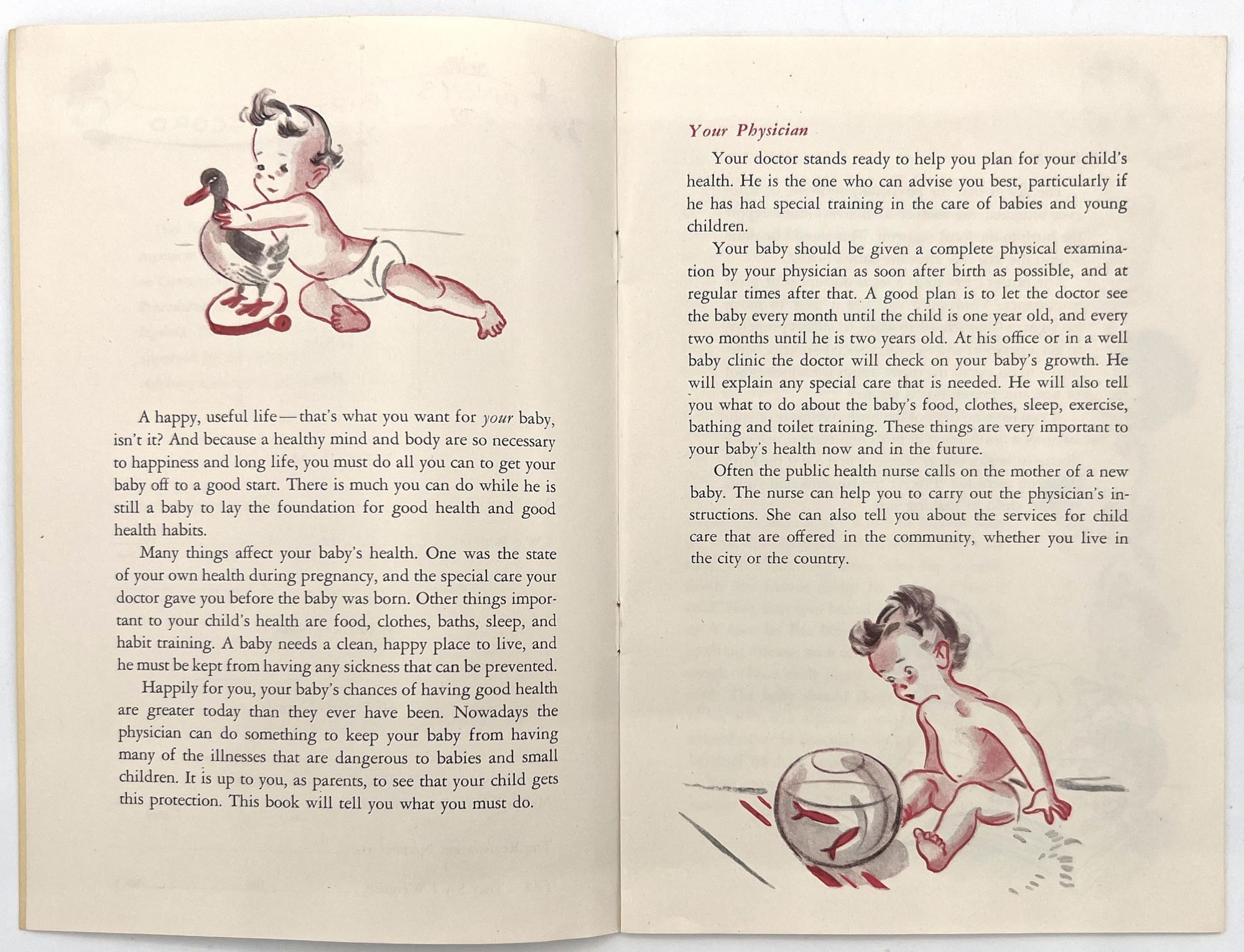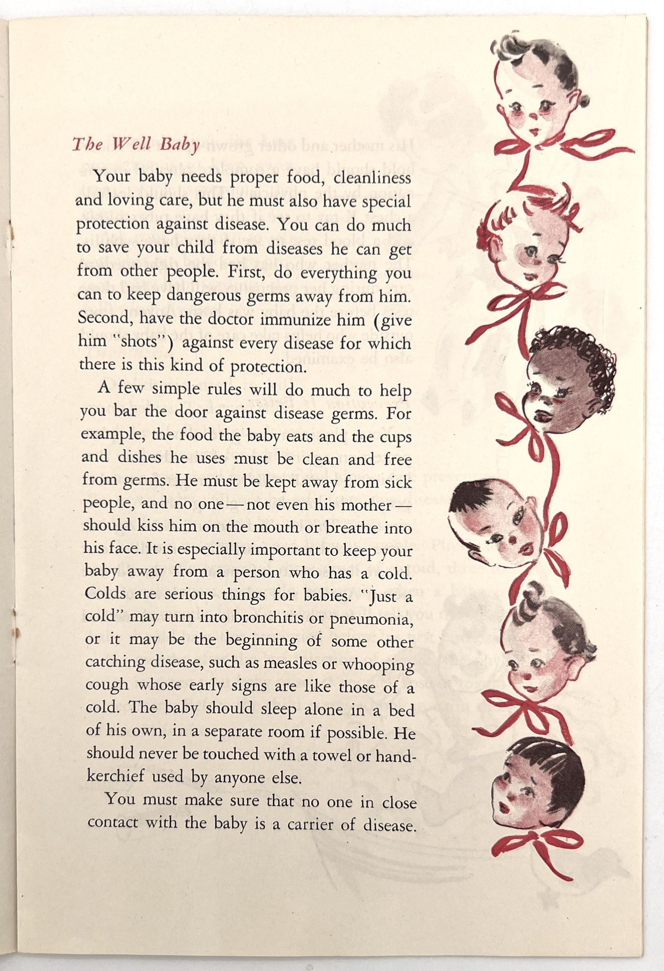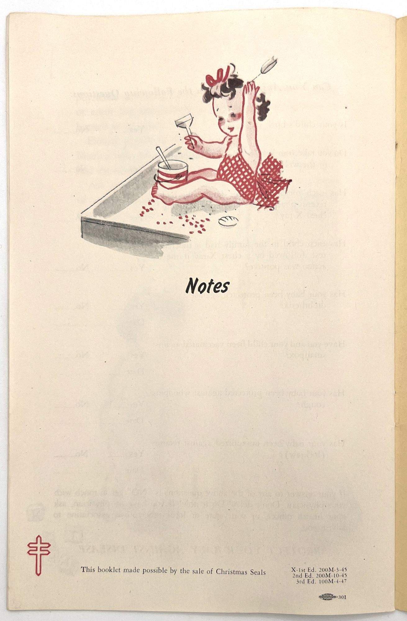 N.pl: National Tuberculosis Association, 1947. Very good to near-fine. Light rust staining from staples.. A printed booklet offering new parents important information about childhood diseases, published by the National Tuberculosis Association. Includes a blank "birth record" for parents to record information such as name, date of birth, weight, and registration number, as well as space to paste a snapshot of the baby. Offers information on the following childhood diseases: Diphtheria, Tetanus, Whooping Cough, Smallpox, Measles, Typhoid Fever, and Tuberculosis. Discusses the importance of health and hygiene, visiting your physician, and vaccination. Also includes a quiz in the back for parents to take to see if their child is protected with questions such as, "Has your baby been immunized against tetanus (lockjaw)?". Third edition, first published in 1945. Single vol. (9" by 6"), pp. [16], illus., in original illus. wrps with stylized typography on front with illustration of infant on front. Unlike a traditional "baby book" this book only includes basic birth demographics and immunization information, the remainder of the book is educational.