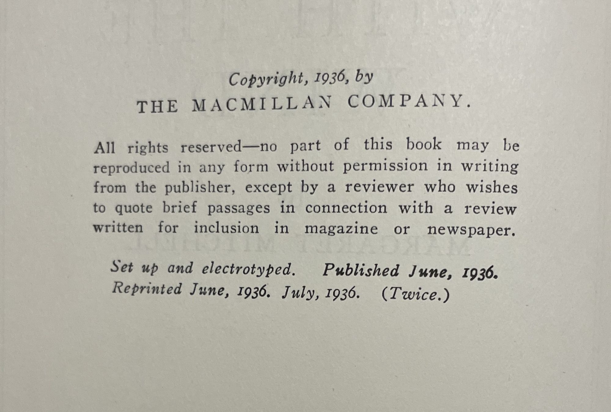 NY: Macmillan, 1936. 1st Edition. Hardcover. Very Good/Lacking Dustjacket. First edition, fourth printing - copyright page states " .. Published June 1936. Reprinted June 1936. July 1936. Twice. " Lacking dustjacket. Some modest darkening to gray cloth. front hinge tender, still solidly bound, squared, uncocked copy, internals quite nice, no owner names, i inscriptions or bookplates. AMERICAN SOUTH CIVIL WAR.