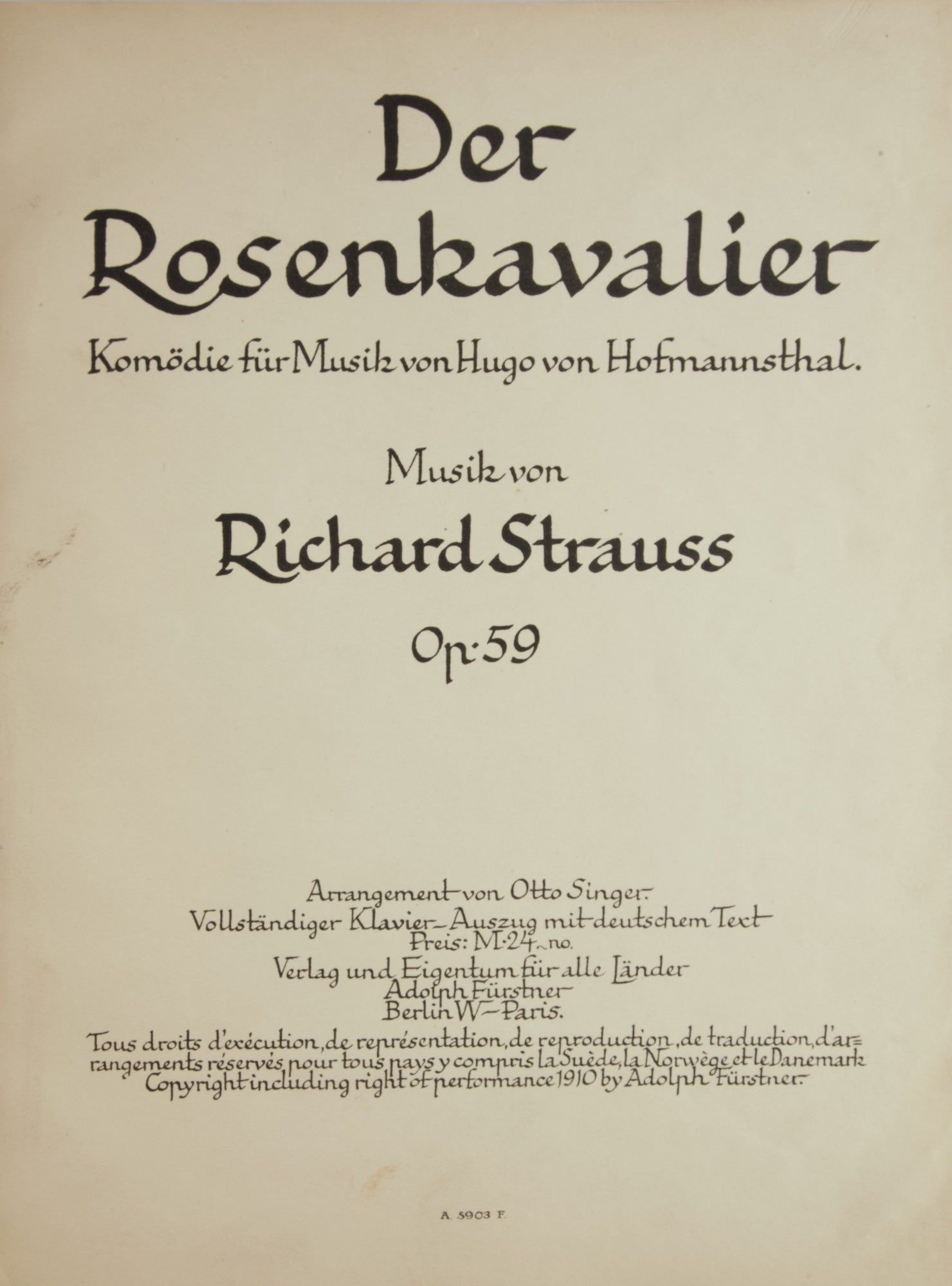 Der Rosenkavalier Komodie Musik von Hugo von Hofmannsthal ... Op. 59. Arrangement von Otto Singer. Vollstandiger Klavier-Auszug mit deutschem Text. Preis: M.24 no