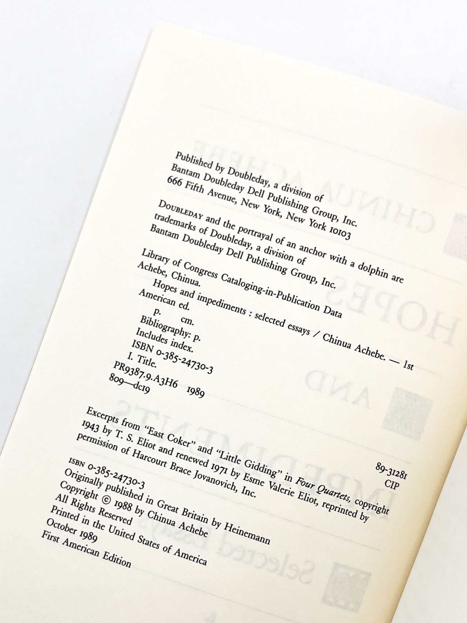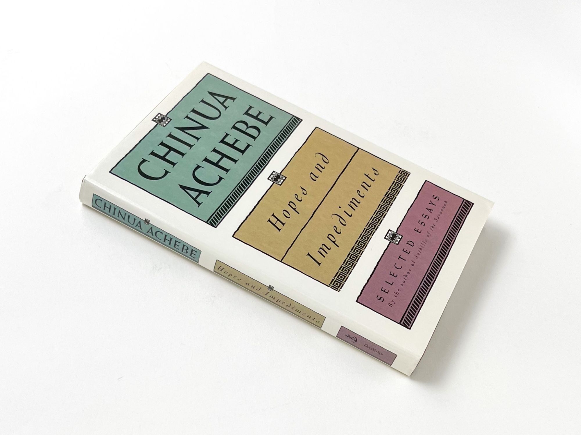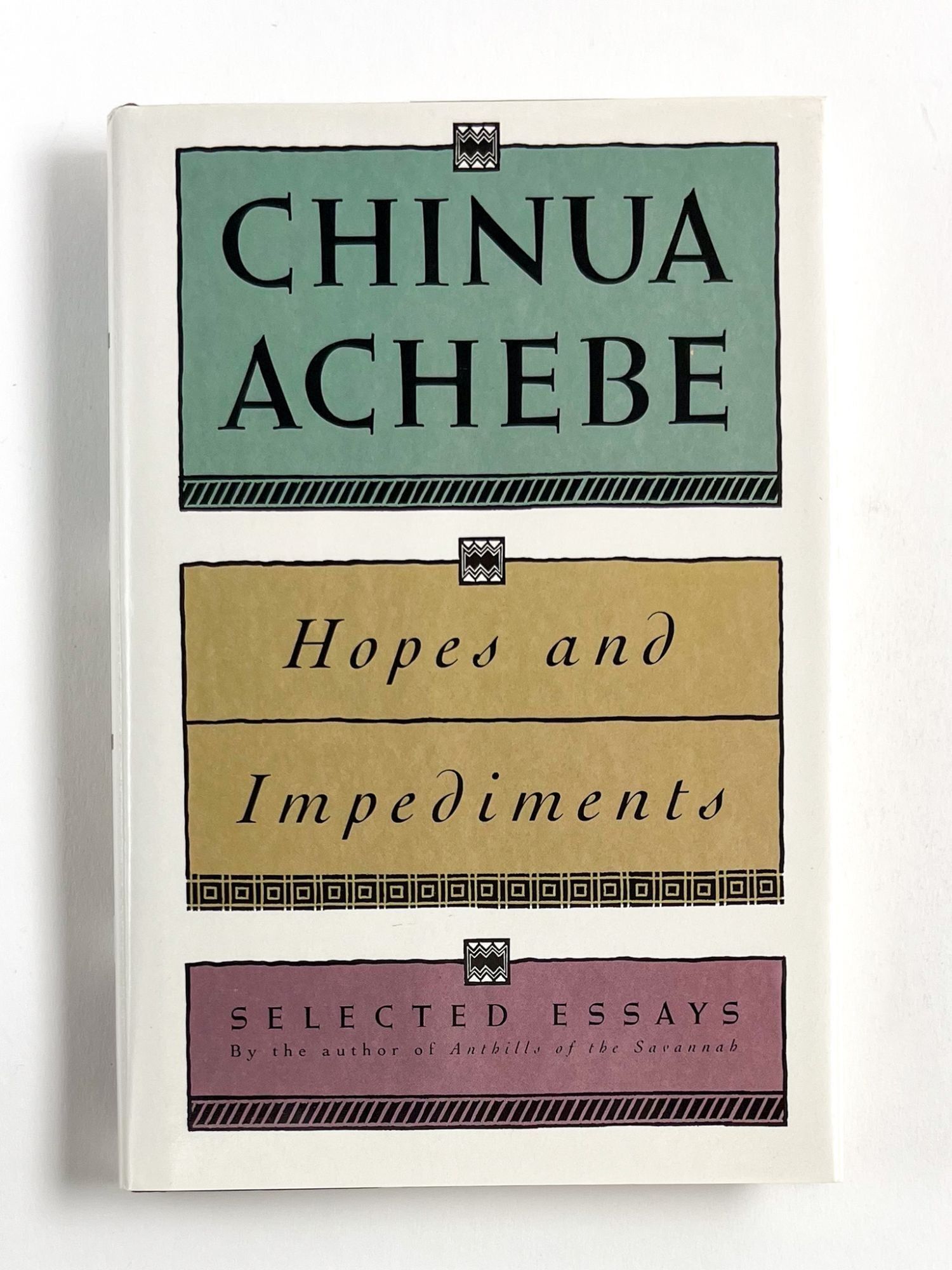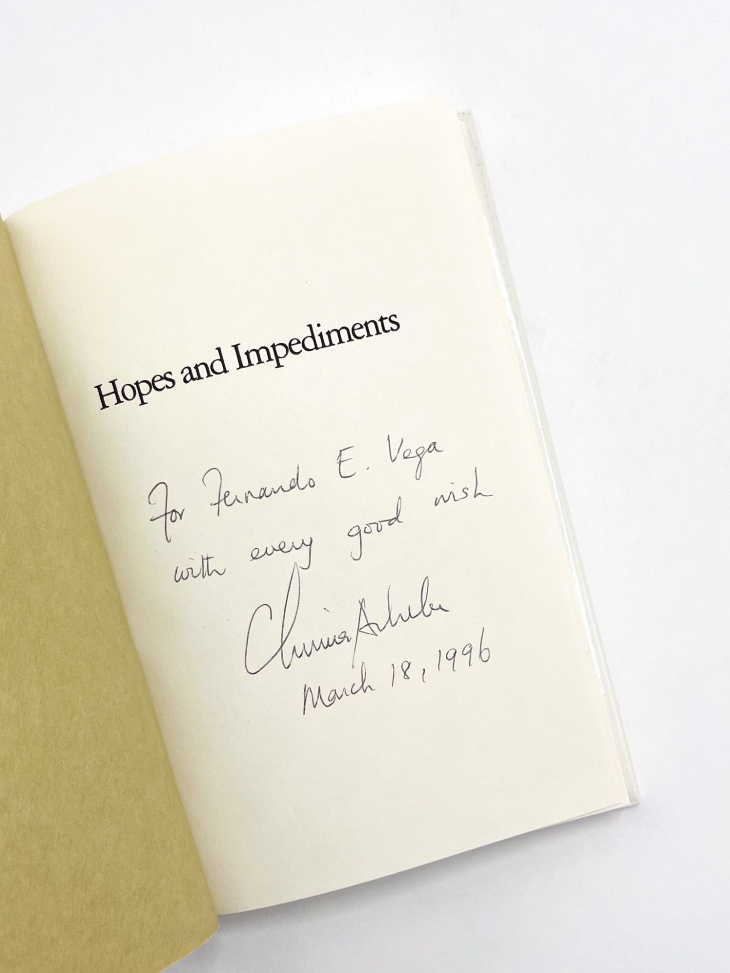 New York: Doubleday, 1989. First printing. Very good plus in near fine jacket.. Inscribed first US edition of the celebrated Nigerian author's book of essays, including the much discussed "An Image of Africa: Racism in Conrad's Heart of Darkness" This important collection begins with a quintessential piece of postcolonial criticism, "An Image of Africa: Racism in Conrad's Heart of Darkness," which makes the apparently controversial claim that Conrad's depiction of Africa and its natives was inherently racist — much to the chagrin of critics and contemporaries who found themselves largely unable (or perhaps unwilling) to reconcile such a designation with what they believed to be the aesthetic merits of Conrad's work. A sharp copy with a warm inscription. 8.25'' x 5.5''. Original half-cloth, blue-grey paper boards with green decorative stamping to front, silver-lettered spine. In original unclipped ($17.95) color pictorial jacket. Tan endpapers. xviii, 188 [2] pages. Inscribed by Achebe to half title: "For Fernando E. Vega / with every good wish / Chinua Achebe. March 18, 1996." Jacket with trace rubbing. Book with minor bumping to corners, faint toning to top edge, else fresh.
