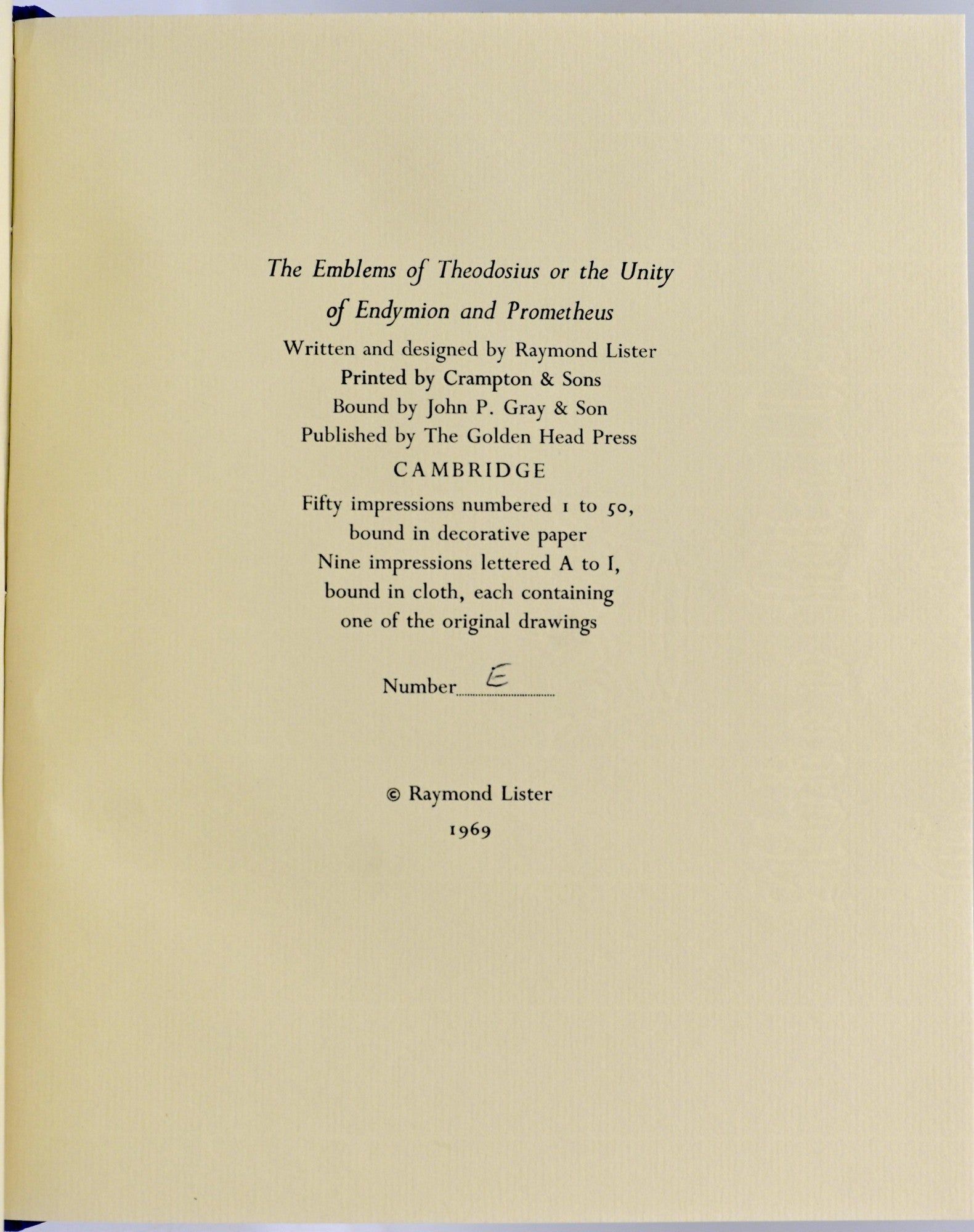 Cambridge: Golden Head Press, 1969. Limited Edition. Hard Cover. Near Fine binding. 4to; in the publisher’s blue cloth binding; (12) unpaginated pages; with 9 drawings by Raymond Lister; a bit of wear to the edges; a trivial stain on the upper board; a couple of light scratches to the lower board.~~Nine impressions lettered A to I, containing one of the original drawings; this copy is impression E.; there is a broader limitation of 50 copies. Near Fine binding.