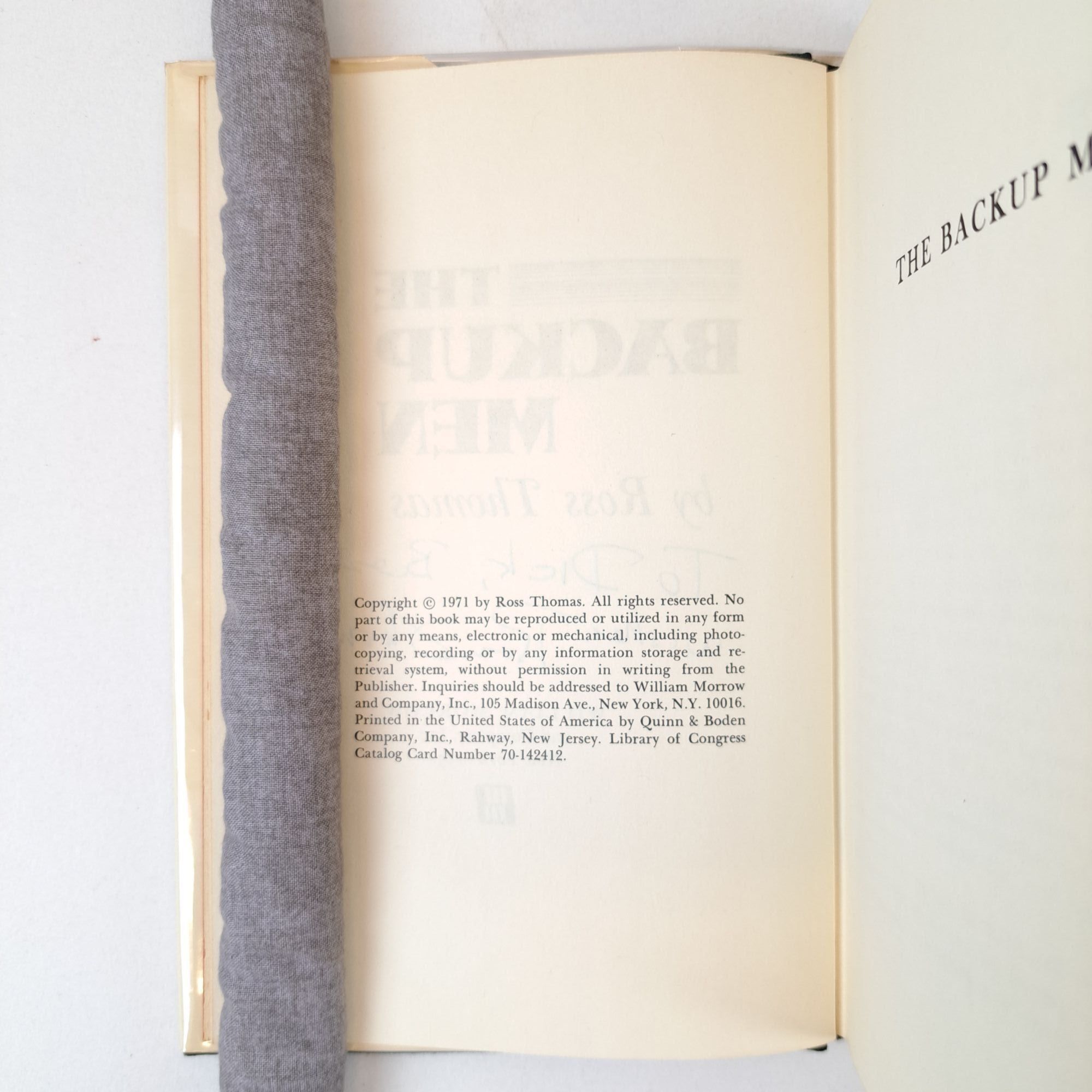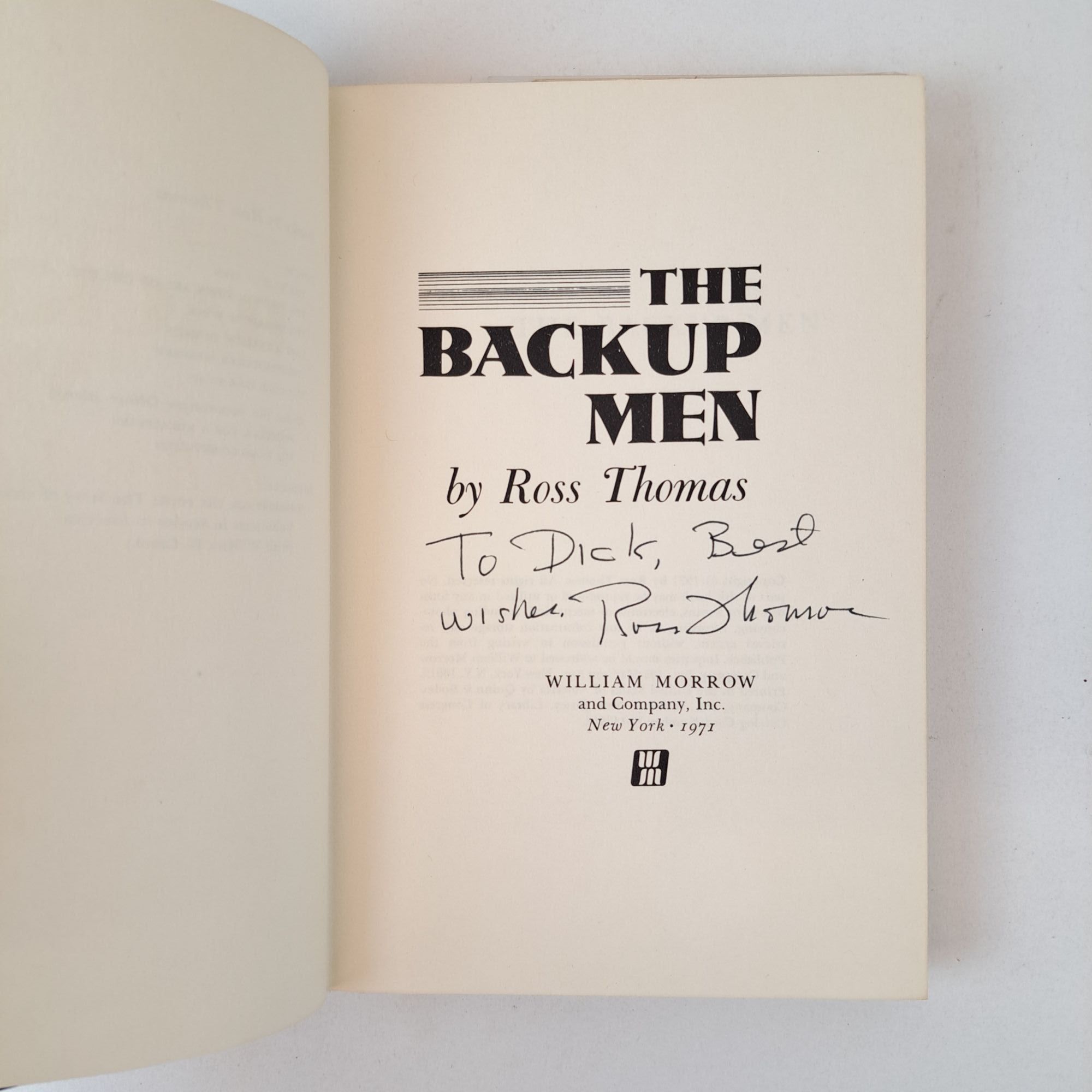 New York, New York: William Morrow, 1971. First Edition. Hardcover. Octavo, 222 pages. In Very Good minus condition with Very Good minus condition dust jacket. Spine is black with white lettering. Dust jacket protected by mylar covering, price clipped from front flap, has mild chipping along spine head and front head fore corner, faint smudging and mild age-toning along rear cover. Boards have mild shelving wear along spine head. Textblock has faint smudging along tail edge; free-endpapers have small specks of liquid staining. Inscribed "To Dick, Best Wishes" by Ross Thomas. Shelved Room C. 1400022. Special Collections.