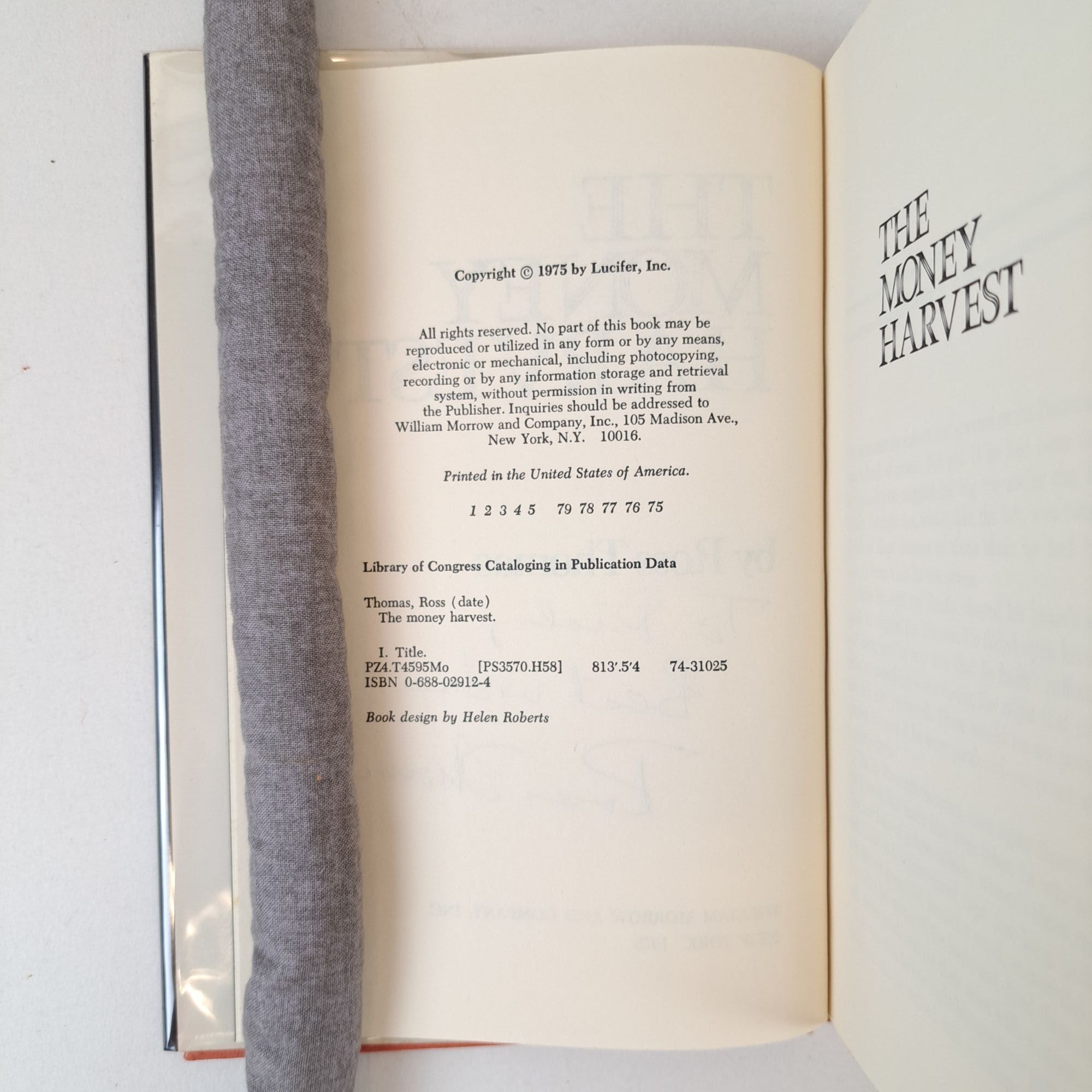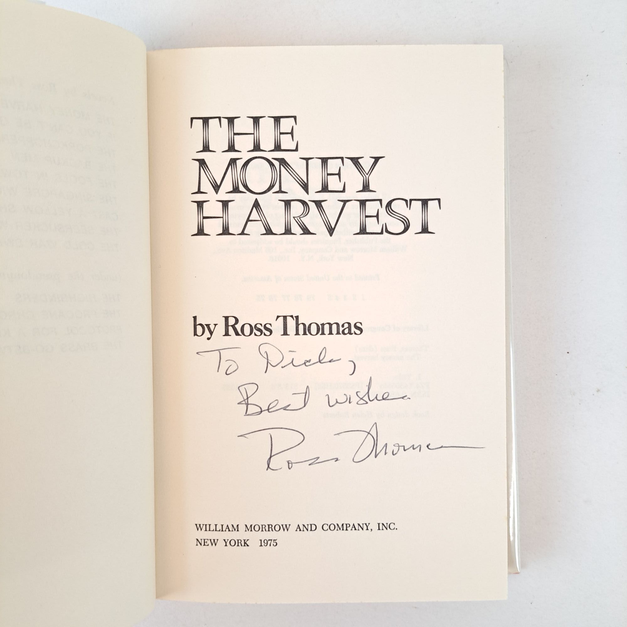 New York, New York: William Morrow and Company, 1975. First Edition, First Printing. Hardcover. Octavo, 311 pages. In Very Good condition with Very Good condition dust jacket. Spine is black with white and red lettering. Dust jacket protected by mylar covering, price uncut: "$8.95" on front flap. Boards have mild bumping to fore corners, mild shelving wear along extremities. Textblock edges have faint foxing. Inscribed "To Dick, Best Wishes" by Ross Thomas on title page. Shelved Room C. 1400033. Special Collections.