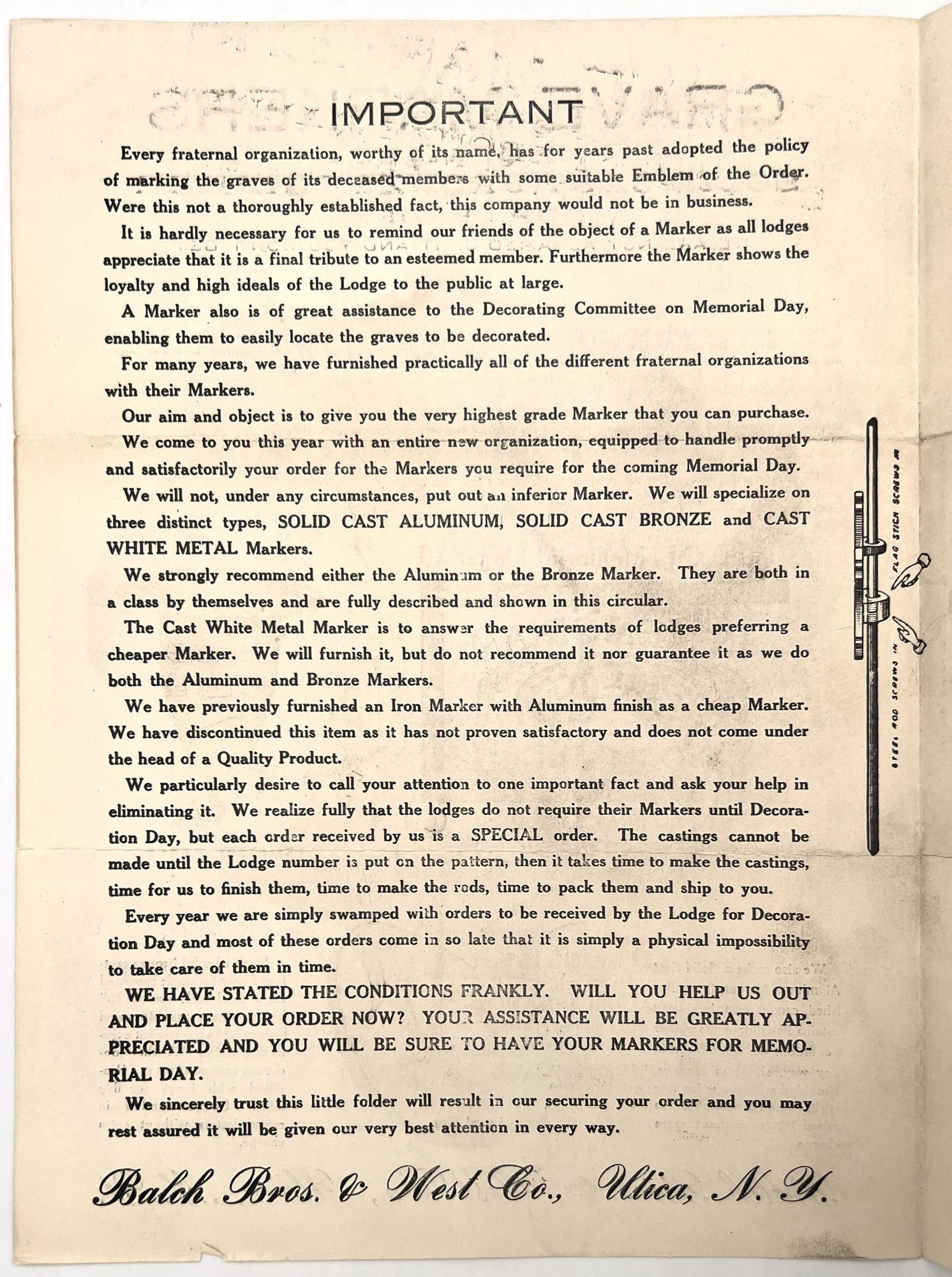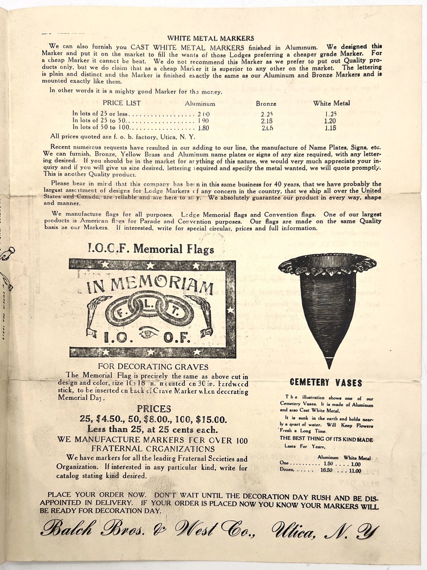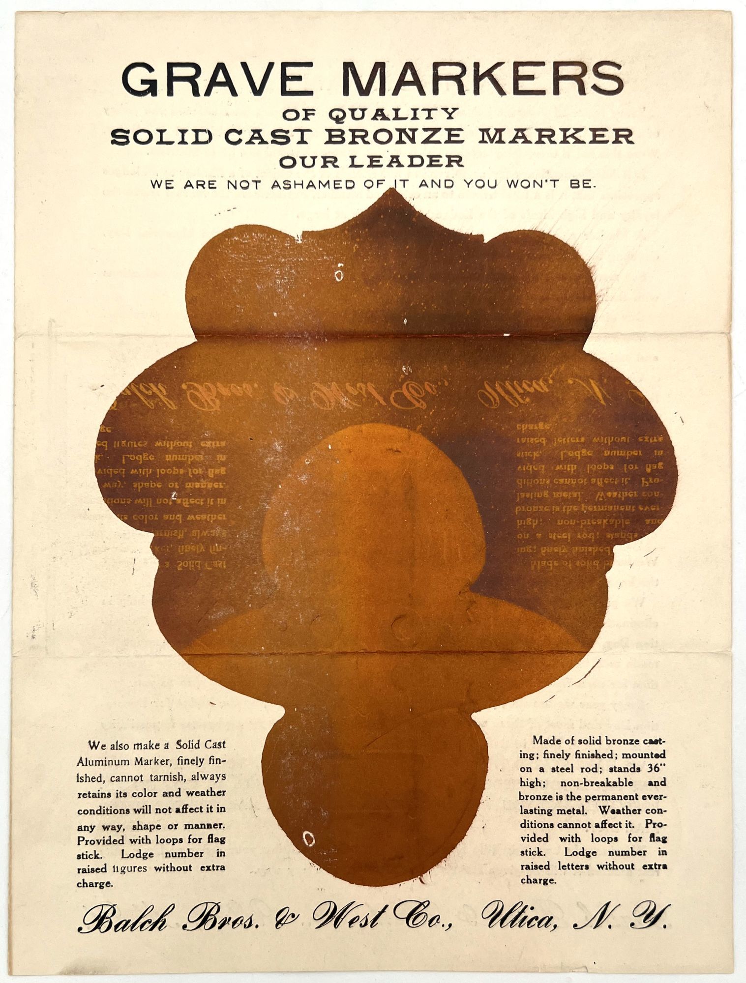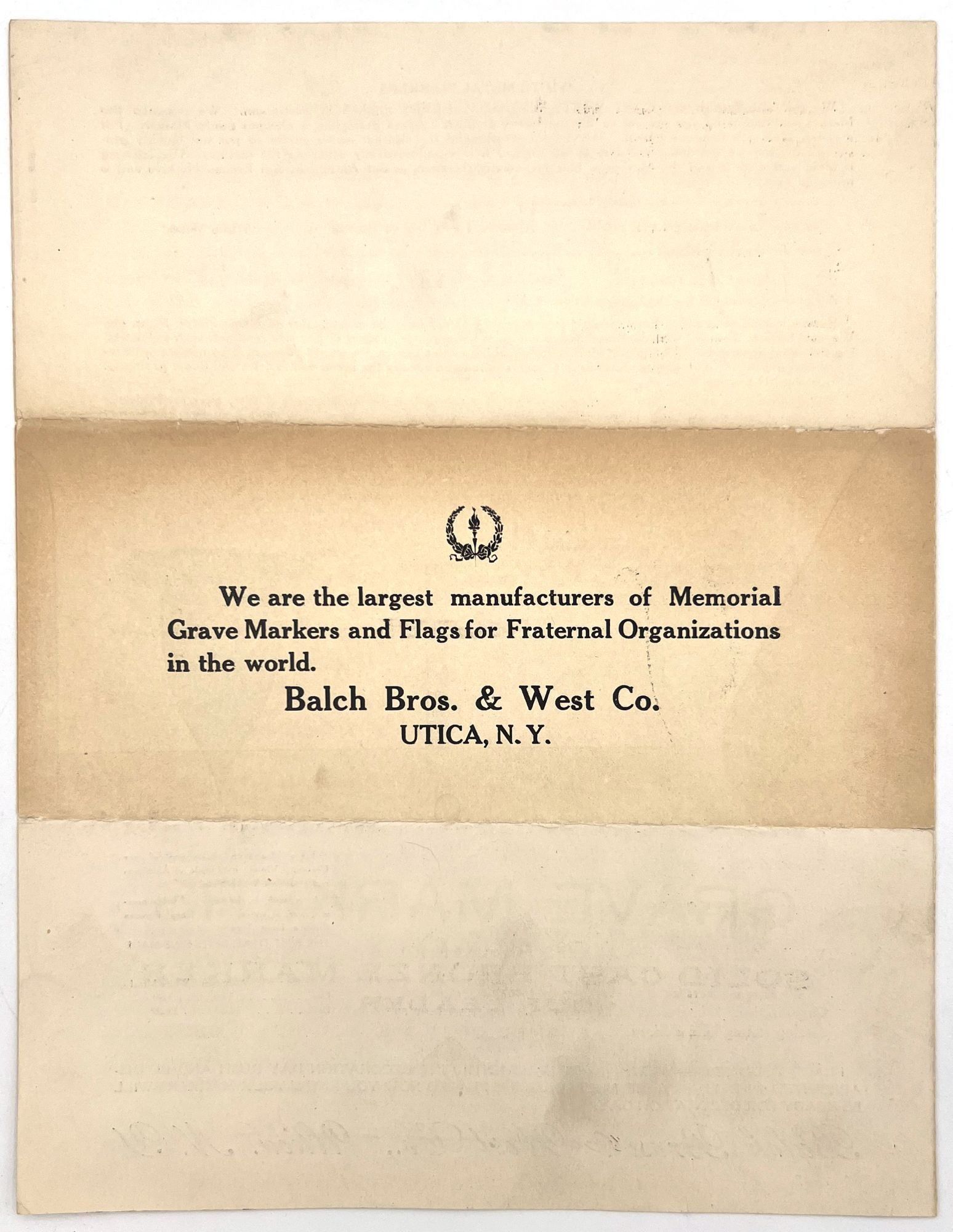 Utica, New York: Balch Bros. & West Co, 1900. Very good. Offsetting/discoloration to metallic paint. Letter folds.. Printed circular from Balch Bros. & West Co., the "largest manufacturers of Memorial Grave Markers and Flags for Fraternal Organizations in the world". Features a large printed illustration of one of their solid bronze grave markers for sale, printed in metallic ink. Advertises memorial flags for decorating graves, cemetery vases, metal markers in aluminum, bronze, and white metal. Illus. bifolium (12" by 9") printed in metallic paint, in-text illus. of products inside.