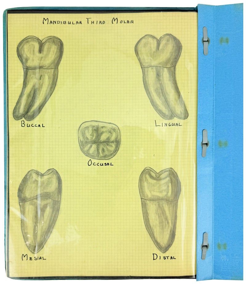 United States, 1970. Very Good. United States: n.d., ca. 1970s. Quarto (29cm); blue card post-bound binder with typescript label to upper cover; [8]ll. of clear plastic sleeves containing sixteen leaves of yellow grid paper featuring eighty original pencil sketches of human teeth captioned in manuscript ink. Moderate wear from handling, else Very Good.