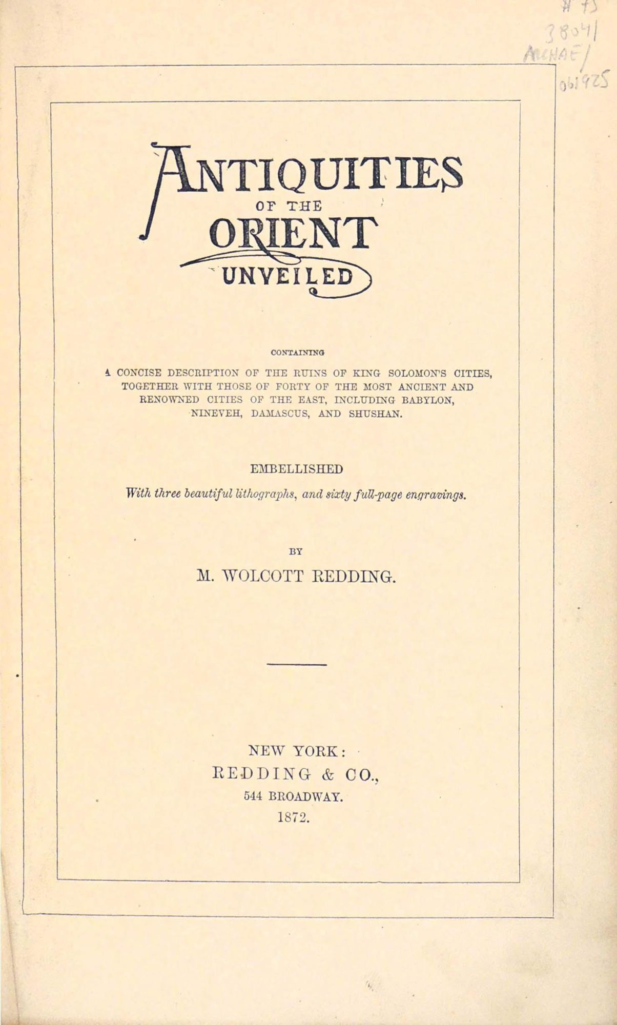New York: Redding & Co, 1872. Hardcover. Very Good. Hardcover. According to the author: "The aim of this work is to comprise in a convenient compass the result of all the important explorations and excavations made in the East - especially among the ruins of King Solomon's cities. To this end, this work has been made strictly descriptive and historical; but containing only enough of history to render the subject intelligible. By this plan a description of the ruins, as now seen of forty of the most famous cities of antiquity is given in the space of this volume; so that while it does not profess to be exhaustive, yet it contains an amount of highly interesteing and important information, that cannot otherwise be gained except by an examination of the works of many authors, and at a great expense in time and money" (preface).
