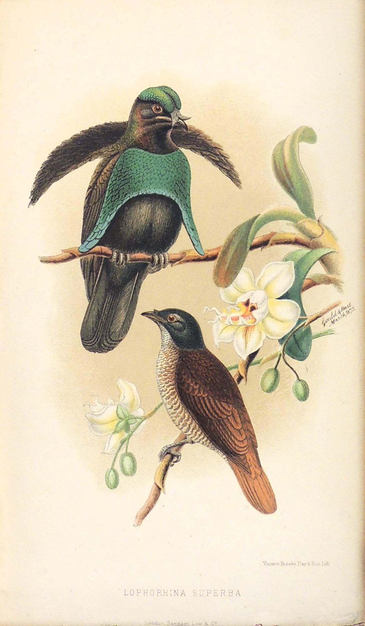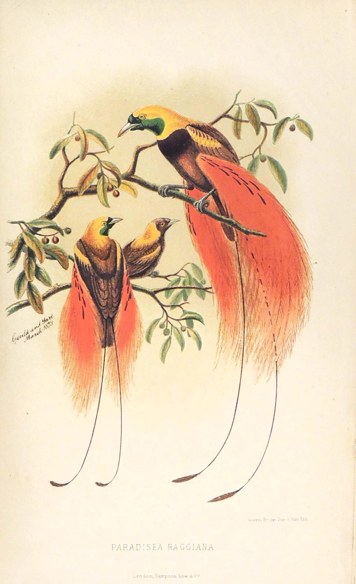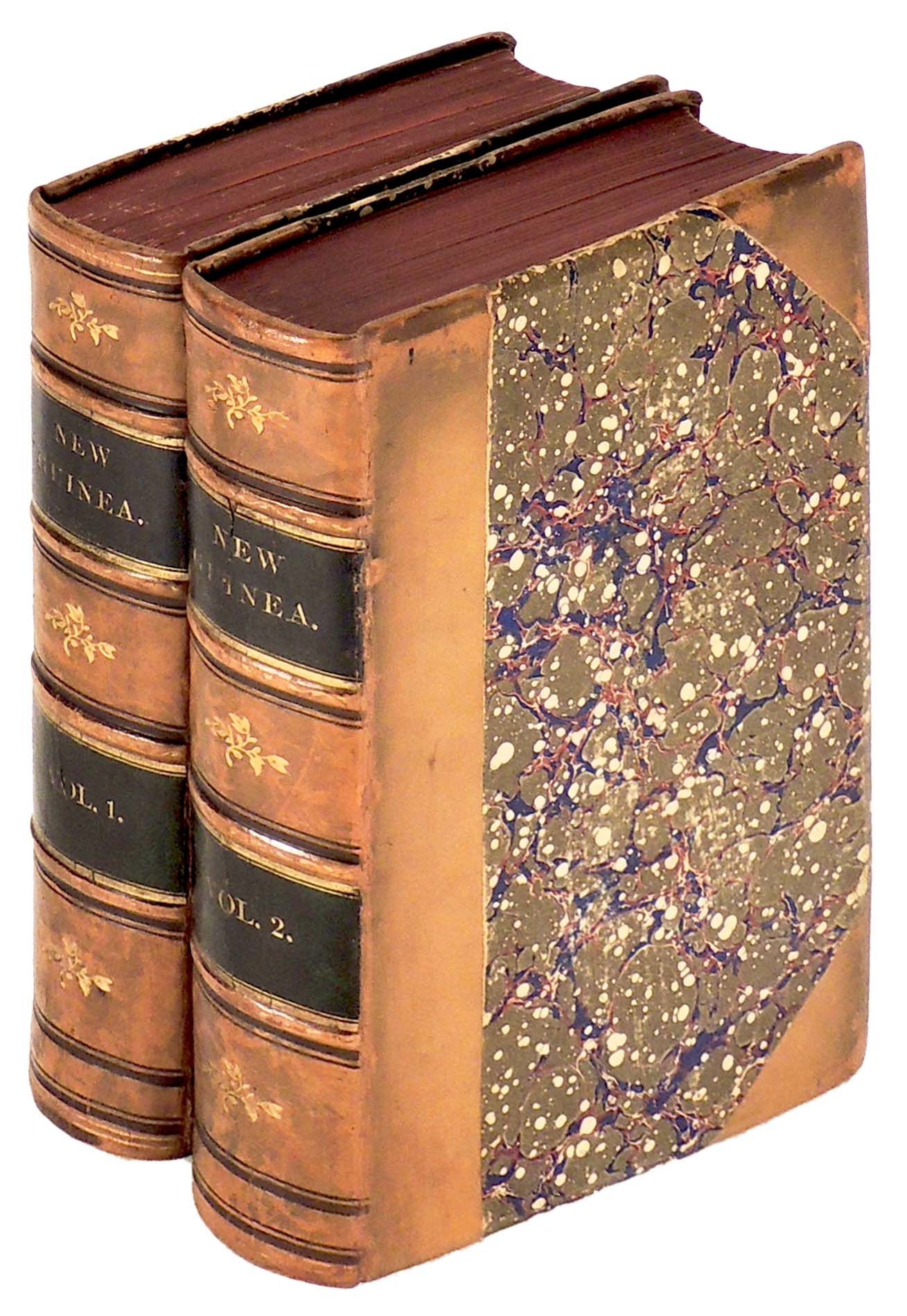 Includes four chromolithographs, many in text black and white illustrations, and one folding map to the rear of Volume II. Also includes a summery of observations; vocabulary of people of the Yule Island, Mansinam and Hatam, Yorke Island, and Moatta; notes on plants collected; and catalogues of plants and birds collected in 1875 - 1877. Bound in three quarter tan calf over marbled paper covered boards with black and gilt leather title and volume labels to spines. Matching marbled endpapers with full edges in red. Wear, cracking, and pulling to leather on spine and corners and rubbing to boards. Penned gift inscriptions dated 1881 to both volumes on front free endpapers. Occasional spots of foxing to both volumes, including map. Browning from glue to edges of tissue guards; although, some tissue guards are no longer present. Closed tears to edges of some pages including the folding map. Bindings remain strong; however, there are several internal splits between signatures in both volumes. Volume I, 424 pages; Volume II, 406 pages. SOPAC/062325.
