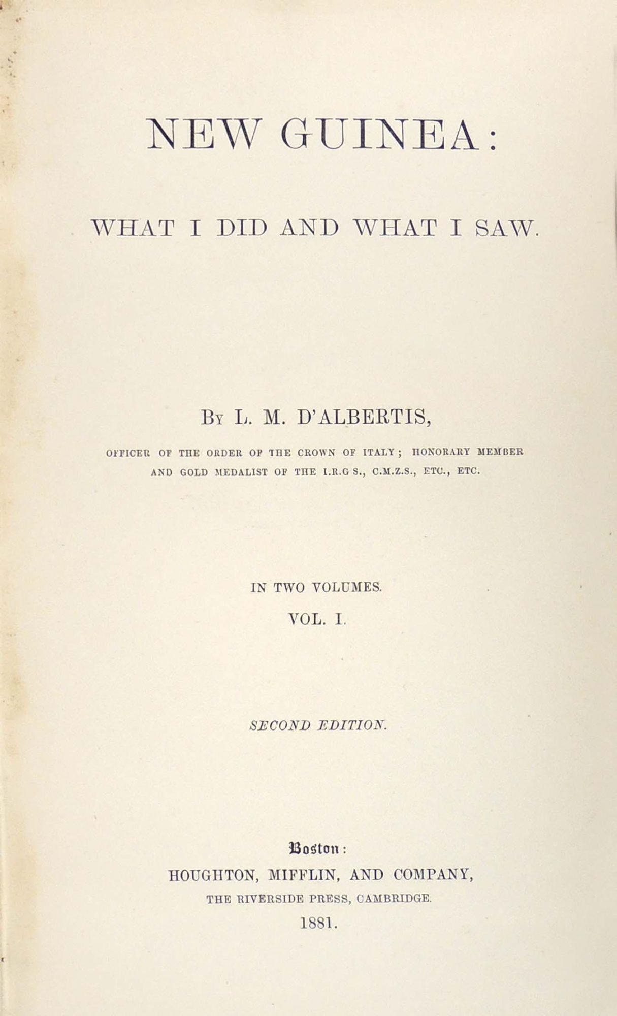 Boston: Houghton, Mifflin, and Company, 1881. Hardcover. Very Good. Hardcover. Second edition. Luigi Maria D'Albertis (1841 - 1901) was an Italian explorer, natural historian and ethnographic collector, who visited New Guinea several times beginning in 1870. He had a reputation for being unscrupulous and was charged with murder after his last expedition; although, he was acquitted (Encyclopedia of Australian Science and Innovation). According to accounts made by his servants and crew (which were accused by D'Albertis of mutiny and theft), and colleagues - during his expeditions he murdered many native peoples (unprovoked), murdered his own Chinese servants for refusing to follow his orders, stole ancestral remains and religious artifacts from natives, used dynamite to obtain aquatic specimens, and committed other savage acts. This first person account of his explorations contradicts many of these accusations and is more humanizing than these accounts would suggest possible.