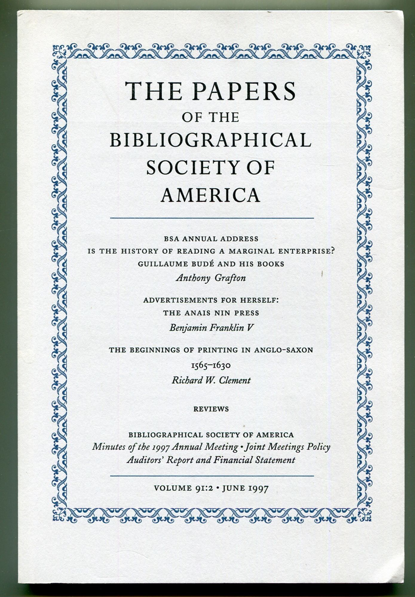 New York: Bibliographical Society of America, 1997. Softcover. Near Fine. Periodical. P. 140-279. Printed wrappers. A few tiny creases on wraps, near fine. Includes: "Is the History of Reading a Marginal Enterprise? Guillaume Bude and His Books," "Advertisements for Herself: The Anais Nin Press," "The Beginnings of Printing in Anglo-Saxon, 1565-1630," and book reviews.