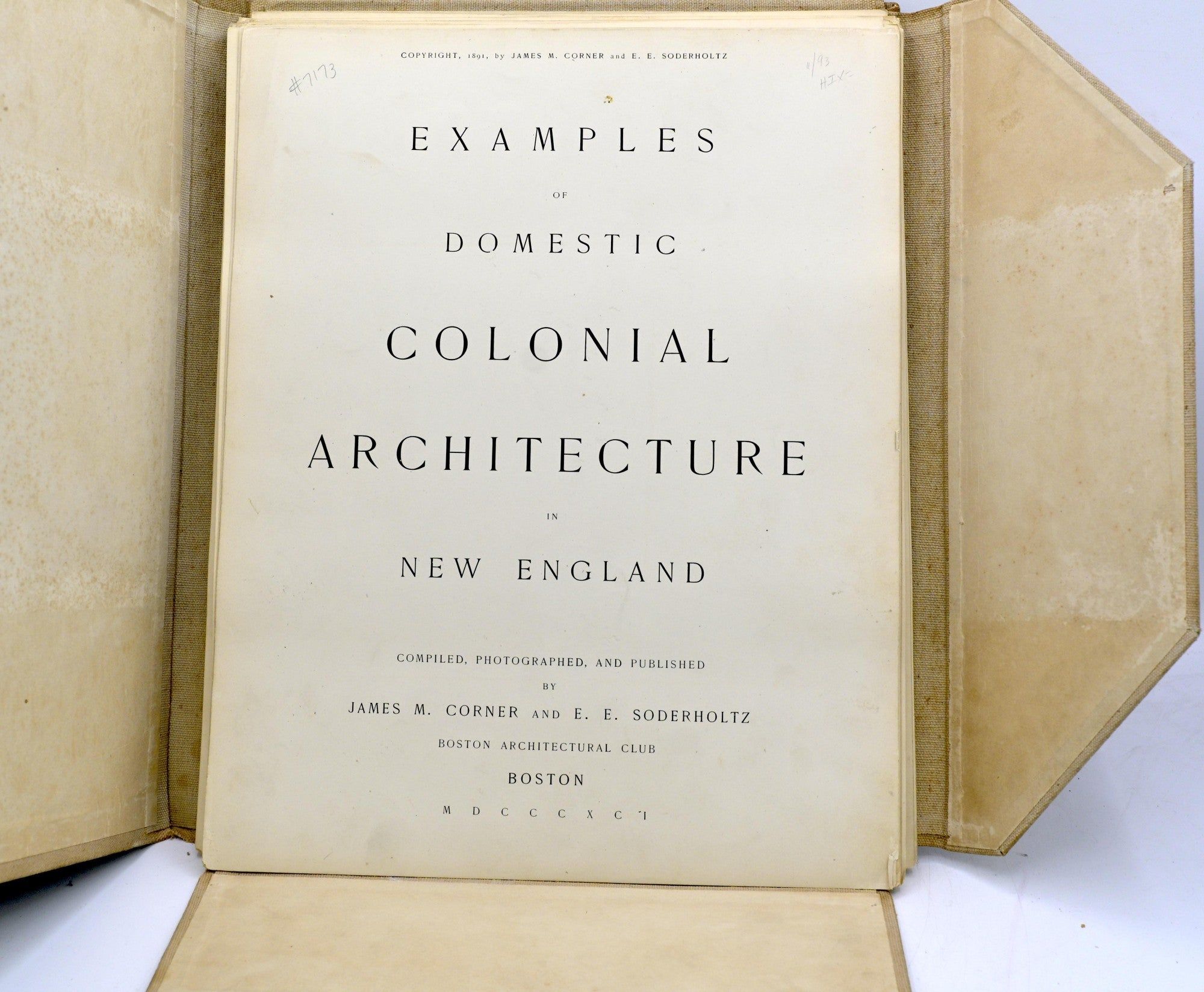 Boston: Boston Architectural Club, 1891. First Edition. Very Good+ binding. Worn Portfolio; with titling stamped on the upper board; lacking the tie; with 3 leaves of text followed by 50 photographic plates; there is a one and a half inch tear to the hinge of the portfolio; some foxing and a bit of loss to the front patedown; scattered foxing to the plates but overall they are bright. Very Good+ binding.
