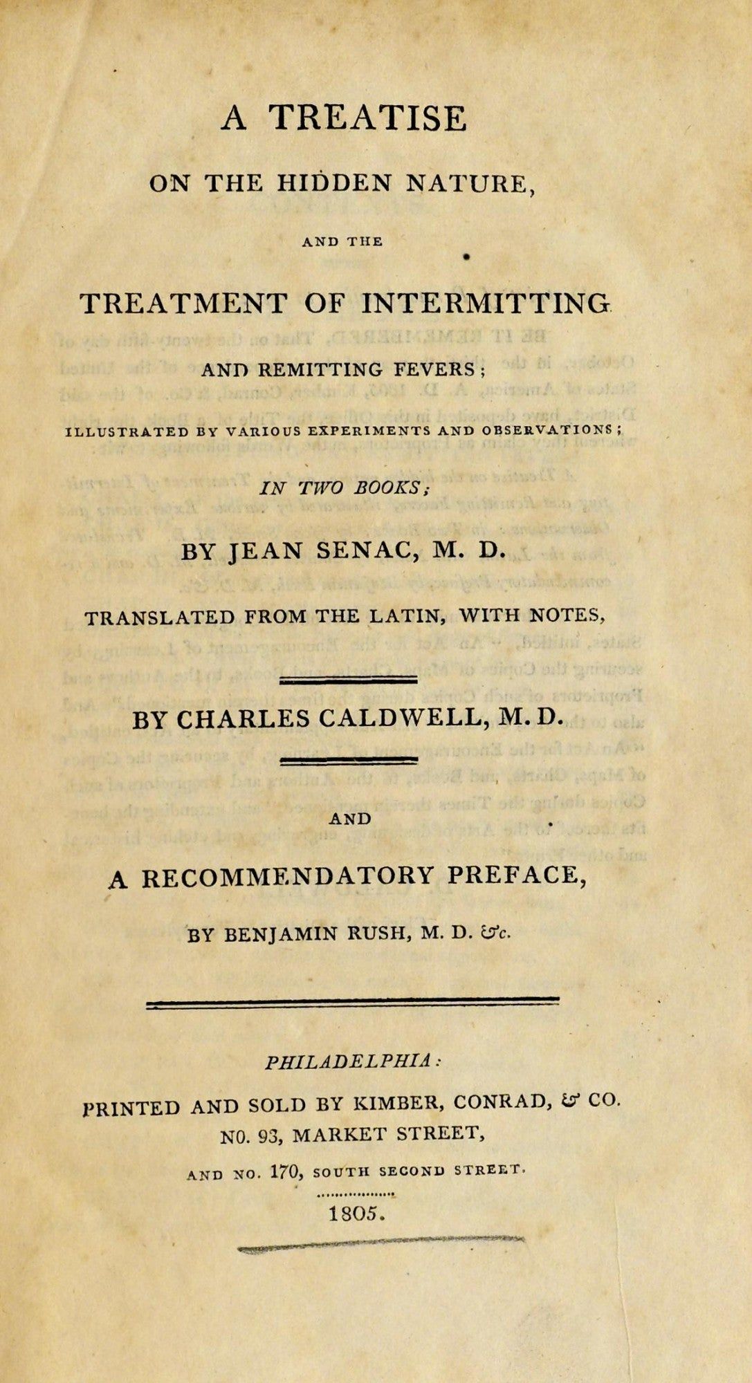 Philadelphia: Kimber, Conrad & Co, 1805. Full Leather. Very Good binding. 8vo.; in contemporary calf, with morocco title label; [xvi]. [1]. 2-299, followed by [1] page of ads; in two books which are through paginated; front joint is cracked but holding very well; there is a previous owner name on the front endpaper, and a charming Richmond bookseller’s label on the pastedown: “Sold: John R. Jones. Nearly opposite Eagle Tav. Richmond”.~~Senac’s treatise first appears in Latin 46 years previously; this is the first edition in English, translated with notes by Charles Cauldwell, and with “A Recommendatory Preface” by Benjamin Rush. Very Good binding.