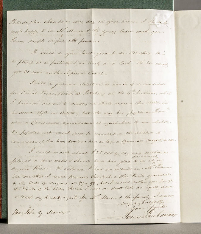 Wheatland near Lancaster, 27 June 1849. Letter. Creasing from mailing. Near Fine in a Near Fine clamshell box. Two-page AUTOGRAPH LETTER SIGNED "James Buchanan" on the recto and verso of the first leaf of a single folded sheet (7-3/4" x 9-5/8") to John Y. Mason, former Secretary of the Navy under President Polk, regarding the aging Dolley Madison (who would die about 2 weeks after this letter was written), plans for a visit, Pennsylvania politics, and possible investments in Virginia state bonds. Housed in a brown morocco-backed green cloth clamshell box (10-1/2" x 13"). Toward the end of her life, Dolley Madison (20 May 1768-12 July 1849), widow of the 4th president of the United States, lived in abject poverty. In 1849, Congress appropriated $20,000 toward the purchase of her husband's papers, and in her will, she appointed Buchanan, Mason, and Richard Smith as trustees. In this letter Buchanan, having recently served as Secretary of State under Polk writes to his fellow trustee. In part: "I returned from Washington last night, having done the best I could for Mrs. Madison. I found it difficult to persuade her that she ought not to have the whole premium placed in her hands at once, in which event it would have been of little or not service to her.... The old lady has greatly changed since I saw her last. She is now very feeble. It is my purpose, God willing, to pass the next winter at New Orleans.... It would do your heart good to see Walker. He is as plump as a partridge & as lively as a lark. He has already got 21 cases in the Supreme Court. Should a judicious selection be made of a Candidate for Canal Commissioner at Pittsburg on the 4th proximo, which I have no reason to doubt, we shall redeem this State, in handsome style in October; but the day has passed in Penn[sylvania] when a Democratic nomination is equivalent to an election. The popular will must now be consulted in the selection of Candidates: & this being done, we have as large a Democratic majority as ever." Interesting content with a typed transcript of the letter incorporated into a certificate of authenticity.