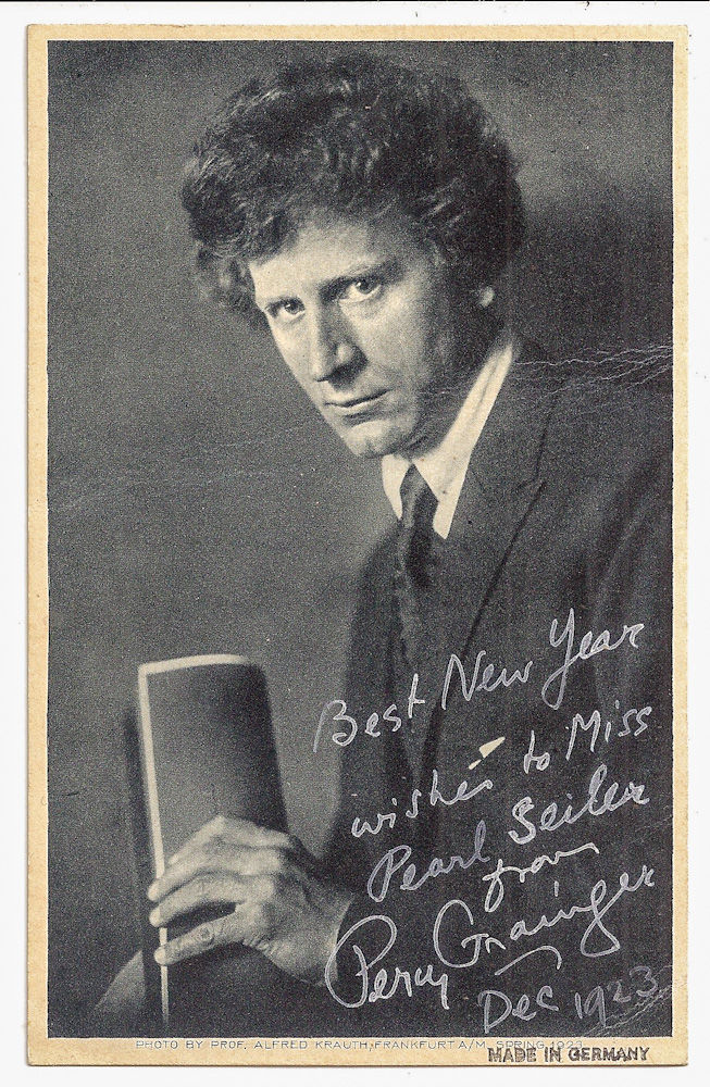 1923. Photograph. Rather faint horizontal crease above inscription. Near Fine. Postcard-sized photograph of the composer by Prof. Alfred Krauth of Frankfurt taken in the Spring of 1923 INSCRIBED and SIGNED by the subject in white ink: "Best New Year/wishes to Miss/Pearl Seiler/from/Percy Grainger/Dec. 1923." L. Pearl Seiler was a 1910 graduate of the New England Conservatory who later studied under Granger and who taught at Greensboro College in North Carolina.