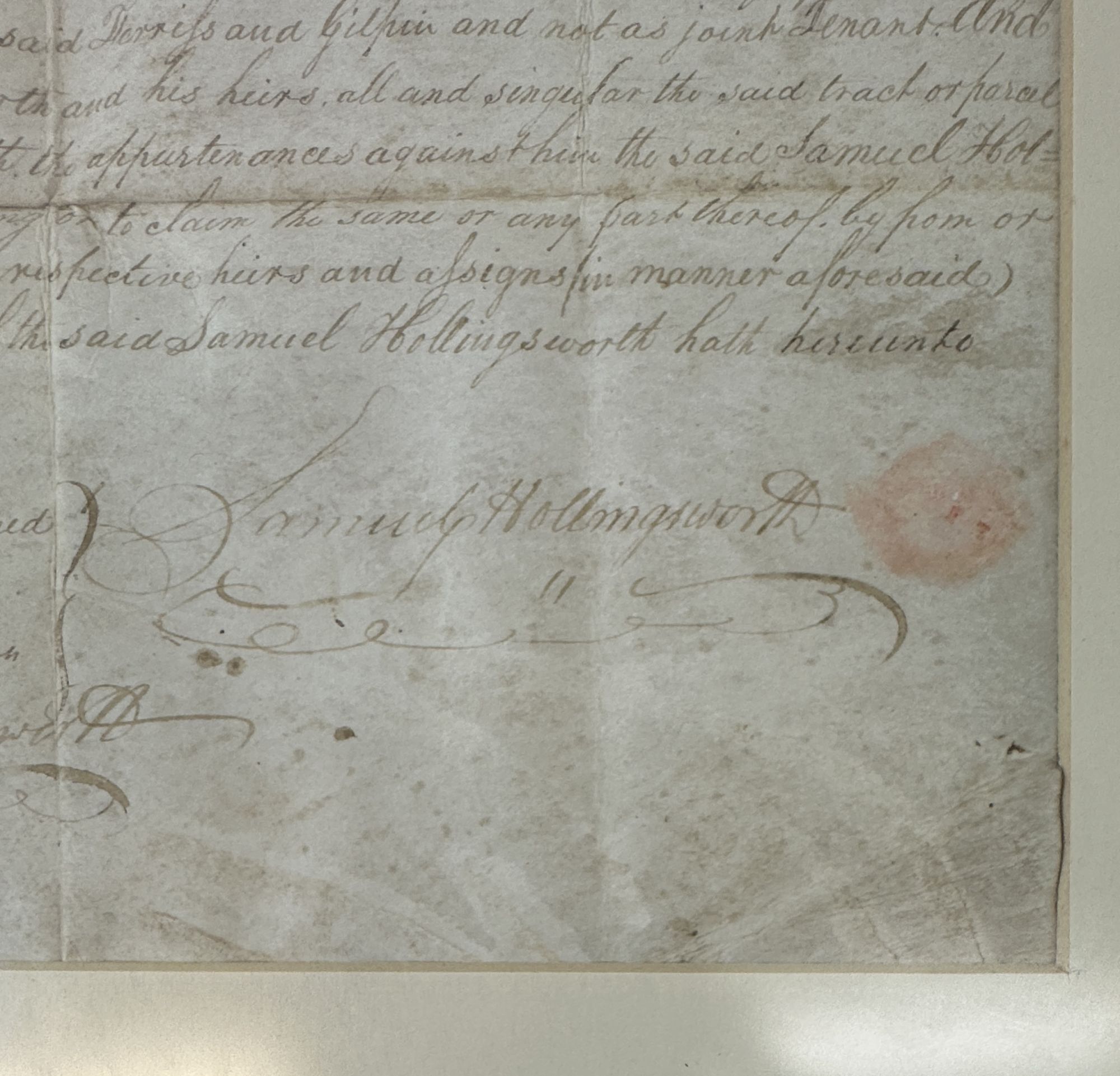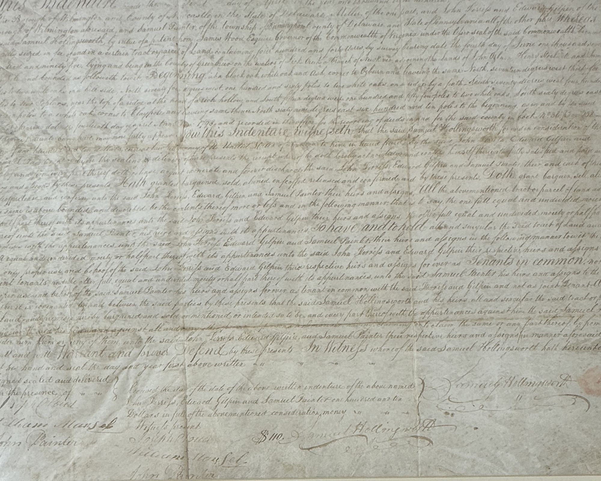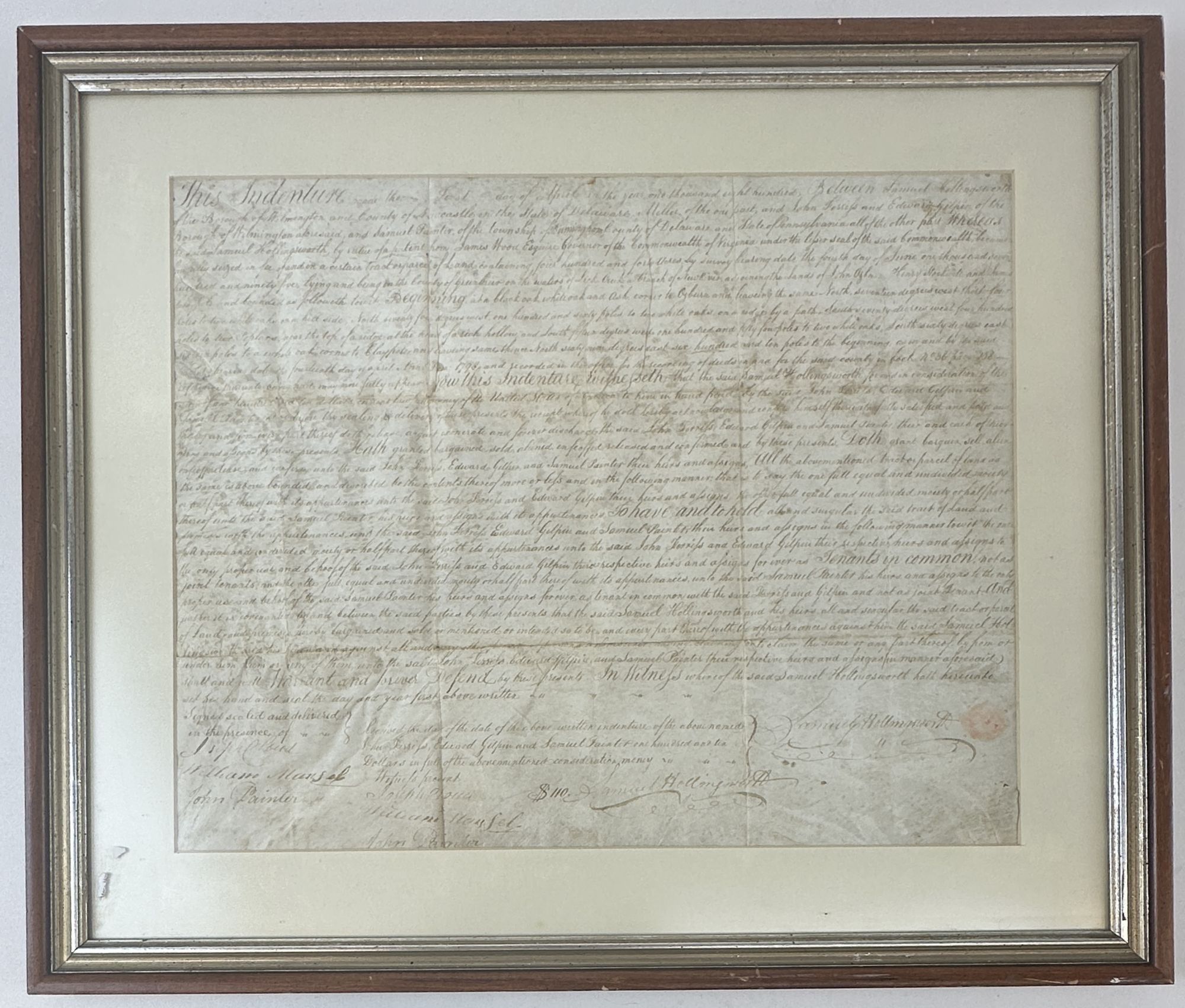 Delaware, 1800. In Good condition with age toning and scattered foxing. Signed by Samuel Hollingsworth. Frame has minor wear to the surface. Document measures 17 in. x 13.5 in. Frame measures 22 in. x 18.5 in. DM Consignment. Shelved at Rockville. 1400138. Special Collections.