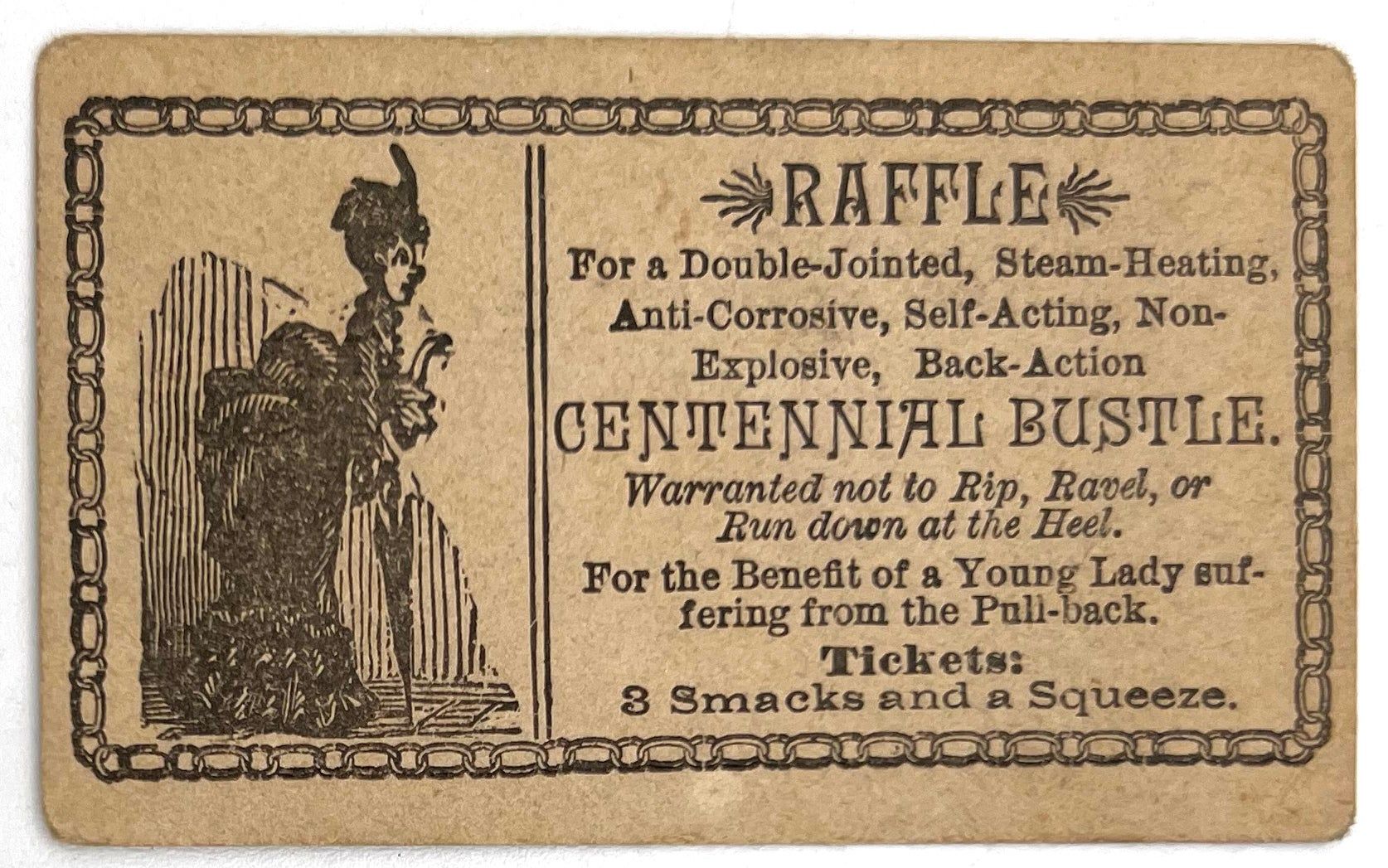 United States, 1875. Very good. Toned, a little dust soiling.. A saucy faux raffle ticket with an illustration of a woman with a massive bustle on the left. To the right, it reads, "RAFFLE For a Double-Jointed, Steam-Heating, Anti-Corrosive, Self-Acting, Non-Explosive, Back-Action CENTENNIAL BUSTLE. Warranted not to Rip, Ravel, or Run down at the Heel. For the Benefit of a Young Lady suffering from the Pull-back. Tickets: 3 Smacks and a Squeeze". Verso blank. Saucy, and makes fun of the latest trends in bustle sizes which had, in fairness, by the 1870s ballooned quite a bit. Measures approx. 1.75" by 3